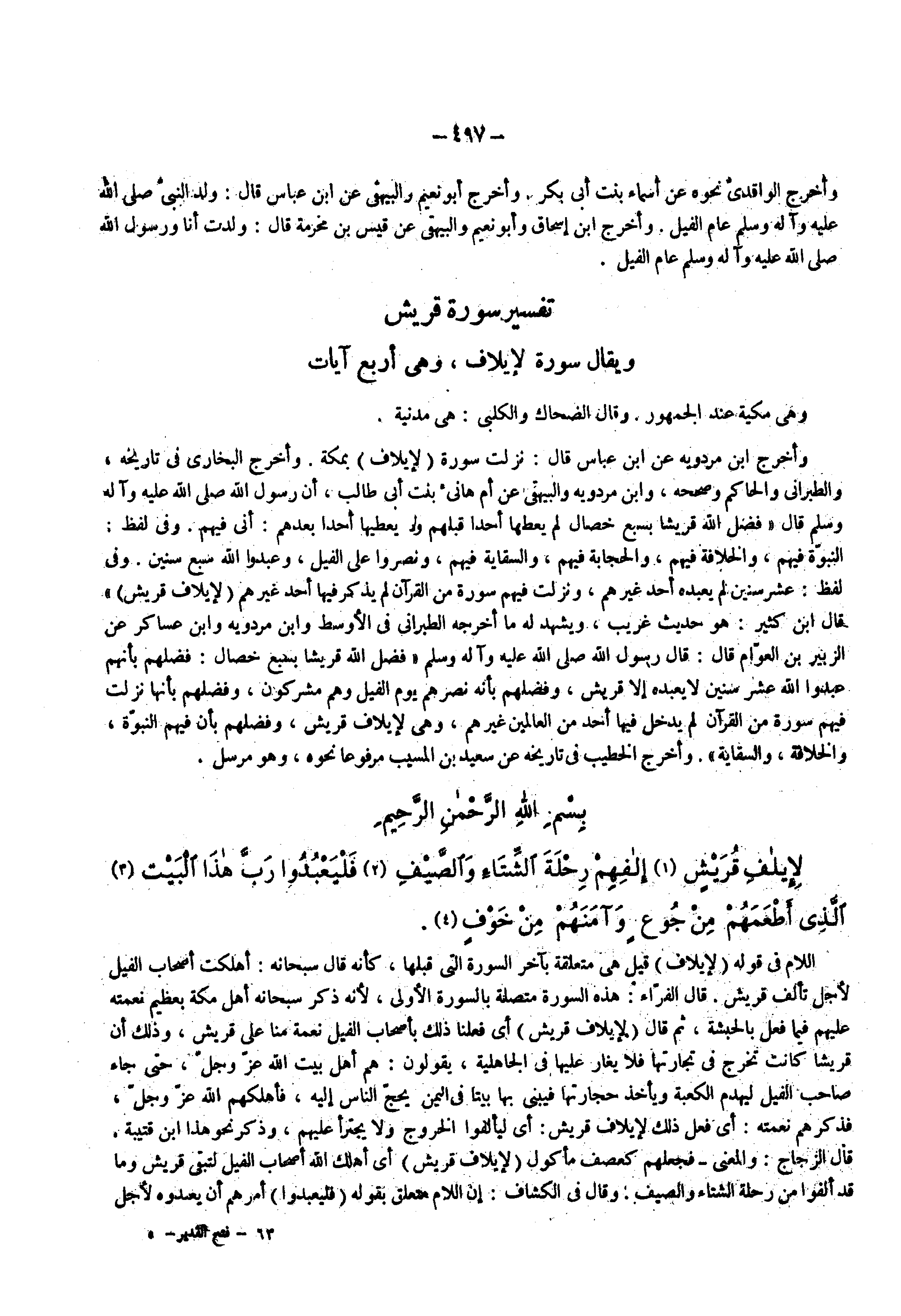 وأخرج ابن مردويه عن ابن عباس قال نزلت سورة لإيلاف بمكة وأخرج البخاري في تاريخه والطبراني والحاكم وصححه وابن مردويه والبيهقي عن أم هانىء بنت أبي طالب أن رسول الله صلى الله عليه واله وسلم قال فضل الله قريشا بسبع خصال لم يعطها أحدا قبلهم ولا يعطيها أحدا بعدهم أني فيهم وفي لفظ النبوة فيهم والخلافة فيهم والحجابة فيهم والسقاية فيهم ونصروا على الفيل وعبدوا الله سبع سنين وفي لفظ عشر سنين لم يعبده أحد غيرهم ونزلت فيهم سورة من القران لم يذكر فيها أحد غيرهم ) لإيلاف قريش ( قال ابن كثير هو حديث غريب ويشهد له ما أخرجه الطبراني في الأوسط وابن مردويه وابن عساكر عن الزبير بن العوام قال قال رسول الله صلى الله عليه واله وسلم فضل الله قريشا بسبع خصال فضلهم بأنهم عبدوا الله عشر سنين لا يعبده إلا قريش وفضلهم بأنه نصرهم يوم الفيل وهم مشركون وفضلهم بأنها نزلت فيهم سورة من القران لم يدخل فيها أحد من العالمين غيرهم وهي لإيلاف قريش وفضلهم بأن فيهم النبوة والخلافة والسقاية وأخرج الخطيب في تاريخه عن سعيد بن المسيب مرفوعا نحوه وهو مرسل بسم الله الرحمن الرحيم