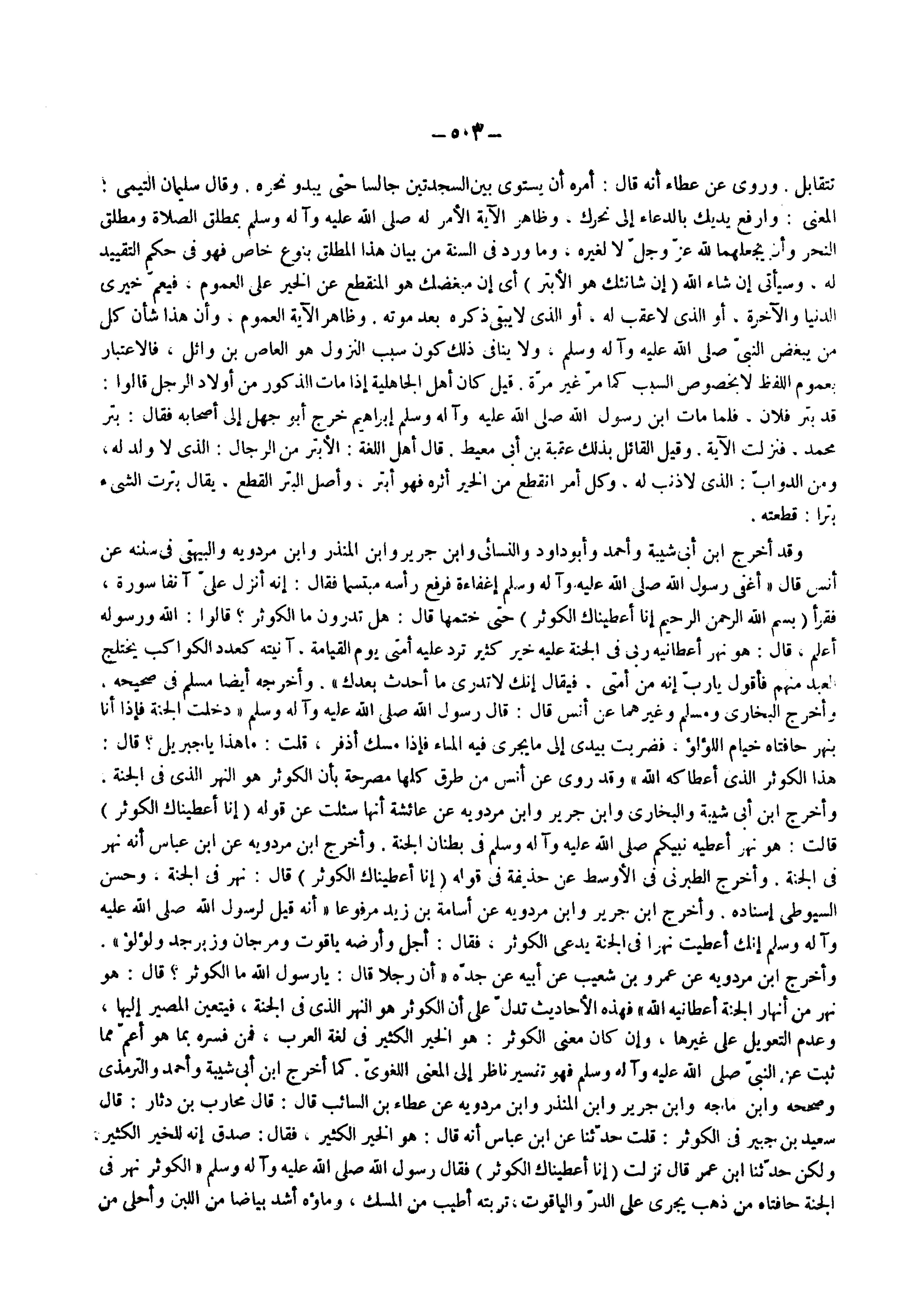 وقد أخرج ابن أبي شيبة وأحمد وأبو داود والنسائي وابن جرير وابن المنذر وابن مردويه والبيهقي في سننه عن أنس قال أغفى رسول الله صلى الله عليه واله وسلم إغفاءه فرفع رأسه مبتسما فقال إنه أنزل علي انفا سورة فقرأ ) بسم الله الرحمن الرحيم ( ) إنا أعطيناك الكوثر ( حتى ختمها قال هل تدرون ما الكوثر قالوا الله ورسوله أعلم قال هو نهر أعطانيه ربي في الجنة عليه خير كثير ترد عليه أمتي يوم القيامة انيته كعدد الكواكب يختلج العبد منهم فأقول يا رب إنه من أمتي فيقال إنك لا تدري ما أحدث بعدك وأخرجه أيضا مسلم في صحيحه وأخرج البخاري ومسلم وغيرهما عن أنس قال قال رسول الله صلى الله عليه واله وسلم دخلت الجنة فإذا أنا بنهر حافتاه خيام اللؤلؤ فضربت بيدي إلى ما يجري فيه الماء فإذا مسك أذفر قلت ما هذا يا جبريل قال هذا الكوثر الذي أعطاكه الله وقد روى عن أنس من طرق كلها مصرحة بأن الكوثر هو النهر الذي في الجنة وأخرج ابن أبي شيبة والبخاري وابن جرير وابن مردويه عن عائشة أنها سئلت عن قوله ) إنا أعطيناك الكوثر ( قالت هو نهر أعطيه نبيكم صلى الله عليه واله وسلم في بطنان الجنة وأخرج ابن مردويه عن ابن عباس أنه نهر في الجنة وأخرج الطبراني في الأوسط عن حذيفة في قوله ) إنا أعطيناك الكوثر ( قال نهر في الجنة وحسن السيوطي إسناده وأخرج ابن جرير وابن مردويه عن أسامة بن زيد مرفوعا أنه قيل رسول الله صلى الله عليه واله وسلم إنك أعطيت نهرا في الجنة يدعى الكوثر فقال أجل وأرضه ياقوت ومرجان وزبرجد ولؤلؤ وأخرج ابن مردويه عن عمرو بن شعيب عن أبيه عن جده أن رجلا قال يا رسول الله ما الكوثر قال هو نهر من أنهار الجنة أعطانيه الله فهذه الأحاديث تدل على أن الكوثر هو النهر الذي في الجنة فيتعين المصير إليها وعدم التعويل على غيرها وإن كان معنى الكوثر هو الخير الكثير في لغة العرب فمن فسره بما هو أعم مما ثبت عن النبي صلى الله عليه واله وسلم فهو تفسير ناظر إلى المعنى اللغوي كما أخرج ابن أبي شيبة وأحمد والترمذي وصححه وابن ماجه وابن جرير وابن المنذر وابن مردويه عن عطاء بن السائب قال قال محارب بن دثار قال سعيد بن جبير في الكوثر قلت حدثنا عن ابن عباس أنه قال هو الخير الكثير فقال صدق إنه للخير الكثير ولكن حدثنا ابن عمر قال نزلت ) إنا أعطيناك الكوثر ( فقال رسول الله صلى الله عليه واله وسلم الكوثر نهر في الجنة حافتاه من ذهب يجري على الدر والياقوت تربته أطيب من المسك وماؤه أشد بياضا من اللبن وأحلى من
