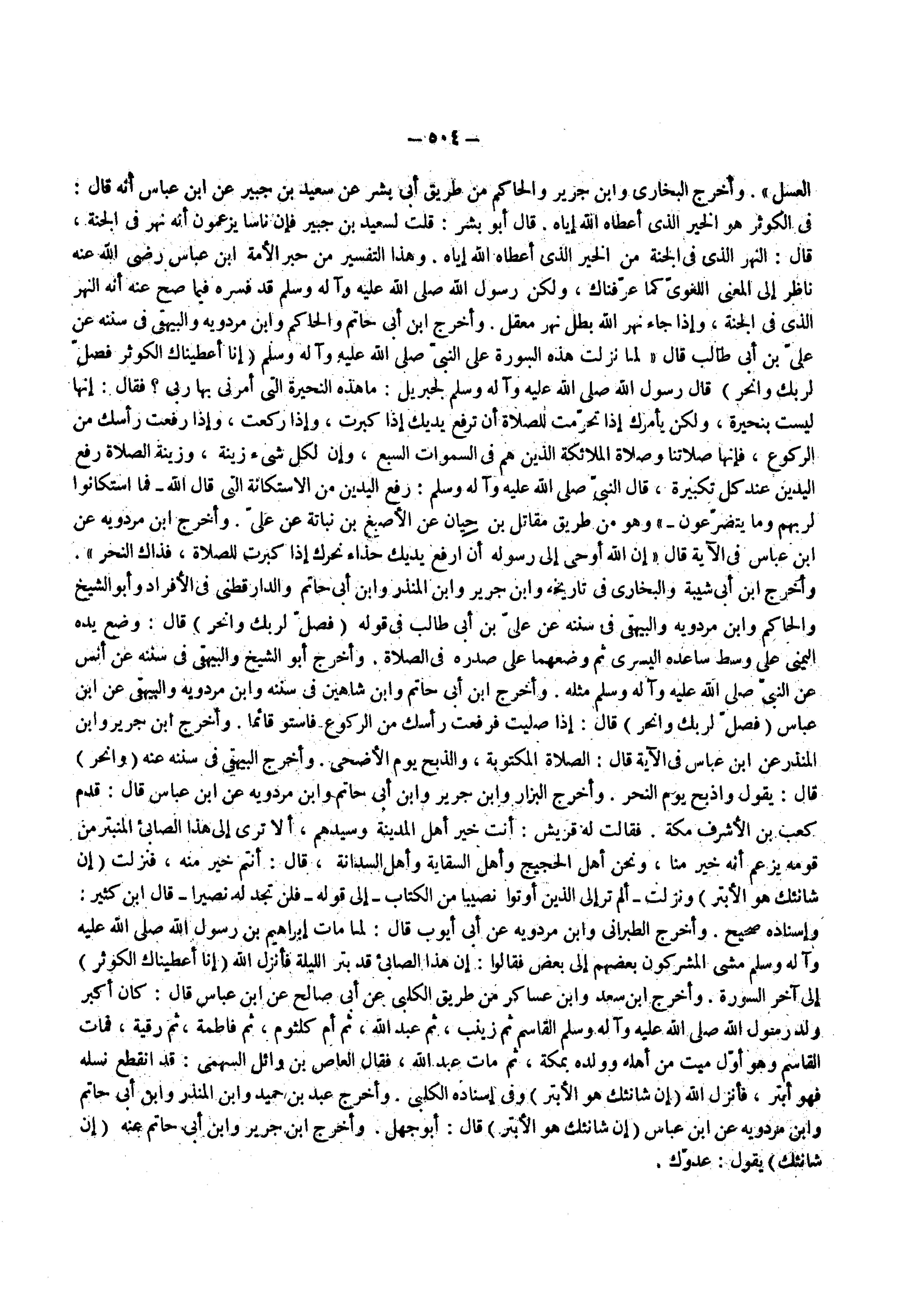 العسل وأخرج البخاري وابن جرير والحاكم من طريق أبي بشر عن سعيد بن جبير عن ابن عباس أنه قال في الكوثر هو الخير الذي أعطاه الله إياه قال أبو بشر قلت لسعيد بن جبير فإن ناسا يزعمون أنه نهر في الجنة قال النهر الذي في الجنة من الخير الذي أعطاه الله إياه وهذا التفسير من حبر الأمة ابن عباس رضي الله عنه ناظر إلى المعنى اللغوي كما عرفناك ولكن رسول الله صلى الله عليه واله وسلم قد فسره فيما صح عنه أنه النهر الذي في الجنة وإذا جاء نهر الله بطل نهر معقل وأخرج ابن أبي حاتم والحاكم وابن مردويه والبيهقي في سننه عن علي بن أبي طالب قال لما نزلت هذه السورة على النبي صلى الله عليه واله وسلم ) إنا أعطيناك الكوثر فصل لربك وانحر ( قال رسول الله صلى الله عليه واله وسلم لجبريل ما هذه النحيرة التي أمرني بها ربي فقال إنها ليست بنحيرة ولكن يأمرك إذا تحرمت للصلاة أن ترفع يديك إذا كبرت وإذا ركعت وإذا رفعت رأسك من الركوع فإنها صلاتنا وصلاة الملائكة الذين هم في السموات السبع وإن لكل شيء زينة وزينة الصلاة رفع اليدين عند كل تكبيرة قال النبي صلى الله عليه واله وسلم رفع اليدين من الاستكانة التي قال الله فما استكانوا لربهم وما يتضرعون وهو من طريق مقاتل بن حيان عن الأصبغ بن نباتة عن على وأخرج ابن مردويه عن ابن عباس في الاية قال إن الله أوحى إلى رسوله أن أرفع يديك حذاء نحرك إذا كبرت للصلاة فذاك النحر وأخرج ابن أبي شيبة والبخاري في تاريخه وابن جرير وابن المنذر وابن أبي حاتم والدارقطني في الأفراد وأبو الشيخ والحاكم وابن مردويه والبيهقي في سننه عن علي بن أبي طالب في قوله ) فصل لربك وانحر ( قال وضع يده اليمنى على وسط ساعده اليسرى ثم وضعهما على صدره في الصلاة وأخرج أبو الشيخ والبيهقي في سننه عن أنس عن النبي صلى الله عليه واله وسلم مثله وأخرج ابن أبي حاتم وابن شاهين في سننه وابن مردويه والبيهقي عن ابن عباس ) فصل لربك وانحر ( قال إذا صليت فرفعت رأسك من الركوع فاستو قائما وأخرج ابن جرير وابن المنذر عن ابن عباس في الاية قال الصلاة المكتوبة والذبح يوم الأضحى وأخرج البيهقي في سننه عنه ) وانحر ( قال يقول واذبح يوم النحر وأخرج البزار وابن جرير وابن أبي حاتم وابن مردويه عن ابن عباس قال قدم كعب بن الأشرف مكة فقالت له قريش أنت خير أهل المدينة وسيدهم ألا ترى إلى هذا الصابىء المنبتر من قومه يزعم أنه خير منا ونحن أهل الحجيج وأهل السقاية وأهل السدانة قال أنتم خير منه فنزلت ) إن شانئك هو الأبتر ( ونزلت ألم تر إلى الذين أوتوا نصيبا من الكتاب إلى قوله فلن تجد له نصيرا قال ابن كثير وإسناده صحيح وأخرج الطبرني وابن مردويه عن أبي أيوب قال لما مات إبراهيم بن رسول الله صلى الله عليه واله وسلم مشى المشركون بعضهم إلى بعض فقالوا إن هذا الصائي قد بتر الليلة فأنزل الله ) إنا أعطيناك الكوثر ( إلى اخر السورة وأخرج ابن سعد وابن عساكر من طريق الكلبي عن أبي صالح عن ابن عباس قال كان أكبر ولد رسول الله صلى الله عليه واله وسلم القاسم ثم زينب ثم عبد الله ثم أم كلثوم ثم فاطمة ثم رقية فمات القاسم وهو أول ميت من أهله وولده بمكة ثم مات عبد الله فقال العاص بن وائل السهمي قد انقطع نسله فهو أبتر فأنزل الله ) إن شانئك هو الأبتر ( وفي إسناده الكلبي وأخرج عبد بن حميد وابن المنذر وابن أبي حاتم وابن مردويه عن ابن عباس ) إن شانئك هو الأبتر ( قال أبو جهل وأخرج ابن جرير وابن أبي حاتم عنه ) إن شانئك ( يقول عدوك