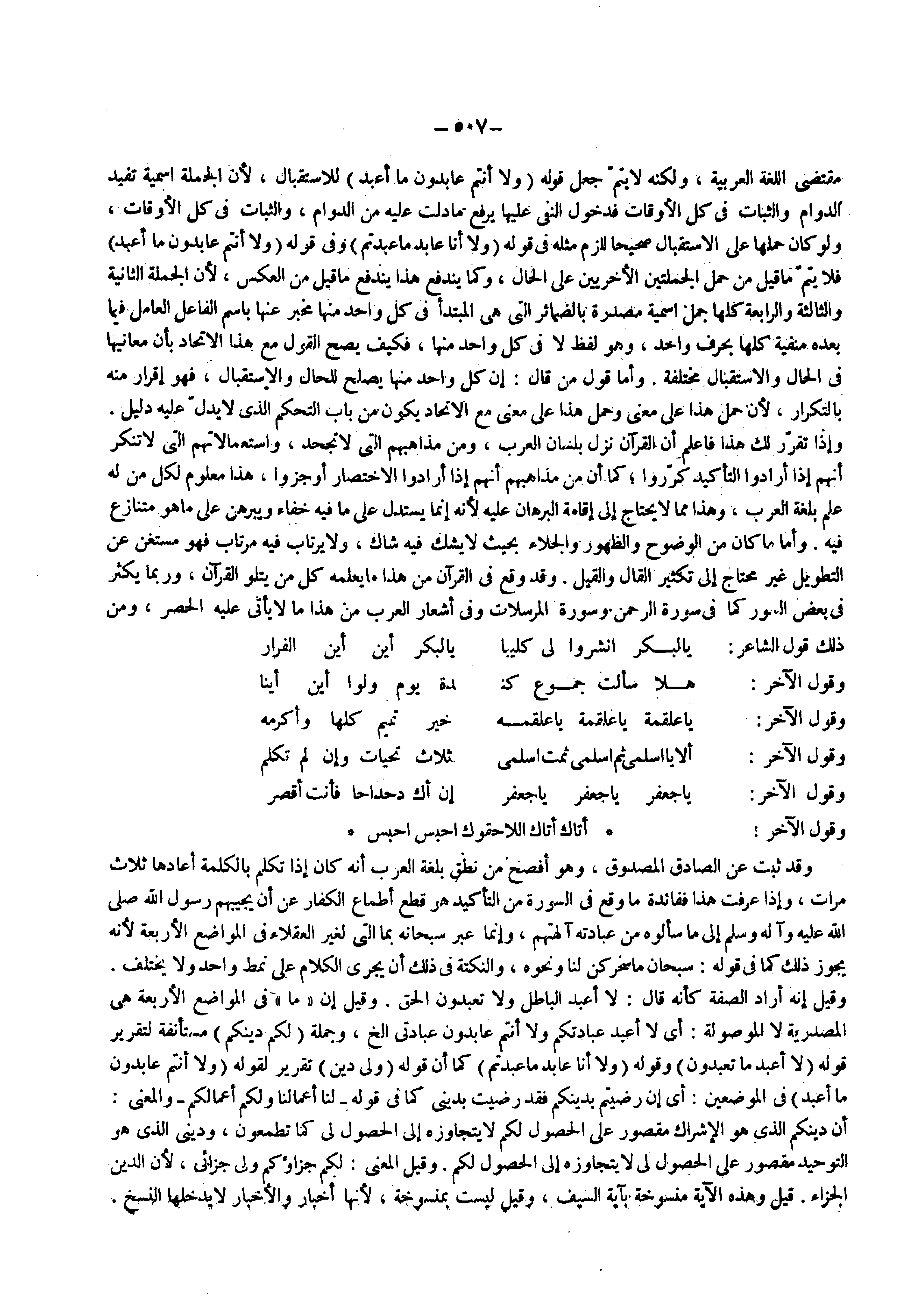 مقتضى اللغة العربية ولكنه لا يتم جعل قوله ) ولا أنتم عابدون ما أعبد ( للاستقبال لأن الجملة اسمية تفيد الدوام والثبات في كل الأوقات فدخول النفى عليها يرفع ما دلت عليه من الدوام والثبات في كل الأوقات ولو كان حملها على الاستقبال صحيحا للزم مثله في قوله ) ولا أنا عابد ما عبدتم ( وفي قوله ) ولا أنتم عابدون ما أعبد ( فلا يتم ما قيل من حمل الجملتين الأخريين على الحال وكما يندفع هذا يندفع ما قيل من العكس لأن الجملة الثانية والثالثة والرابعة كلها جمل اسمية مصدرة بالضمائر التي هي المتبدأ في كل واحد منها مخبر عنها باسم الفاعل العامل فيما بعده منفية كلها بحرف واحد وهو لفظ لا في كل واحد منها فكيف يصح القول مع هذا الاتحاد بأن معانيها في الحال والاستقبال مختلفة وأما قول من قال إن كل واحد منها يصلح للحال والاستقبال فهو إقرار منه بالتكرار لأن حمل هذا على معنى وحمل هذا على معنى مع الاتحاد يكون من باب التحكم الذي لا يدل عليه دليل وإذا تقرر لك هذا فاعلم أن القرآن نزل بلسان العرب ومن مذاهبهم التي لا تجحد واستعمالاتهم التي لا تنكر أنهم إذا أرادوا التأكيد كرروا كما أن من مذاهبهم أنهم إذا أرادوا الاختصار أوجزوا هذا معلوم لكل من له علم بلغة العرب وهذا مما لا يحتاج إلى إقامة البرهان عليه لأنه إنما يستدل على مافيه خفاء ويبرهن على ماهو متنازع فيه وأما ما كان من الوضوح والظهور والجلاء بحيث لا يشك فيه شاك ولا يرتاب فيه مرتاب فهو مستغن عن التطويل غير محتاج إلى تكثير القال والقيل وقد وقع في القران من هذا ما يعلمه كل من يتلو القران وربما يكثر في بعض السور كما في سورة الرحمن وسورة المرسلات وفي أشعار العرب من هذا ما لا يأتي عليه الحصر ومن ذلك قول الشاعر بالبكر انشروا لي كليبا