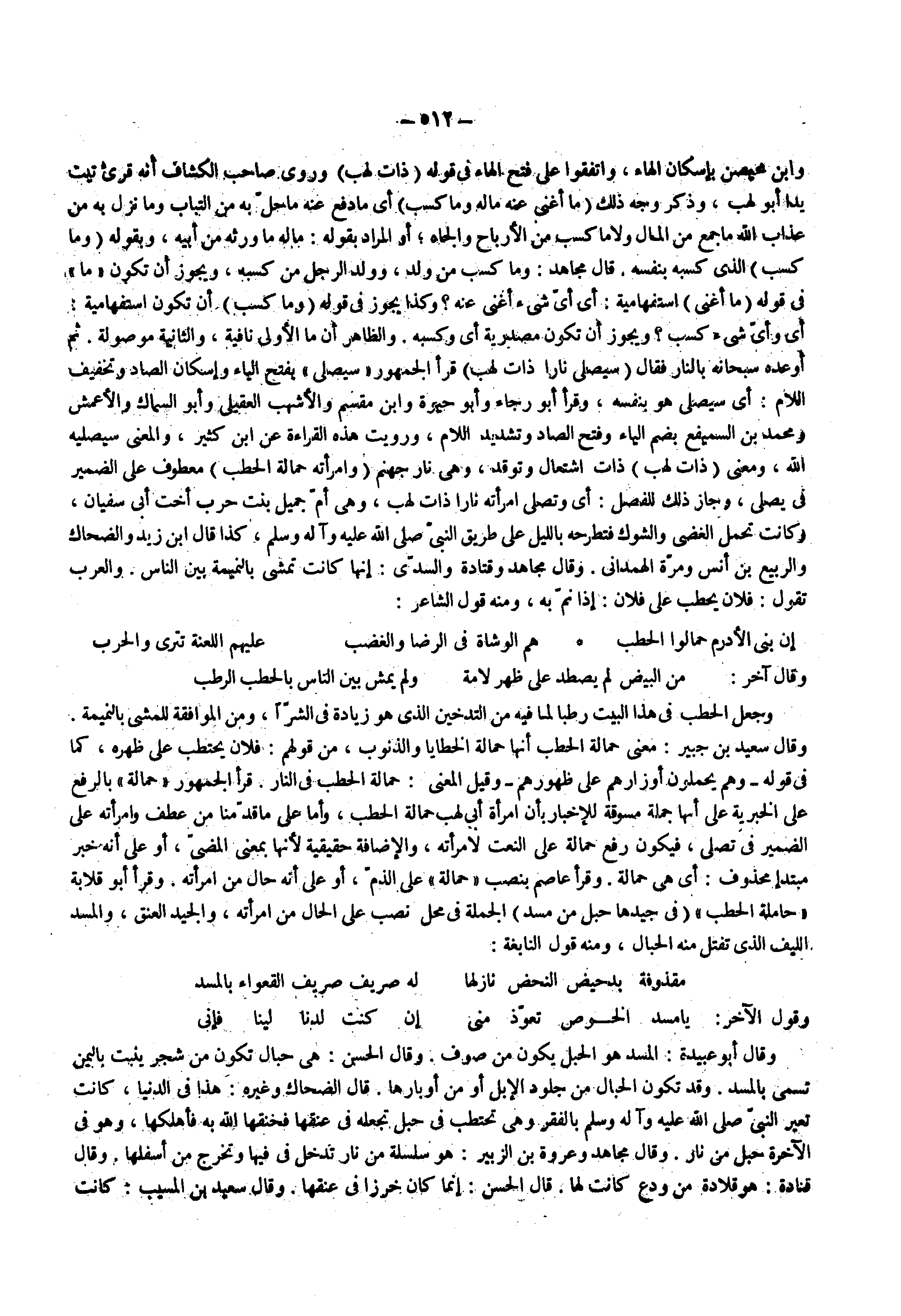 ) وامرأته حمالة الحطب ( معطوف على الضمير في يصلى وجاز ذلك للفصل أي وتصلى امرأته نارا ذات لهب وهي أم جميل بنت حرب أخت أبي سفيان وكانت تحمل الغضى والشوك فتطرحه بالليل على طريق النبي صلى الله عليه واله وسلم كذا قال ابن زيد والضحاك والربيع بن أنس ومرة الهمداني وقال مجاهد وقتادة والسدى إنها كانت تمشي بالنميمة بين الناس والعرب تقول فلان يحطب على فلان إذا نم به ومنه قول الشاعر إن بني الأدرم حمالوا الحطب