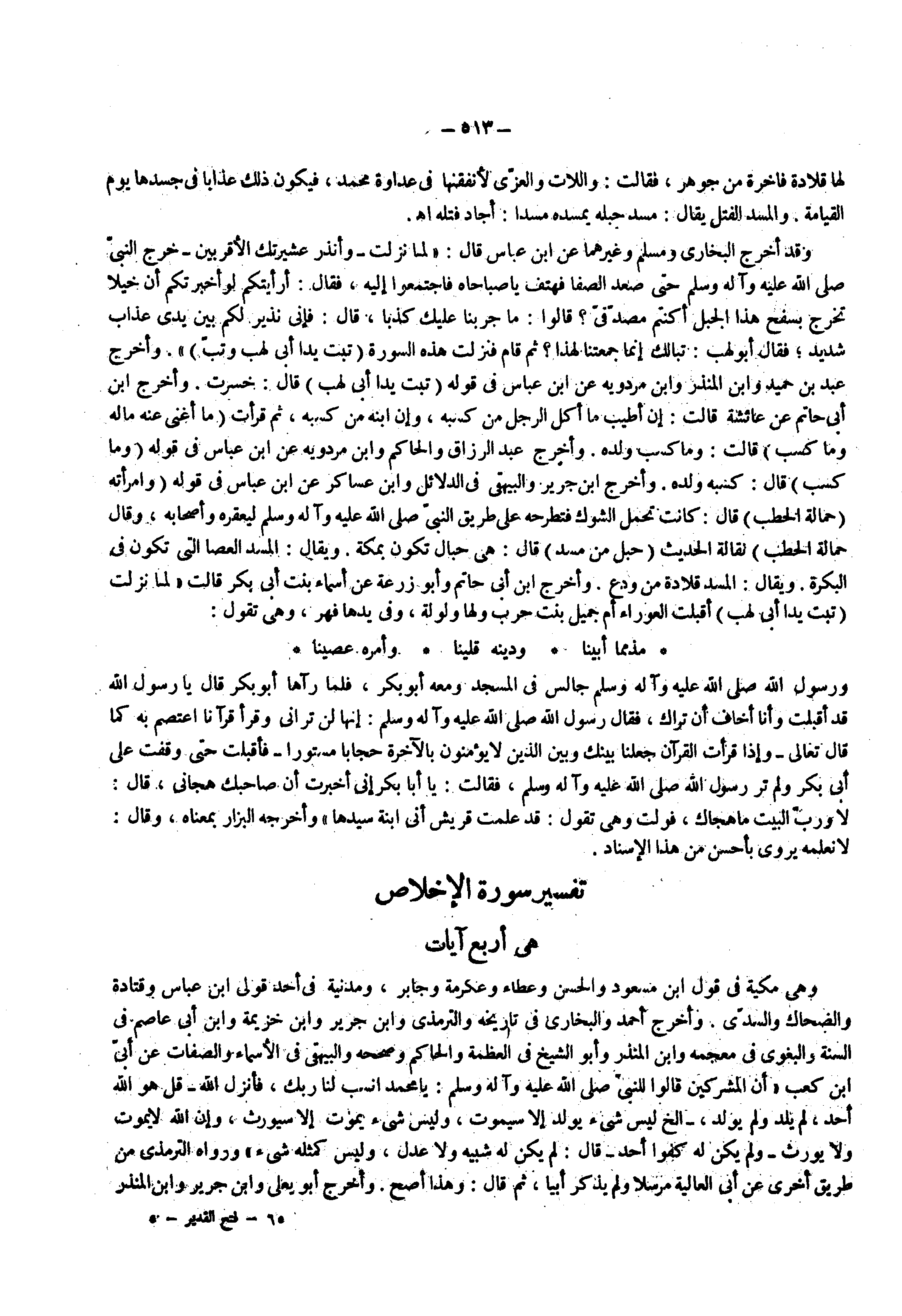 وقد أخرج البخاري ومسلم وغيرهما عن ابن عباس قال لما نزلت وأنذر عشيرتك الأقربين خرج النبي صلى الله عليه واله وسلم حتى صعد الصفا فهتف يا صباحاه فاجتمعوا إليه فقال أرأيتكم لو أخبرتكم أن خيلا تخرج بسفح هذا الجبل أكنتم مصدقي قالوا ما جربنا عليك كذبا قال فإني نذير لكم بين يدي عذاب شديد فقال أبو لهب تبا لك إنما جمعتنا لهذا ثم قام فنزلت هذه السورة ) تبت يدا أبي لهب وتب ( وأخرج عبد بن حميد وابن المنذر وابن مردويه عن ابن عباس في قوله ) تبت يدا أبي لهب ( قال خسرت وأخرج ابن أبي حاتم عن عائشة قالت إن أطيب ما أكل الرجل من كسبه وإن ابنه من كسبه ثم قرأت ) ما أغنى عنه ماله وما كسب ( قالت وما كسب ولده وأخرج عبد الرزاق والحاكم وابن مردويه عن ابن عباس في قوله ) وما كسب ( قال كسبه ولده وأخرج ابن جرير والبيهقي في الدلائل وابن عساكر عن ابن عباس في قوله ) وامرأته حمالة الحطب ( قال كانت تحمل الشكوك فتطرحه على طريق النبي صلى الله عليه واله وسلم ليعفره وأصحابه وقال حمالة الحطب نقالة الحديث ) حبل من مسد ( قال هي حبال تكون بمكة ويقال المسد العصا التي تكون في البكرة ويقال المسد قلادة من ودع وأخرج ابن أبي حاتم وأبو زرعة عن أسماء بنت أبي بكر قالت لما نزلت ) تبت يدا أبي لهب ( أقبلت العوراء أم جميل بنت حرب ولها ولولة وفي يدها فهر وهي تقول مذمما أبينا