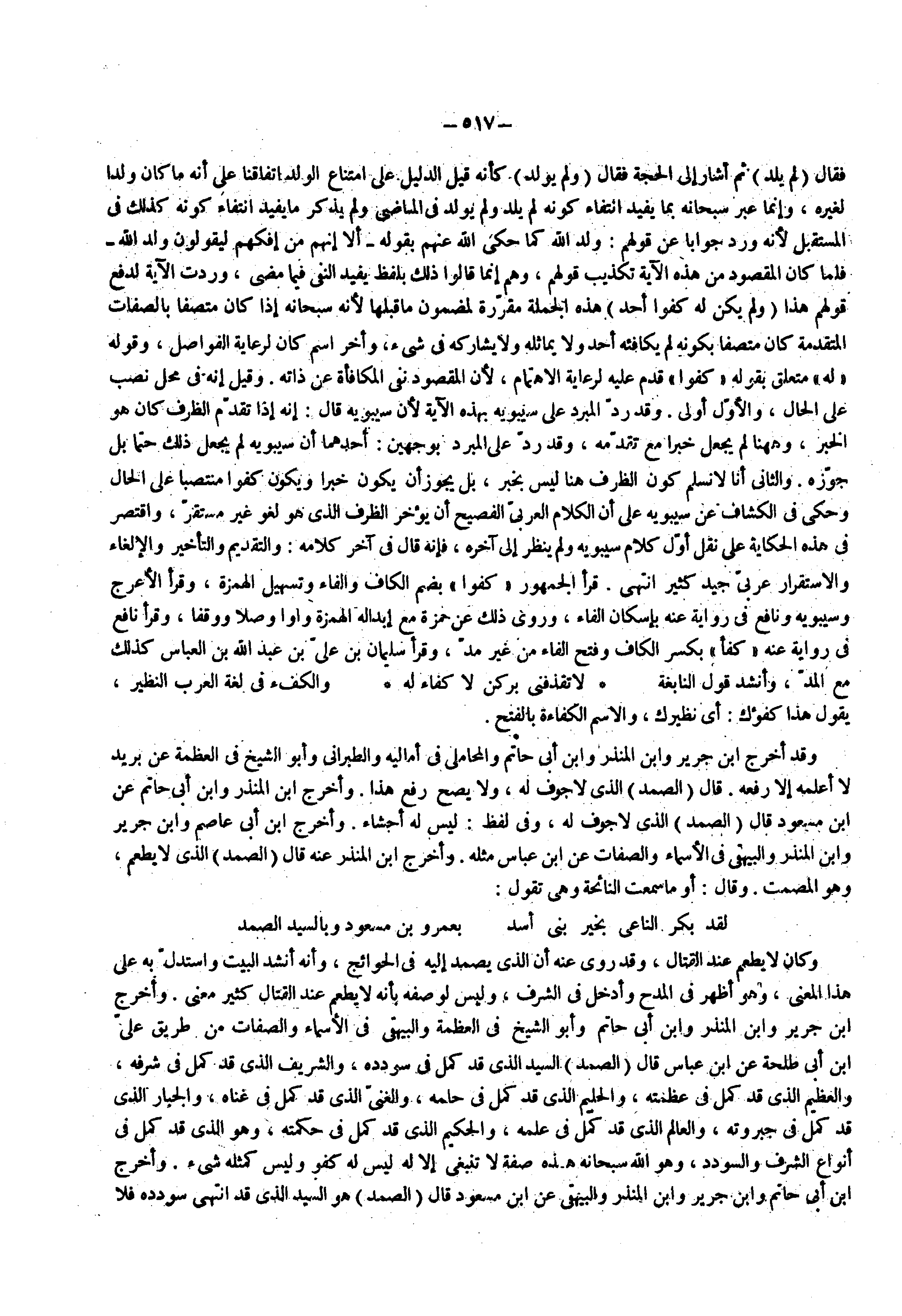 وقد أخرج ابن جرير وابن المنذر وابن أبي حاتم والمحاملي في أماليه والطبراني وأبو الشيخ في العظمة عن بريد لا أعلمه إلا رفعه قال الصمد الذي لا جوف له ولا يصح رفع هذا وأخرج ابن المنذر وابن أبي حاتم عن ابن مسعود قال الصمد الذي لا جوف له وفي لفظ ليس له أحشاء وأخرج ابن أبي عاصم وابن جرير وابن المنذر والبيهقي في الأسماء والصفات عن ابن عباس مثله وأخرج ابن المنذر عنه قال ) الصمد ( الذي لا يطعم وهو المصمت وقال أو ما سمعت النائحة وهي تقول لقد بكر الناعى بخير بني أسد