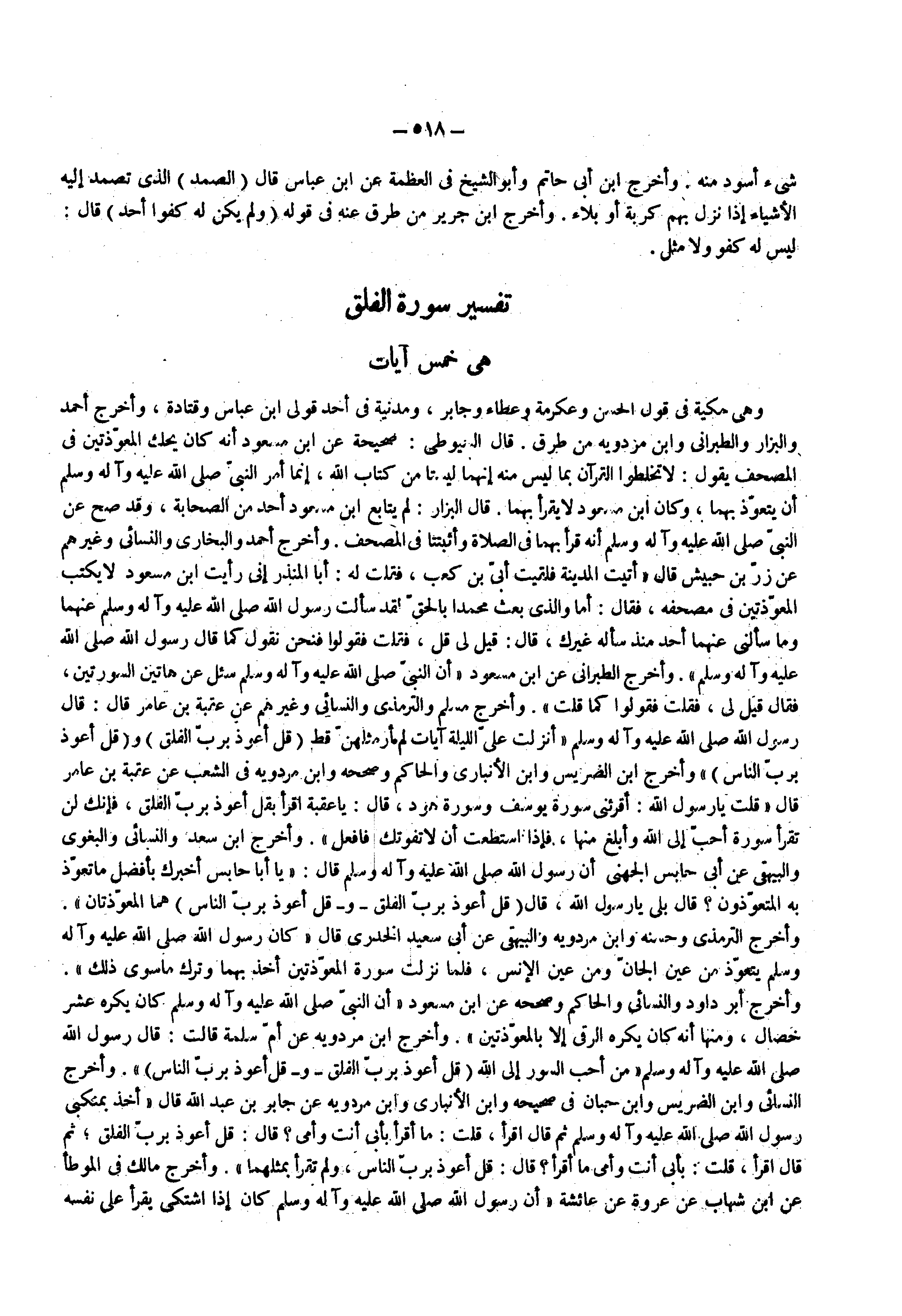 وهي مكية في قول الحسن وعكرمة وعطاء وجابر ومدنية في أحد قولي ابن عباس وقتادة وأخرج أحمد والبزار والطبراني وابن مردويه من طرق قال السيوطي صحيحه عن ابن مسعود أنه كان يحك المعوذتين في المصحف يقول لا تخلطوا القران بما ليس منه إنهما ليستا من كتاب الله إنما أمر النبي صلى الله عليه واله وسلم أن يتعوذ بهما وكان ابن مسعود لا يقرأ بهما قال البزار لم يتابع ابن مسعود أحد من الصحابة وقد صح عن النبي صلى الله عليه واله وسلم أنه قرأ بهما في الصلاة وأثبتتا في المصحف وأخرج أحمد والبخاري والنسائي وغيرهم عن زر بن حبيش قال أتيت المدينة فلقيت أبي بن كعب فقلت له أبا المنذر إني رأيت ابن مسعود لا يكتب المعوذتين في مصحفه فقال أما والذي بعث محمدا بالحق لقد سألت رسول الله صلى الله عليه واله وسلم عنهما وما سألني عنهما أحد منذ سأله غيرك قال قيل لي قل فقلت فقولوا فنحن نقول كما قال رسول الله صلى الله عليه واله وسلم وأخرج الطبراني عن ابن مسعود أن النبي صلى الله عليه واله وسلم سئل عن هاتين السورتين فقال قيل لي فقلت فقولوا كما قلت وأخرج مسلم والترمذي والنسائي وغيرهم عن عقبة بن عامر قال قال رسول الله صلى الله عليه واله وسلم أنزلت علي الليلة آيات لم أر مثلهن قط ) قل أعوذ برب الفلق ( و ) قل أعوذ برب الناس ( وأخرج ابن الضريس وابن الأنباري والحاكم وصححه وابن مردويه في الشعب عن عقبة بن عامر قال قلت يا رسول الله أقرئني سورة يوسف وسورة هود قال يا عقبة اقرأ بقل أعوذ برب الفلق فإنك لن تقرأ سورة أحب إلى الله وأبلغ منها فإذا استطعت أن لا تفوتك فافعل وأخرج ابن سعد والنسائي والبغوي والبيهقي عن أبي حابس الجهني أن رسول الله صلى الله عليه واله وسلم قال يا أبا حابس أخبرك بأفضل ما تعوذ به المتعوذون قال بلى يا رسول الله قال ) قل أعوذ برب الفلق ( و ) قل أعوذ برب الناس ( هما المعوذتان وأخرج الترمذي وحسنه وابن مردويه والبيهقي عن أبي سعيد الخدري قال كان رسول الله صلى الله عليه واله وسلم يتعوذ من عين الجان ومن عين الإنس فلما نزلت سورة المعوذتين أخذ بهما وترك ماسوى ذلك وأخرج أبو داود والنسائي والحاكم وصححه عن ابن مسعود أن النبي صلى الله عليه واله وسلم كان يكره عشر خصال ومنها أنه كان يكره الرقى إلا بالمعوذتين وأخرج ابن مردويه عن أم سلمة قالت قال رسول الله صلى الله عليه واله وسلم من أحب السور إلى الله ) قل أعوذ برب الفلق ( و ) قل أعوذ برب الناس ( وأخرج النسائي وابن الضريس وابن حبان في صحيحه وابن الأنباري وابن مردويه عن جابر بن عبد الله قال أخذ بمنكني رسول الله صلى الله عليه واله وسلم ثم قال اقرأ قلت ما أقرأ بأبى أنت وأمي قال قل أعوذ برب الفلق ثم قال اقرأ قلت بأبي أنت وأمي ما أقرأ قال قل أعوذ برب الناس ولم تقرأ بمثلهما وأخرج مالك في الموطأ عن ابن شهاب عن عروة عن عائشة أن رسول الله صلى الله عليه واله وسلم كان إذا اشتكى يقرأ على نفسه