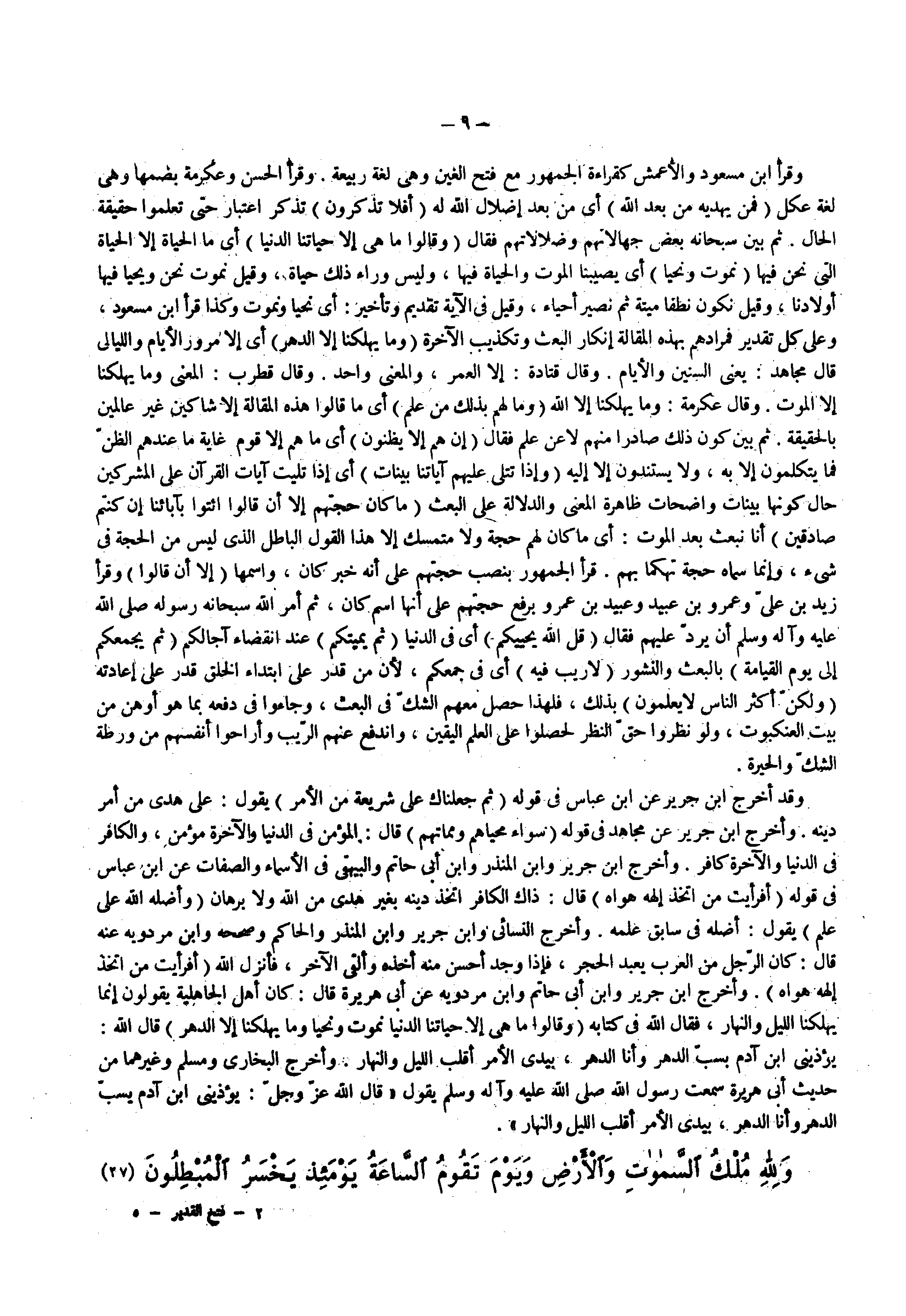 وقد أخرج ابن جرير عن ابن عباس في قوله ( ثم جعلناك على شريعة من الأمر ) يقول على هدى من أمر دينه وأخرج ابن جرير عن مجاهد في قوله ( سواء محياهم ومماتهم ) قال المؤمن في الدنيا والآخرة مؤمن والكافر في الدنيا والآخرة كافر وأخرج ابن جرير وبن المنذر بن وأبي حاتم والبيهقي في الأسماء والصفات عن ابن عباس في قوله ( أفرأيت من أتخذ إلهة هواه ) قال ذاك الكافر اتخذ دينه بغير هدى من الله ولا برهان ( وأضله الله على علم ) يقول اضله في سابق علمه وأخرج النسائي وابن جرير وبن المنذر والحاكم وصححه وابن مردويه عنه قال كان الرجل من العرب يعبد الحجر فإذا وجد أحسن منه أخذه وألقى الآخر فأنزل الله ( أفرأيت من أتخذ إلهه هواه ) وأخرج ابن جرير وابن أبي حاتم وبن مردويه عن أبي هريرة قال كان أهل الجاهلية يقولون إنما يهلكنا الليل والنهار فقال الله في كتابه ( وقالوا ما هي إلا حياتنا الدنيا نموت ونحيا وما يهلكنا إلا الدهر ) قال الله يؤذيني ابن آدم بسبب الدهر وأنا الدهر بيدي الأمر أقلب الليل والنهار وأخرج البخاري ومسلم وغيرهما من حديث أبي هريرة سمعت رسول الله ( صلى الله عليه وسلم ) يقول ( قال الله عز وجل يؤذيني ابن آدم يسب الدهر وأنا الدهر بيدي الأمر اقلب الليل والنهار سورة الجاثية ( 27 37 )