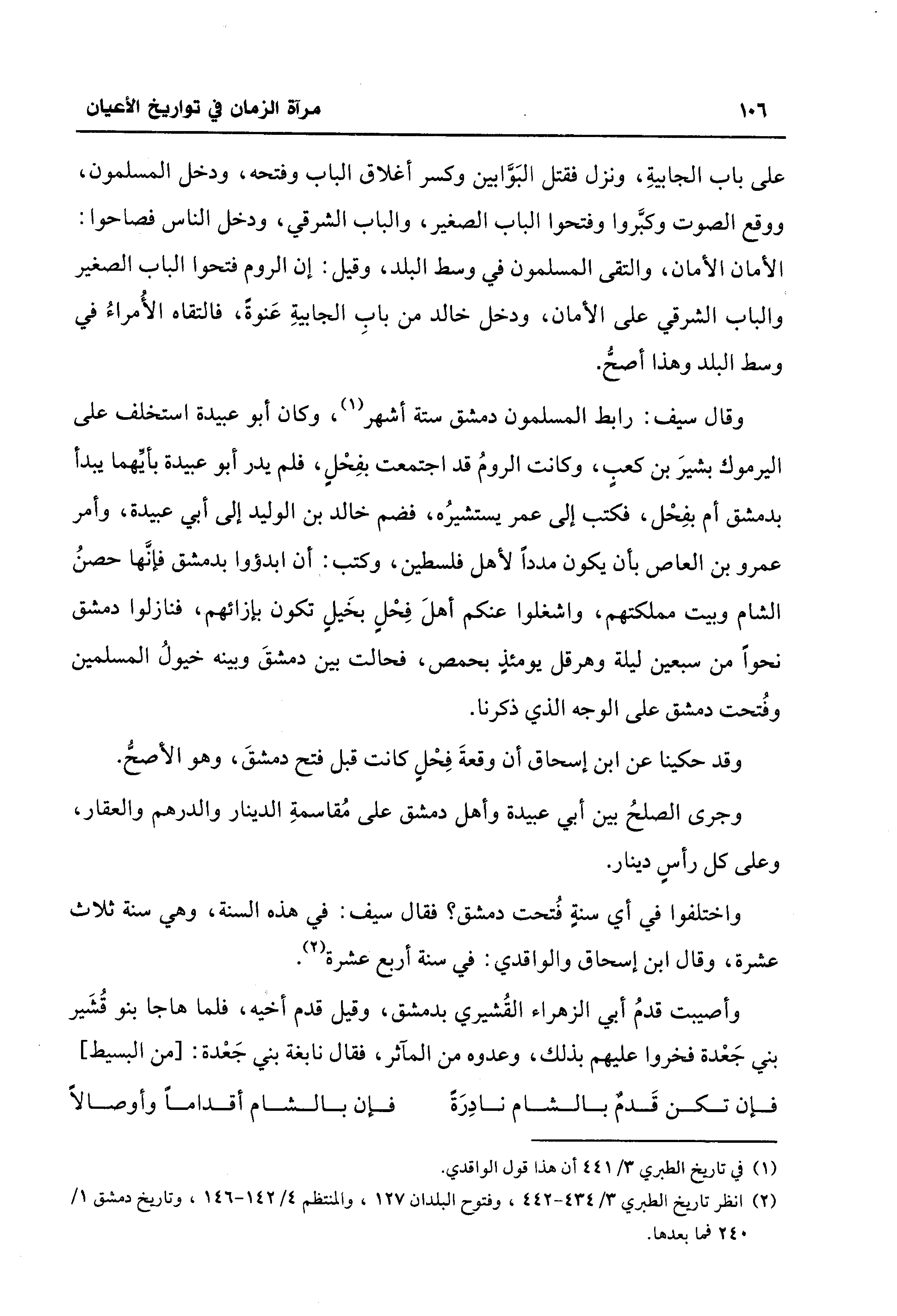 (¬2) انظر تاريخ الطبري 3/ 434 - 442، وفتوح البلدان 127، والمنتظم 4/ 142 - 146، وتاريخ دمشق 1/ 240 فما بعدها.