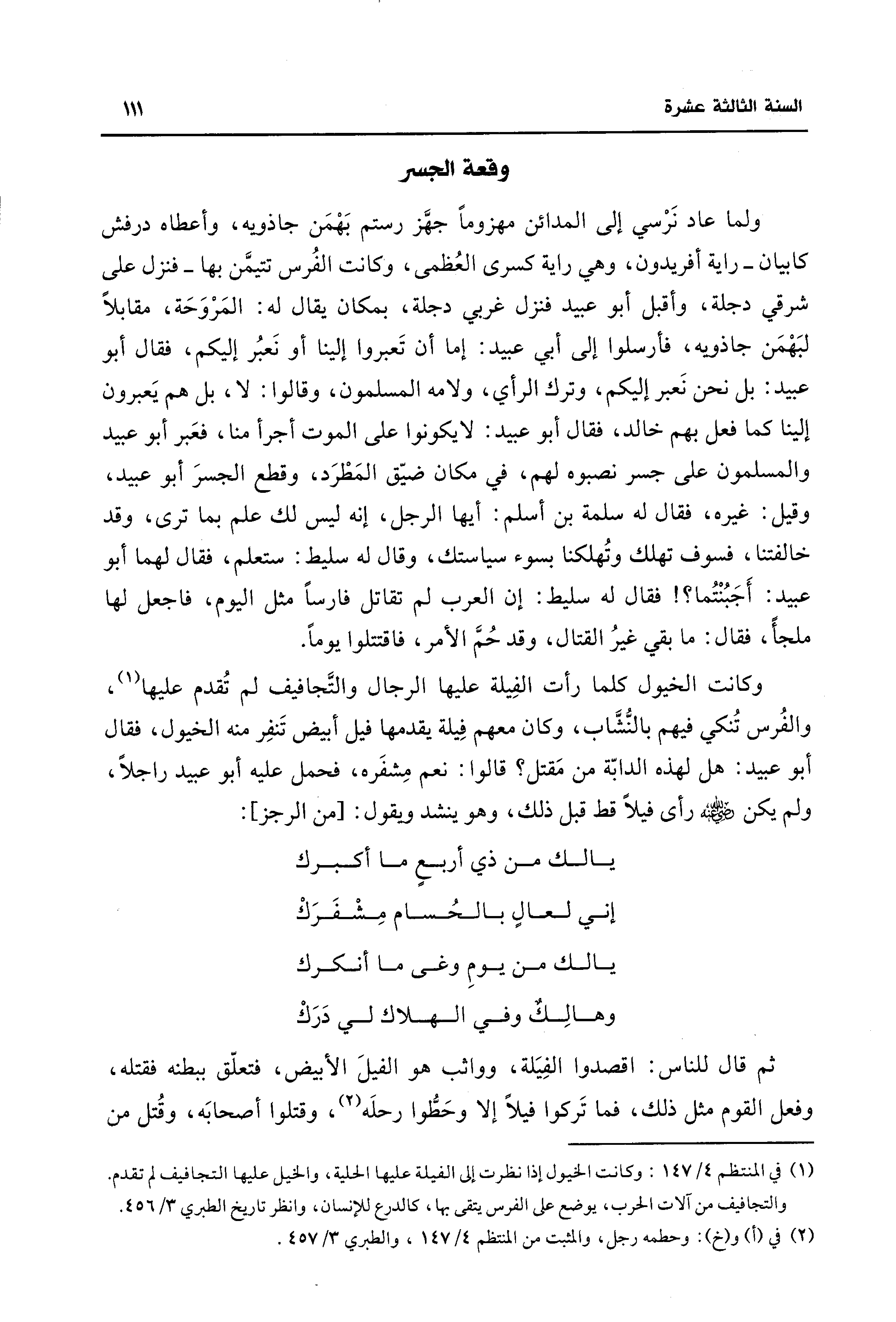 وكانت الخيول كما رأت الفِيلة عليها الرجال والتَّجافيف لم تُقدم عليها (¬1)، والفُرس تُنكي فيهم بالنُّشَّاب، وكان معهم فِيلة يقدمها قيل أبيض تَنفِر منه الخيول، فقال أبو عبيد: هل لهذه الدابّة من مَقتل؟ قالوا: نعم مِشفَره، فحمل عليه أبو عبيد راجلًا، ولم يكن -رضي اللَّه عنه- رأى فيلًا قط قبل ذلك، وهو ينشد ويقول: [من الرجز]: