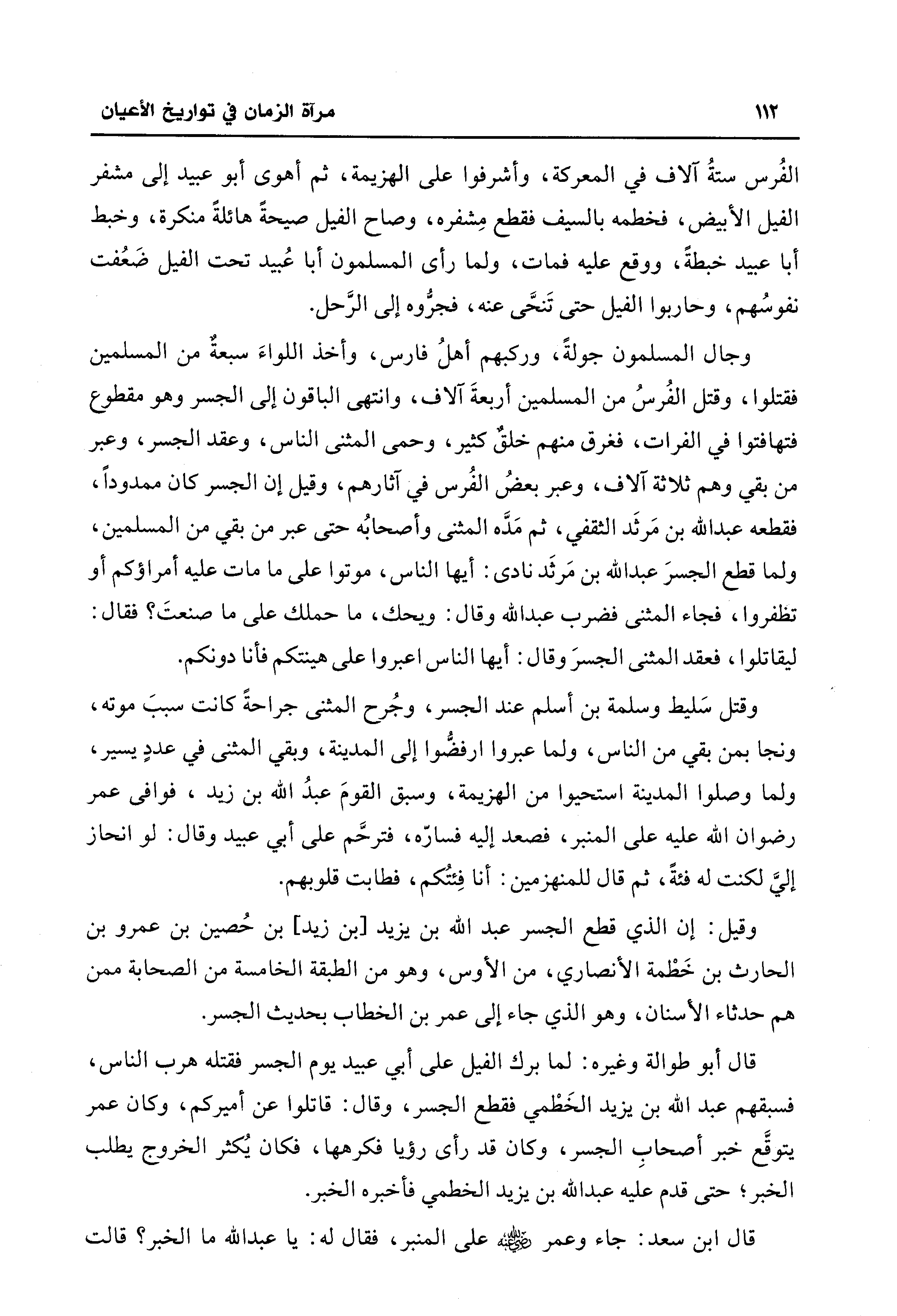 وجال المسلمون جولةً، وركبهم أهلُ فارس، وأخذ اللواءَ سبعةٌ من المسلمين فقتلوا، وقتل الفُرسُ من المسلمين أربعةَ آلاف، وانتهى الباقون إلى الجسر وهو مقطوع فتهافتوا في الفرات، فغرق منهم خلقٌ كثير، وحمى المثنى الناس، وعقد الجسر، وعبر من بقي وهم ثلاثة آلاف، وعبر بعضُ الفُرس في آثارهم، وقيل إن الجسر كان ممدودًا، فقطعه عبد اللَّه بن مَرثَد الثقفي، ثم مَدَّه المثنى وأصحابُه حتى عبر من بقي من المسلمين، ولما قطع الجسرَ عبد اللَّه بن مَرثَد نادى: أيها الناس، موتوا على ما مات عليه أمراؤكم أو تظفروا، فجاء المثنى فضرب عبد اللَّه وقال: ويحك، ما حملك على ما صنعتَ؟ فقال: ليقاتلوا، فعقد المثنى الجسرَ وقال: أيها الناس اعبروا على هينتكم فأنا دونكم.