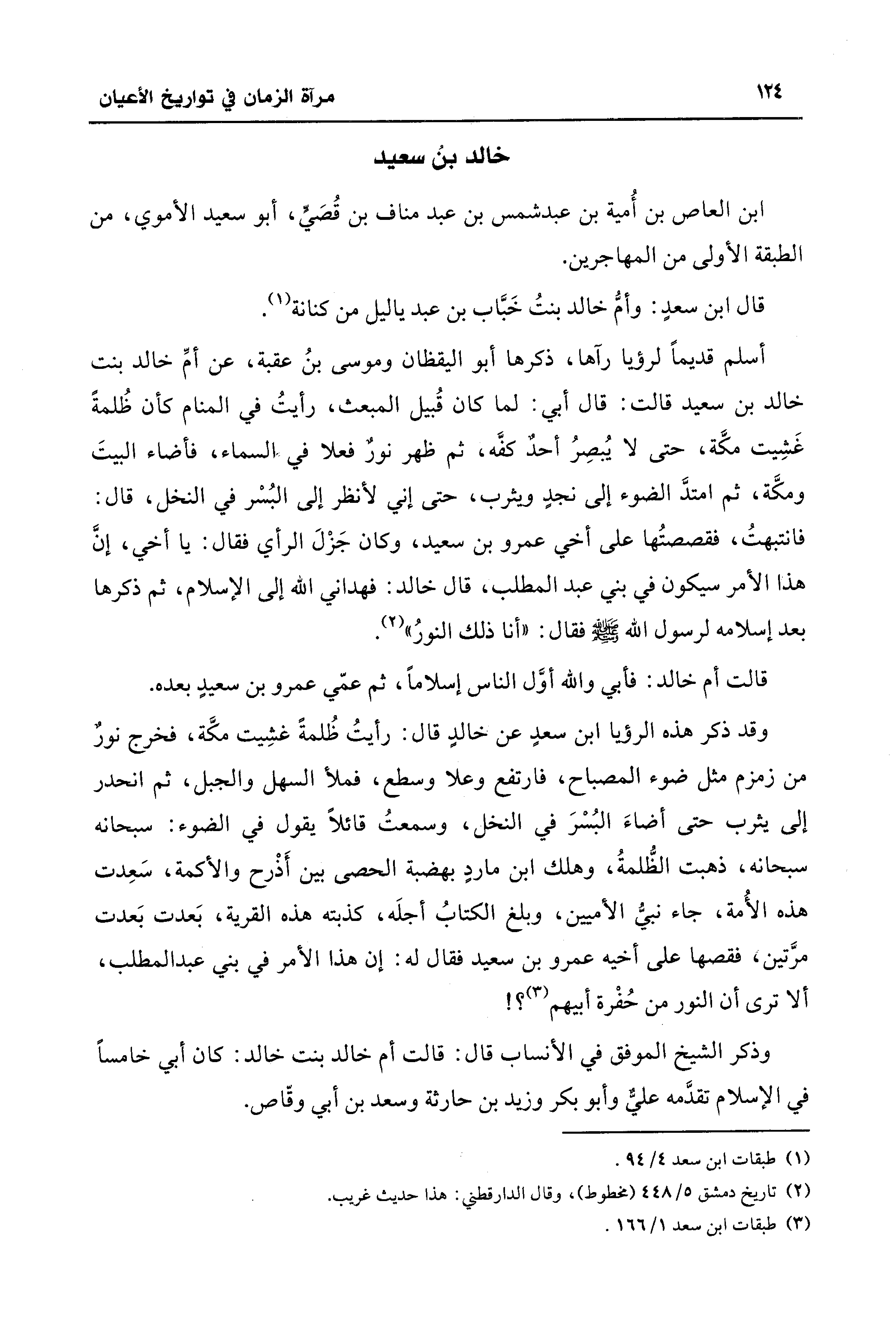 وقد ذكر هذه الرؤيا ابن سعدٍ عن خالدٍ قال: رأيتُ ظُلمةً غشِيت مكَّة، فخرج نورٌ من زمزم مثل ضوء المصباح، فارتفع وعلا وسطع، فملأ السهل والجبل، ثم انحدر إلى يثرب حتى أضاءَ البُسْرَ في النخل، وسمعتُ قائلًا يقول في الضوء: سبحانه سبحانه، ذهبت الظُّلمةُ، وهلك ابن ماردٍ بهضبة الحصى بين أَذْرح والأكمة، سَعِدت هذه الأُمة، جاء نبيُّ الأميين، وبلغ الكتابُ أجلَه، كذبته هذه القرية، بَعدت بَعدت مرَّتين، فقصها على أخيه عمرو بن سعيد فقال له: إن هذا الأمر في بني عبد المطلب، ألا ترى أن النور من حُفْرة أبيهم (¬3)؟ !