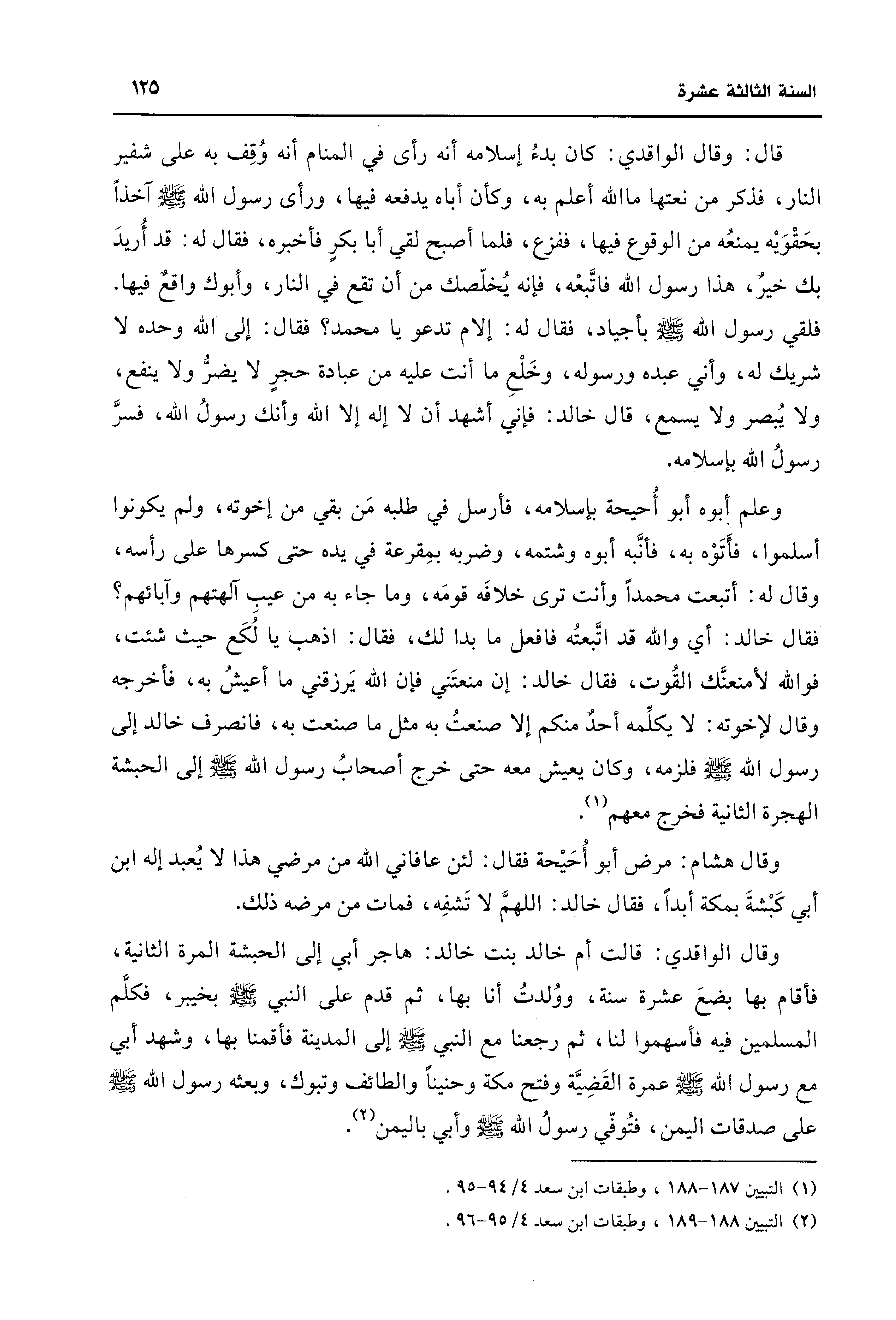 قال: وقال الواقدي: كان بدءُ إسلامه أنه رأى في المنام أنه وُقِف به على شفير النار، فذكر من نعتها ما اللَّه أعلم به، وكأن أباه يدفعه فيها، ورأى رسول اللَّه -صلى اللَّه عليه وسلم- آخذًا بحَقْوَيْه يمنعُه من الوقوع فيها، ففزع، فلما أصبح لقي أبا بكرٍ فأخبره، فقال له: قد أُريدَ بك خيرٌ، هذا رسول اللَّه فاتَّبعْه، فإنه يُخلّصك من أن تقع في النار، وأبوك واقعٌ فيها. فلقي رسول اللَّه -صلى اللَّه عليه وسلم- بأجياد، فقال له: الأم تدعو يا محمَّد؟ فقال: إلى اللَّه وحده لا شريك له، وأني عبده ورسوله، وخَلْعِ ما أنت عليه من عبادة حجرٍ لا يضرُّ ولا ينفع، ولا يُبصر ولا يسمع، قال خالد: فإني أشهد أن لا إله إلا اللَّه وأنك رسولُ اللَّه، فسرَّ رسولُ اللَّه -صلى اللَّه عليه وسلم- بإسلامه.