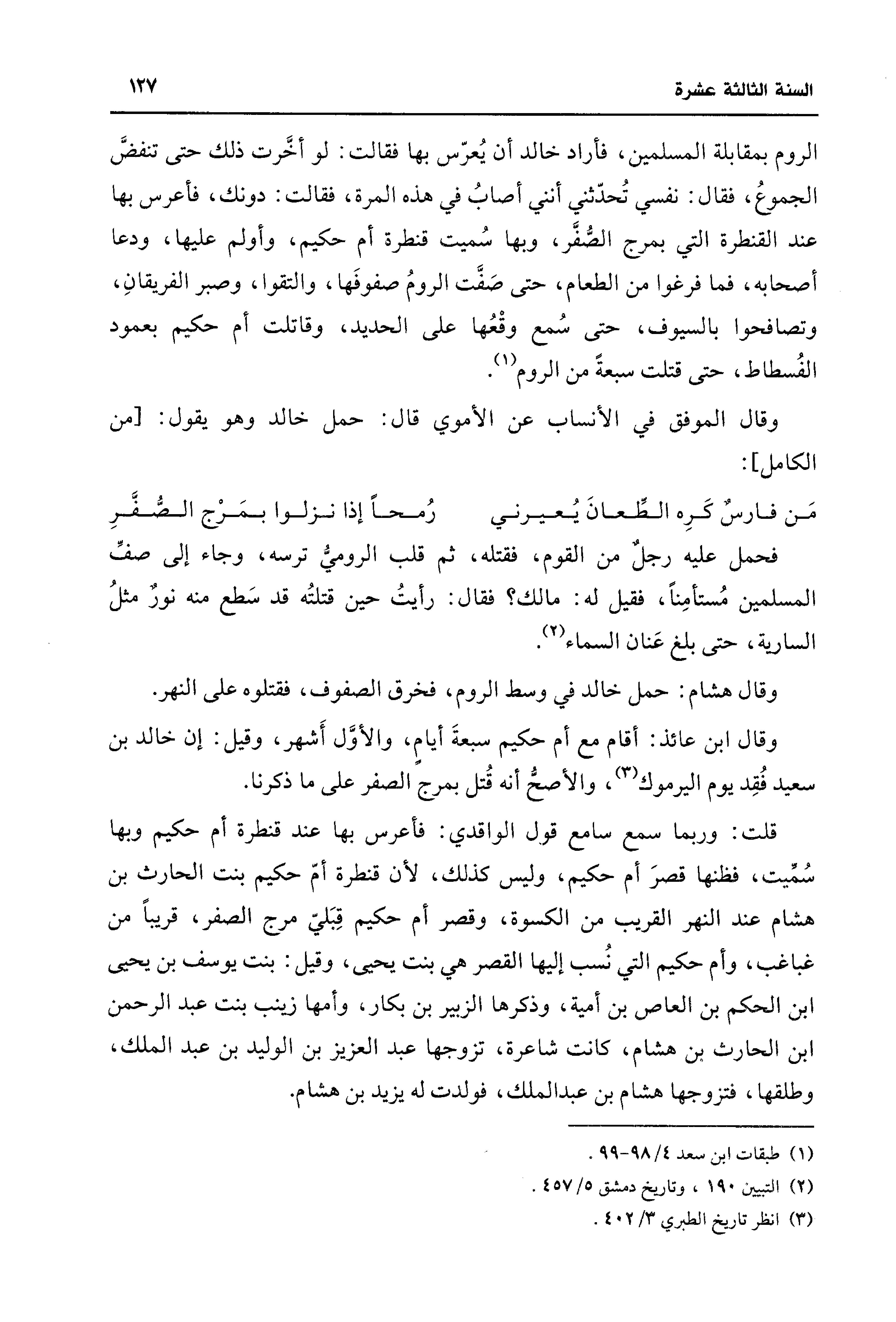الروم بمقابلة المسلمين، فأراد خالد أن يُعرّس بها فقالت: لو أخَّرت ذلك حتى تنفضَّ الجموعُ، فقال: نفسي تُحدّثني أنني أصابُ في هذه المرة، فقالت: دونك، فأعرس بها عند القنطرة التي بمرج الصُّفَّر، وبها سُميت قنطرة أم حكيم، وأولم عليها، ودعا أصحابه، فما فرغوا من الطعام، حتى صَفَّت الرومُ صفوفَها، والتقوا، وصبر الفريقانِ، وتصافحوا بالسيوف، حتى سُمع وقْعُها على الحديد، وقاتلت أم حكيم بعمود الفُسطاط، حتى قتلت سبعةً من الروم (¬1).