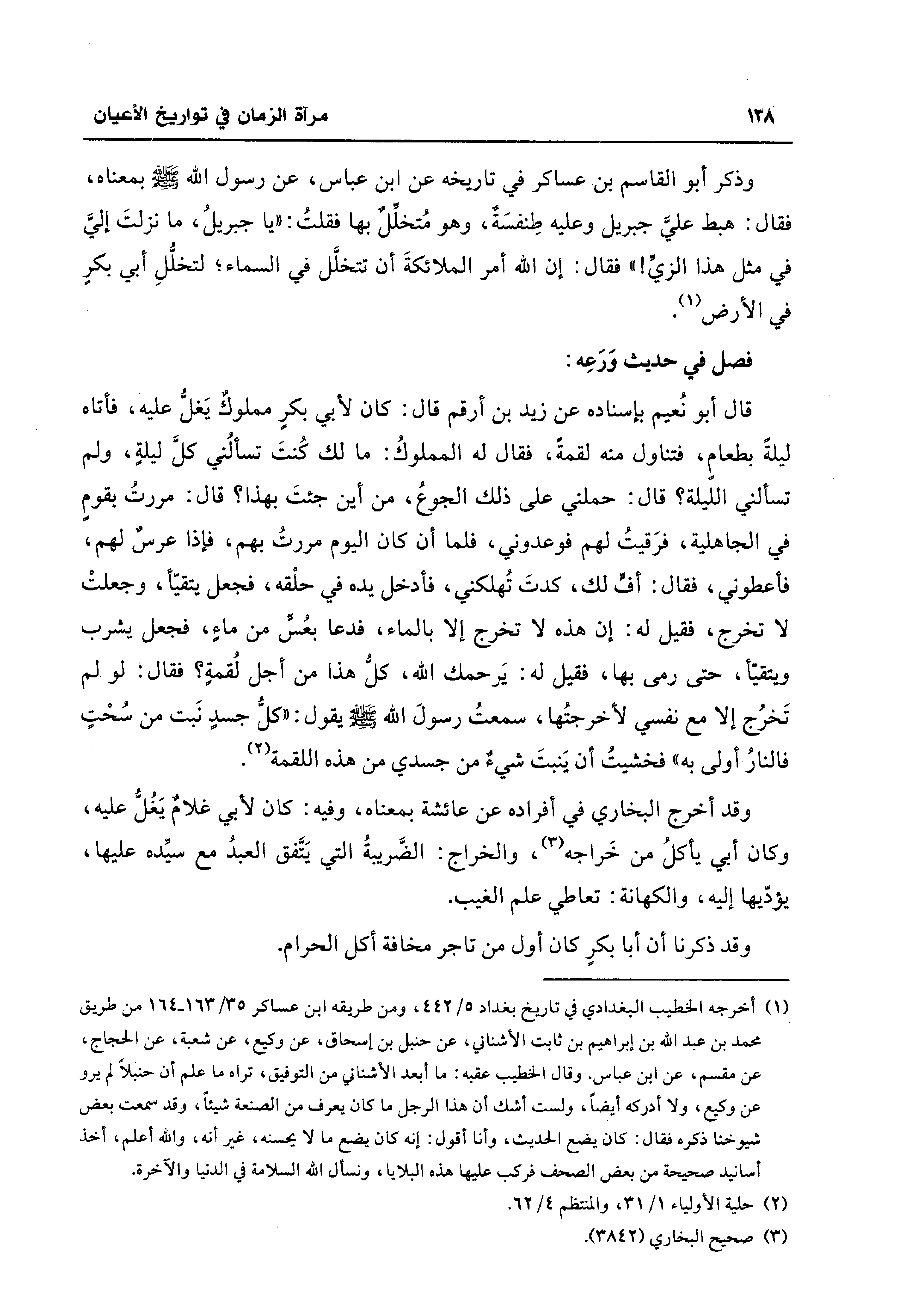 قال أبو نُعيم بإسناده عن زيد بن أرقم قال: كان لأبي بكرٍ مملوكٌ يَغلُّ عليه، فأتاه ليلةً بطعامٍ، فتناول منه لقمةً، فقال له المملوكُ: مالك كُنتَ تسألُني كلَّ ليلةٍ، ولم تسألني الليلة؟ قال: حملني على ذلك الجوعُ، من أين جئتَ بهذا؟ قال: مررتُ بقومٍ في الجاهلية، فرَقيتُ لهم فوعدوني، فلما أن كان اليوم مررتُ بهم، فإذا عرسٌ لهم، فأعطوني، فقال: أفٍّ لك، كدتَ تُهلكني، فأدخل يده في حلْقه، فجعل يتقيّأ، وجعلتْ لا تخرج، فقيل له: إن هذه لا تخرج إلا بالماء، فدعا بعُسٍّ من ماءٍ، فجعل يشرب ويتقيّأ، حتى رمى بها، فقيل له: يَرحمك اللَّه، كلُّ هذا من أجل لُقمةٍ؟ فقال: لو لم تَخرُج إلا مع نفسي لأخرجتُها، سمعتُ رسولَ اللَّه -صلى اللَّه عليه وسلم- يقول: "كلُّ جسدٍ نَبت من سُحْتٍ فالنارُ أولى به" فخشيتُ أن يَنبتَ شيءٌ من جسدي من هذه اللقمة (¬2).