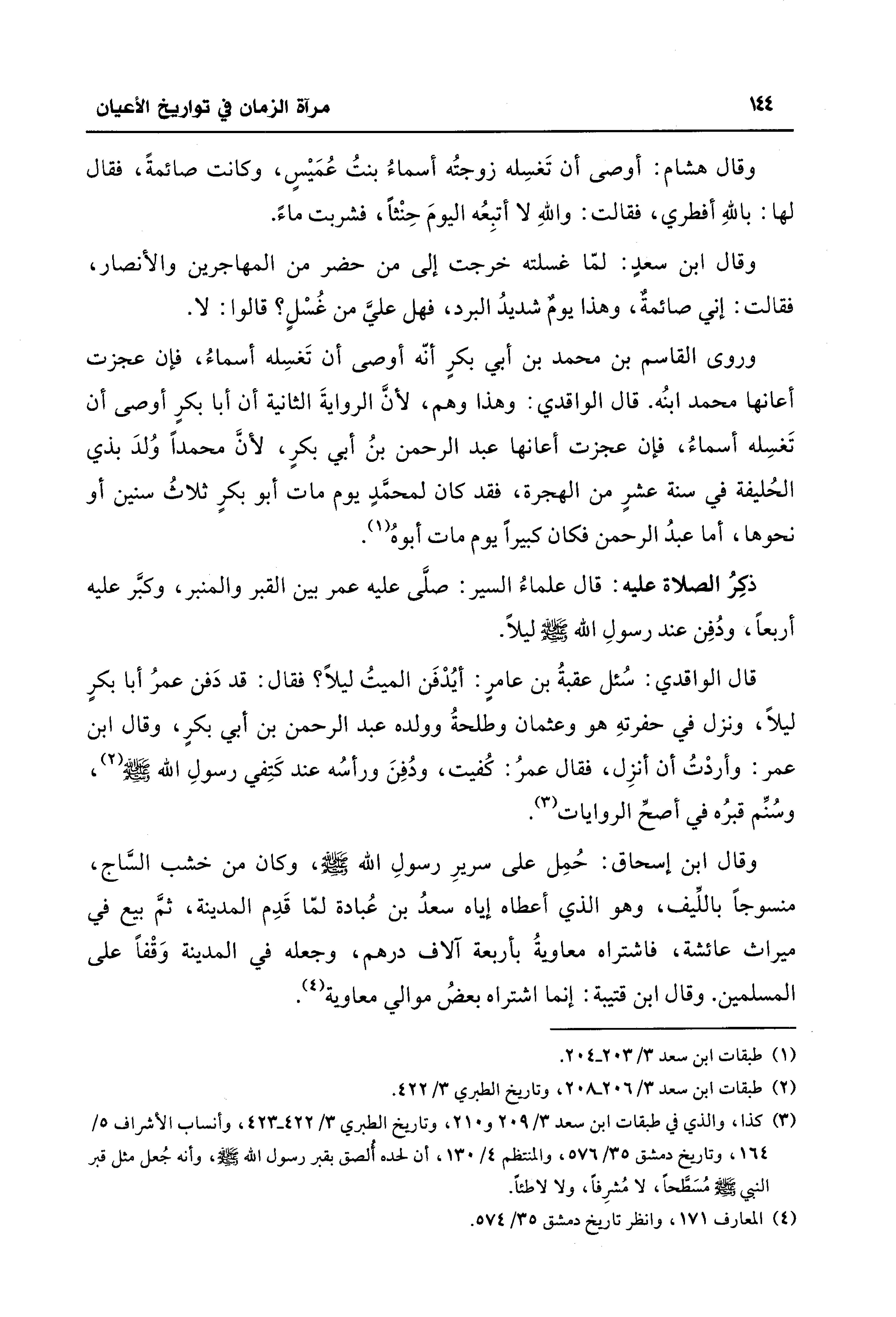 (¬3) كذا، والذي في طبقات ابن سعد 3/ 209 و 210، وتاريخ الطبري 3/ 422 - 423، وأنساب الأشراف 5/ 164، وتاريخ دمشق 35/ 576، والمنتظم 4/ 130، أن لحده ألصق بقبر رسول اللَّه -صلى اللَّه عليه وسلم-، وأنه جُعل مثل قبر النبي -صلى اللَّه عليه وسلم- مُسَطَّحًا، لا مُشرِفًا، ولا لاطئًا.