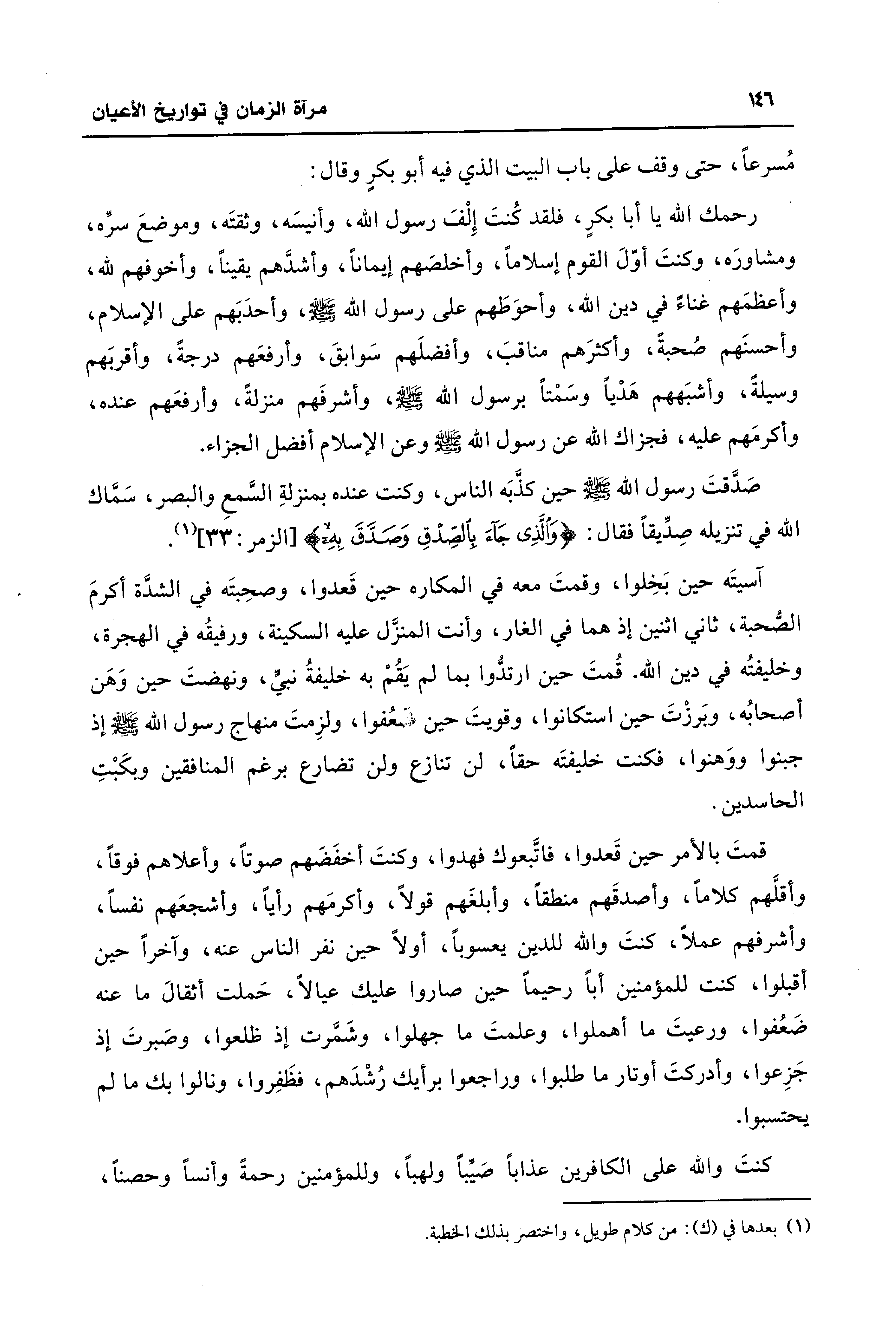آسيته حين بَخِلوا، وقمتَ معه في المكاره حين قَعدوا، وصحِبتَه في الشدَّة أكرمَ الصُّحبة، ثاني اثنين إذ هما في الغار، وأنت المنزل عليه السكينة، ورفيقُه في الهجرة، وخليفتُه في دين اللَّه. قُمتَ حين ارتدُّوا بما لم يَقُمْ به خليفةُ نبيٍّ، ونهضتَ حين وَهَن أصحابُه، وبَرزْتَ حين استكانوا، وقويتَ حين ضَعُفوا, ولزِمتَ منهاج رسول اللَّه -صلى اللَّه عليه وسلم- إذ جبنوا ووَهنوا، فكنت خليفتَه حقًا، لن تنازع ولن تضارع برغم المنافقين وبكَبْتِ الحاسدين.