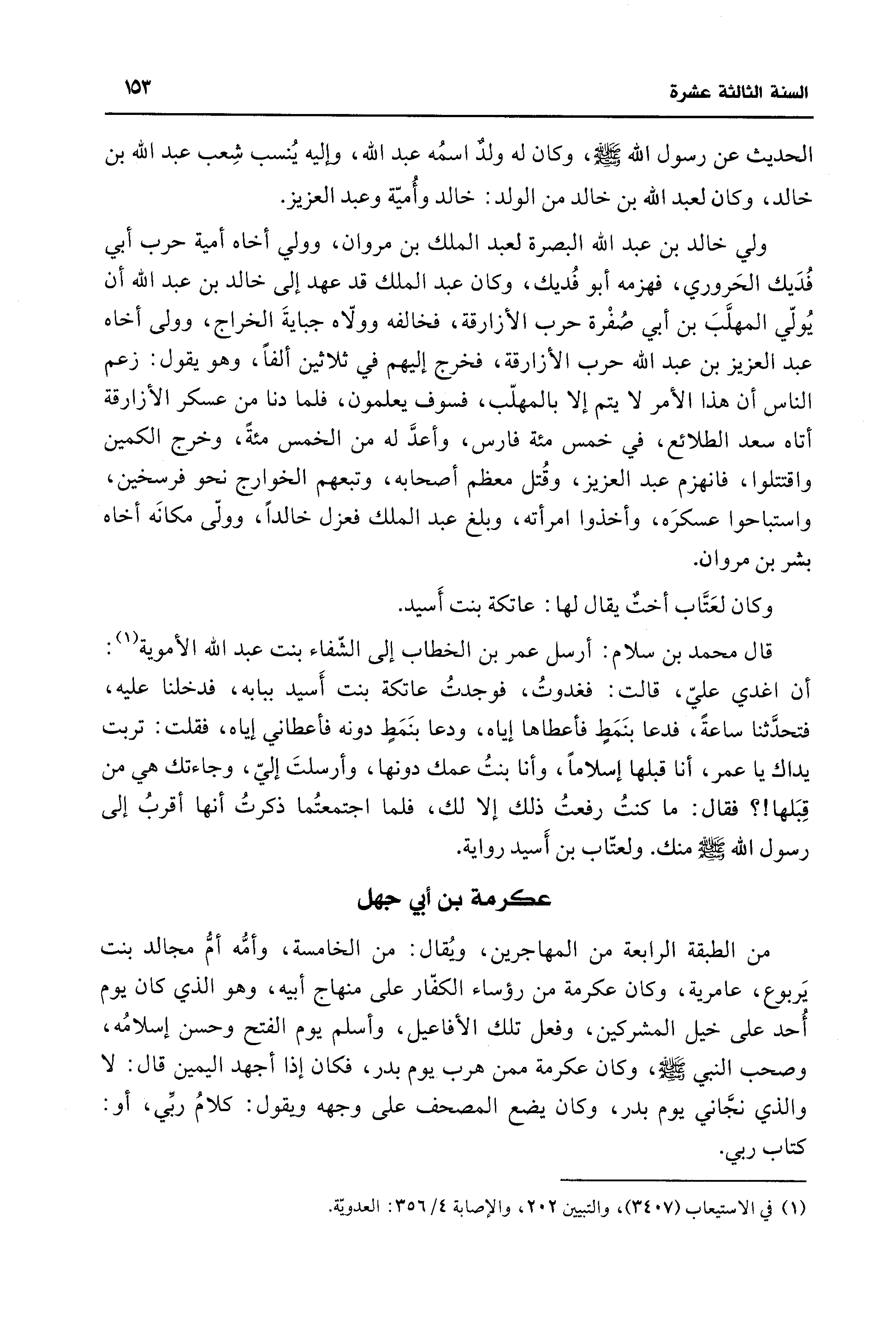 من الطبقة الرابعة من المهاجرين، ويُقال: من الخامسة، وأمُّه أمُّ مجالد بنت يَربوع، عامرية، وكان عكرمة من رؤساء الكفّار على منهاج أبيه، وهو الذي كان يوم أُحد على خيل المشركين، وفعل تلك الأفاعيل، وأسلم يوم الفتح وحسن إسلامُه، وصحب النبي -صلى اللَّه عليه وسلم-، وكان عكرمة ممن هرب يوم بدر، فكان إذا أجهد اليمين قال: لا والذي نجَّاني يوم بدر، وكان يضع المصحف على وجهه ويقول: كلامُ ربِّي، أو: كتاب ربي.