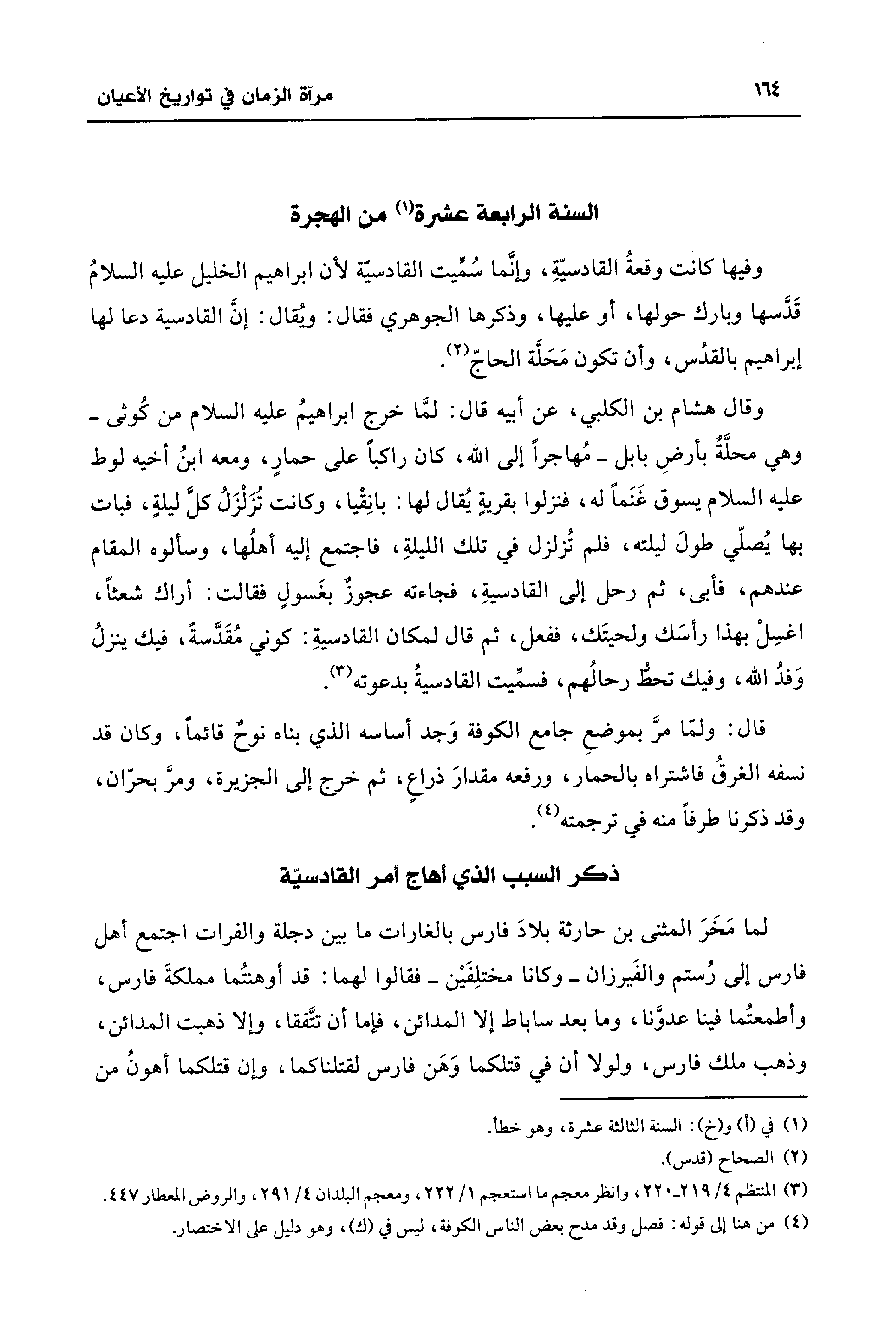 وفيها كانت وقعةُ القادسيّةِ، وإنَّما سُمِّيت القادسيّة لأن إبراهيم الخليل عليه السلامُ قَدَّسها وبارك حولها، أو عليها، وذكرها الجوهري فقال: ويُقال: إنَّ القادسية دعا لها إبراهيم بالقدُس، وأن تكون مَحَلَّة الحاجّ (¬2).