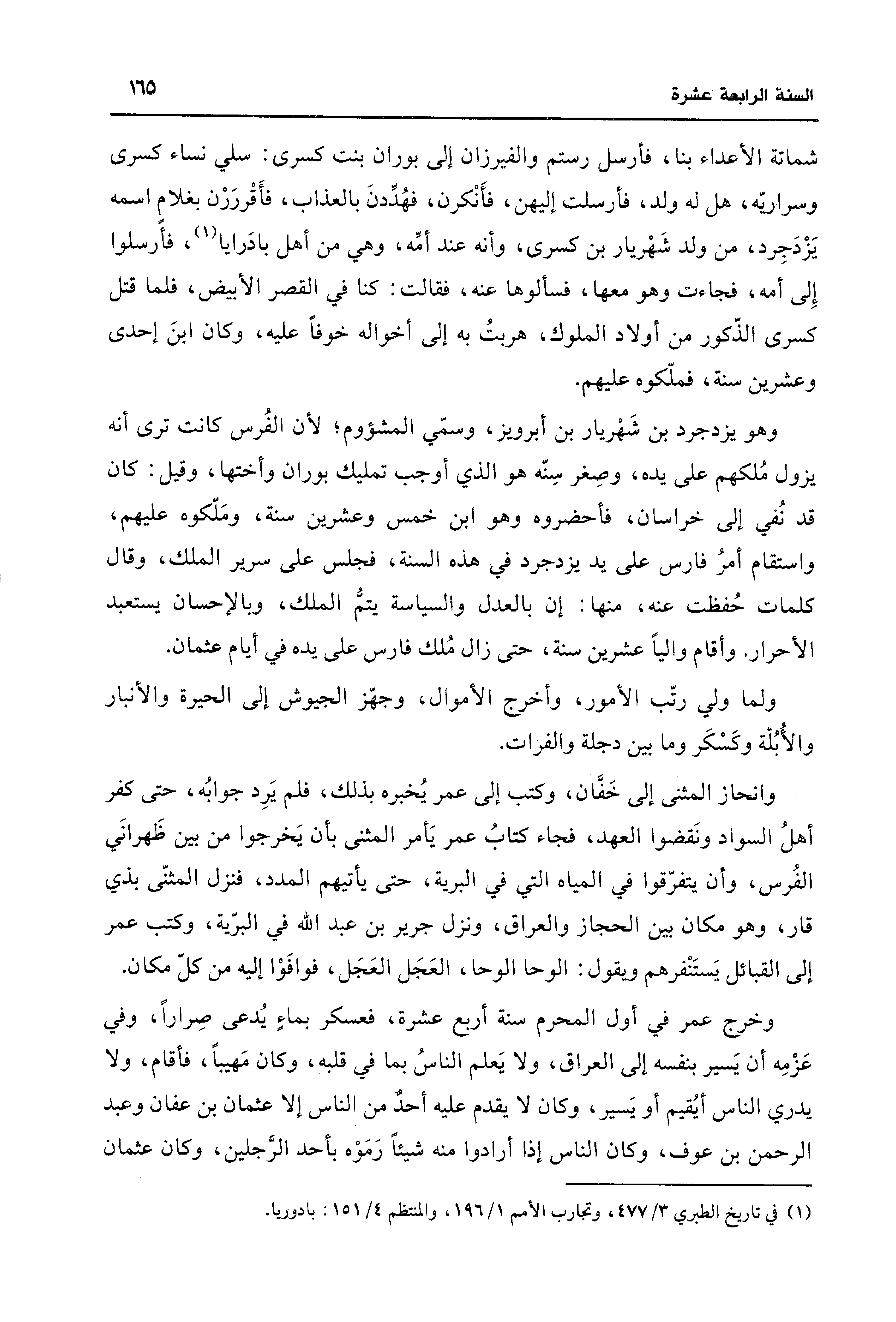 وخرج عمر في أول المحرم سنة أربع عشرة، فعسكر بماءٍ يُدعى صِرارًا، وفي عَزْمِه أن يَسير بنفسه إلى العراق، ولا يَعلم الناسُ بما في قلبه، وكان مَهيبًا، فأقام، ولا يدري الناس أيُقيم أو يَسير، وكان لا يقدم عليه أحدٌ من الناس إلا عثمان بن عفان وعبد الرحمن بن عوف، وكان الناس إذا أرادوا منه شيئًا رَمَوْه بأحد الرَّجلين، وكان عثمان