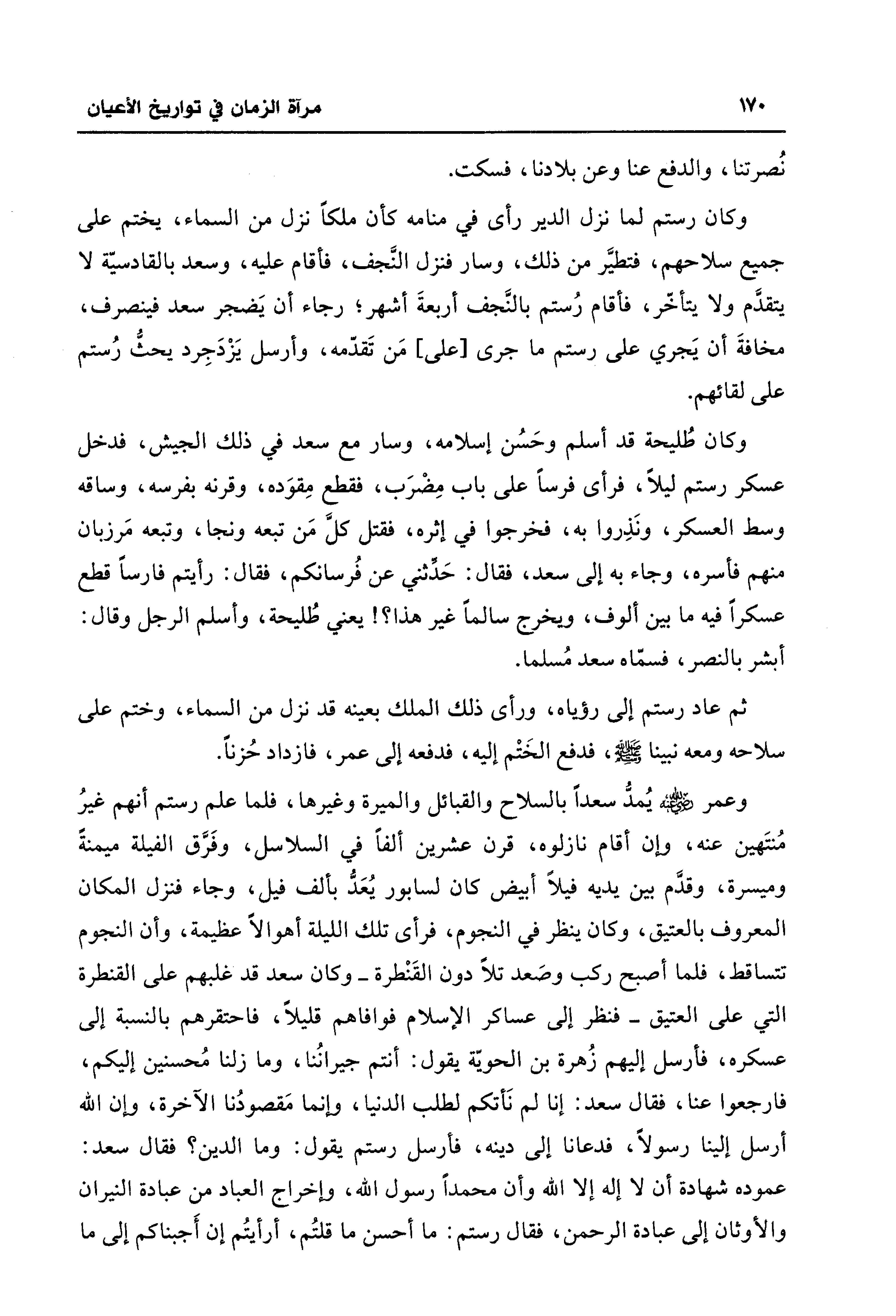 وعمر -رضي اللَّه عنه- يُمدُّ سعدًا بالسلاح والقبائل والميرة وغيرها، فلما علم رستم أنهم غيرُ مُنتَهين عنه، وإن أقام نازلوه، قرن عشرين ألفًا في السلاسل، وفَرَّق الفيلة ميمنةً وميسرة، وقدَّم بين يديه فيلًا أبيض كان لسابور يُعَدُّ بألف فيل، وجاء فنزل المكان المعروف بالعتيق، وكان ينظر في النجوم، فرأى تلك الليلة أهوالًا عظيمة، وأن النجوم تتساقط، فلما أصبح ركب وصَعد تلًا دون القَنْطرة -وكان سعد قد غلبهم على القنطرة التي على العتيق- فنظر إلى عساكر الإِسلام فوافاهم قليلًا، فاحتقرهم بالنسبة إلى عسكره، فأرسل إليهم زُهرة بن الحويّة يقول: أنتم جيرانُنا، وما زلنا مُحسنين إليكم، فارجعوا عنا، فقال سعد: إنا لم نَأتكم لطلب الدنيا، وإنما مَقصودُنا الآخرة، وإن اللَّه أرسل إلينا رسولًا، فدعانا إلى دينه، فأرسل رستم يقول: وما الدين؟ فقال سعد: عموده شهادة أن لا إله إلا اللَّه وأن محمدًا رسول اللَّه، وإخراج العباد من عبادة النيران والأوثان إلى عبادة الرحمن، فقال رستم: ما أحسن ما قلتُم، أرأيتُم إن أَجبناكم إلى ما