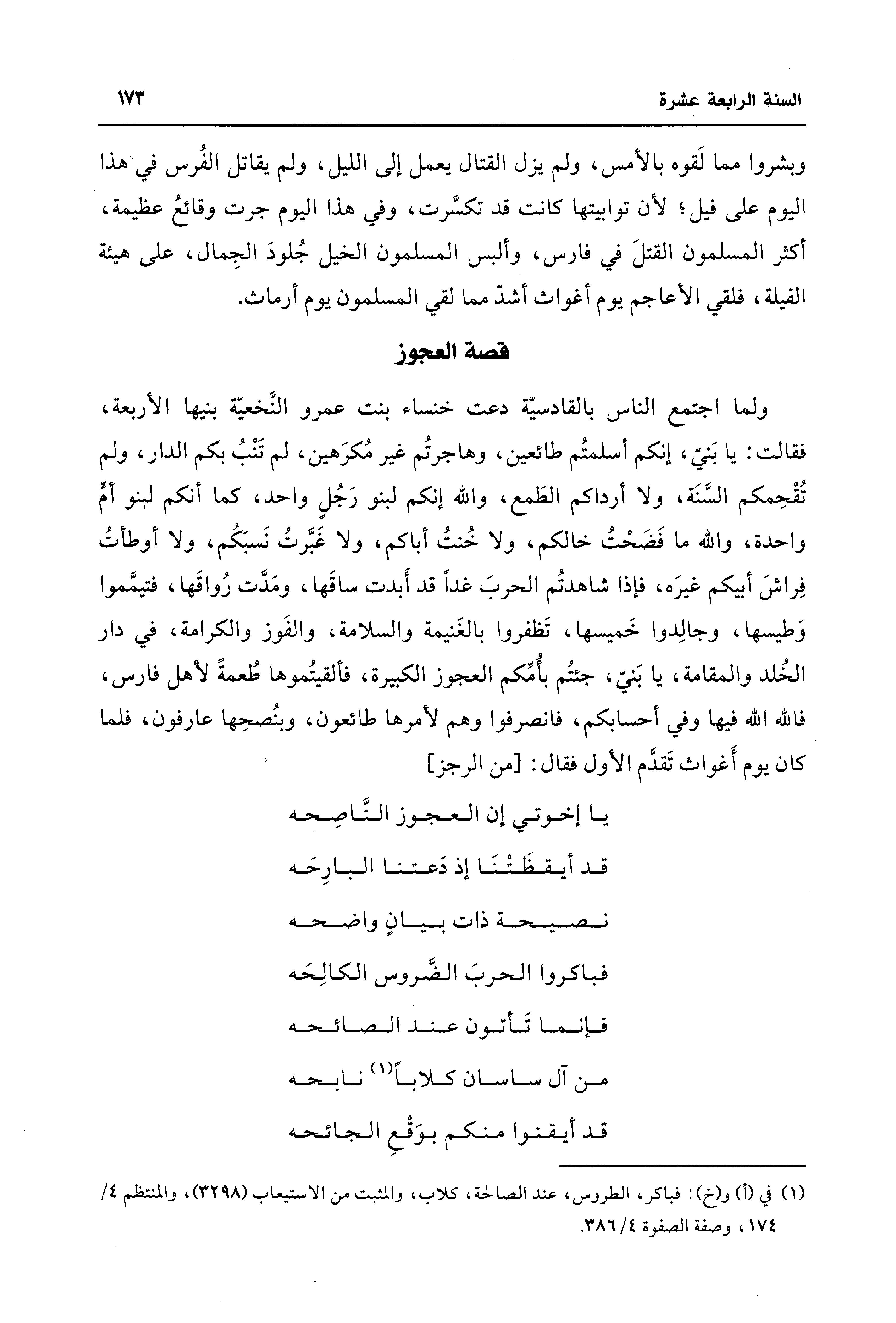 ولما اجتمع الناس بالقادسيّة دعت خنساء بنت عمرو النَّخعيّة بنيها الأربعة، فقالت: يا بَنيّ، إنكم أسلمتُم طائعين، وهاجرتُم غير مُكرَهين، لم تَنْبُ بكم الدار، ولم تُقْحِمكم السَّنَة، ولا أرداكم الطَمع، واللَّه إنكم لبنو رَجُلٍ واحد، كما أنكم لبنو أمَّ واحدة، واللَّه ما فَضَحْتُ خالكم، ولا خُنتُ أباكم، ولا غَبَّرتُ نَسبَكُم، ولا أوطأتُ فِراشَ أبيكم غيرَه، فإذا شاهدتُم الحربَ غدًا قد أَبدت ساقَها، ومَدَّت رُواقَها، فتيمَّموا وَطيسها، وجالِدوا خَميسها، تَظفروا بالغَنيمة والسلامة، والفَوز والكرامة، في دار الخُلد والمقامة، يا بَنيّ، جئتُم بأُمِّكم العجوز الكبيرة، فألقيتُموها طُعمةً لأهل فارس، فاللَّه اللَّه فيها وفي أحسابكم، فانصرفوا وهم لأمرها طائعون، وبنُصحِها عارفون، فلما كان يوم أَغواث تَقدَّم الأول فقال: [من الرجز]