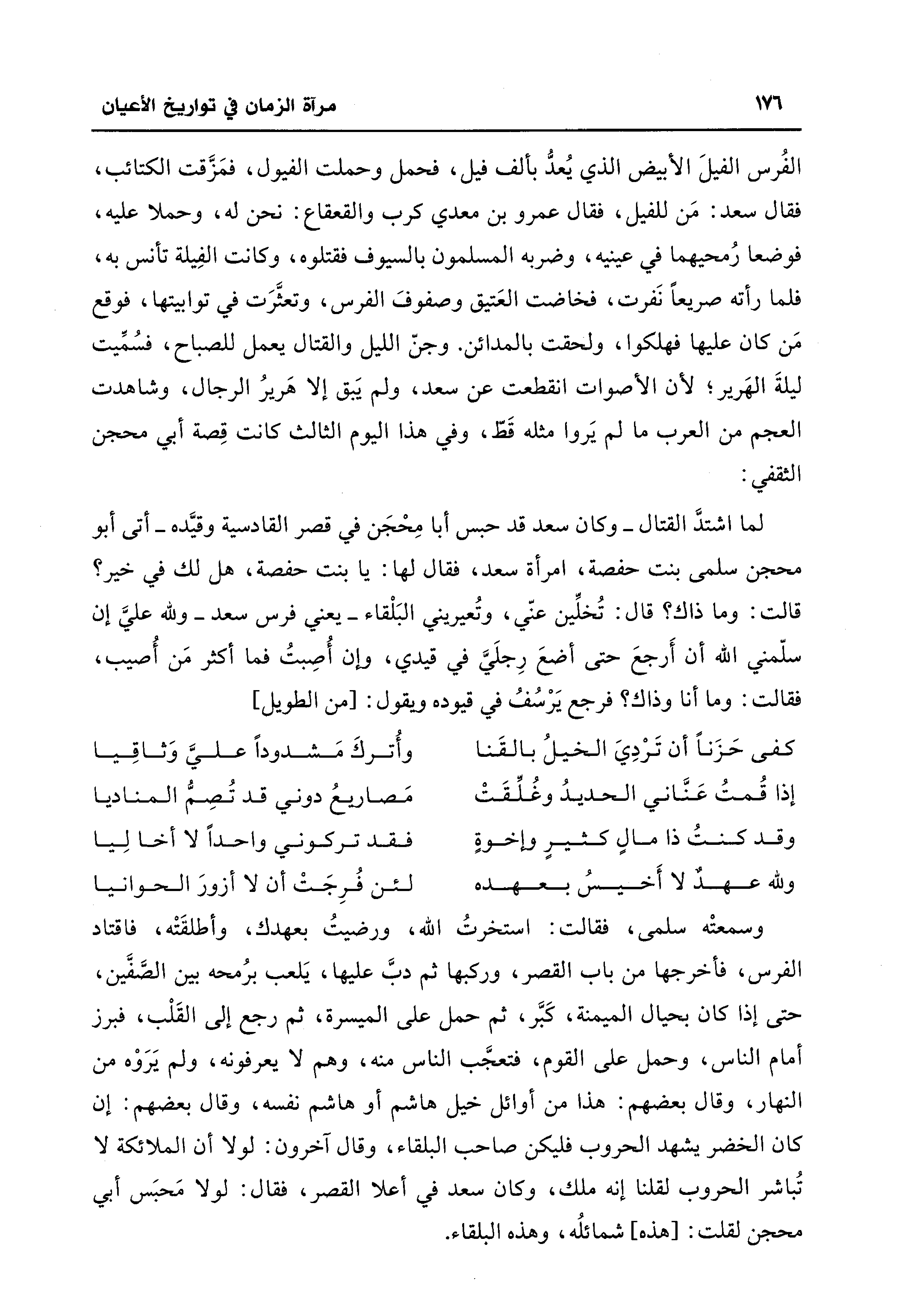 لما اشتدَّ القتال -وكان سعد قد حبس أبا مِحْجَن في قصر القادسية وقيَّده- أتى أبو محجن سلمى بنت حفصة، امرأة سعد، فقال لها: يا بنت حفصة، هل لك في خير؟ قالت: وما ذاك؟ قال: تُخلِّين عنّي، وتُعيريني البَلْقاء -يعني فرس سعد- وللَّه عليَّ إن سلّمني اللَّه أن أَرجعَ حتى أضعَ رِجلَيَّ في قيدي، وإن أُصِبتُ فما أكثر مَن أُصيب، فقالت: وما أنا وذاك؟ فرجع يَرْسُفُ في قيوده ويقول: [من الطويل]