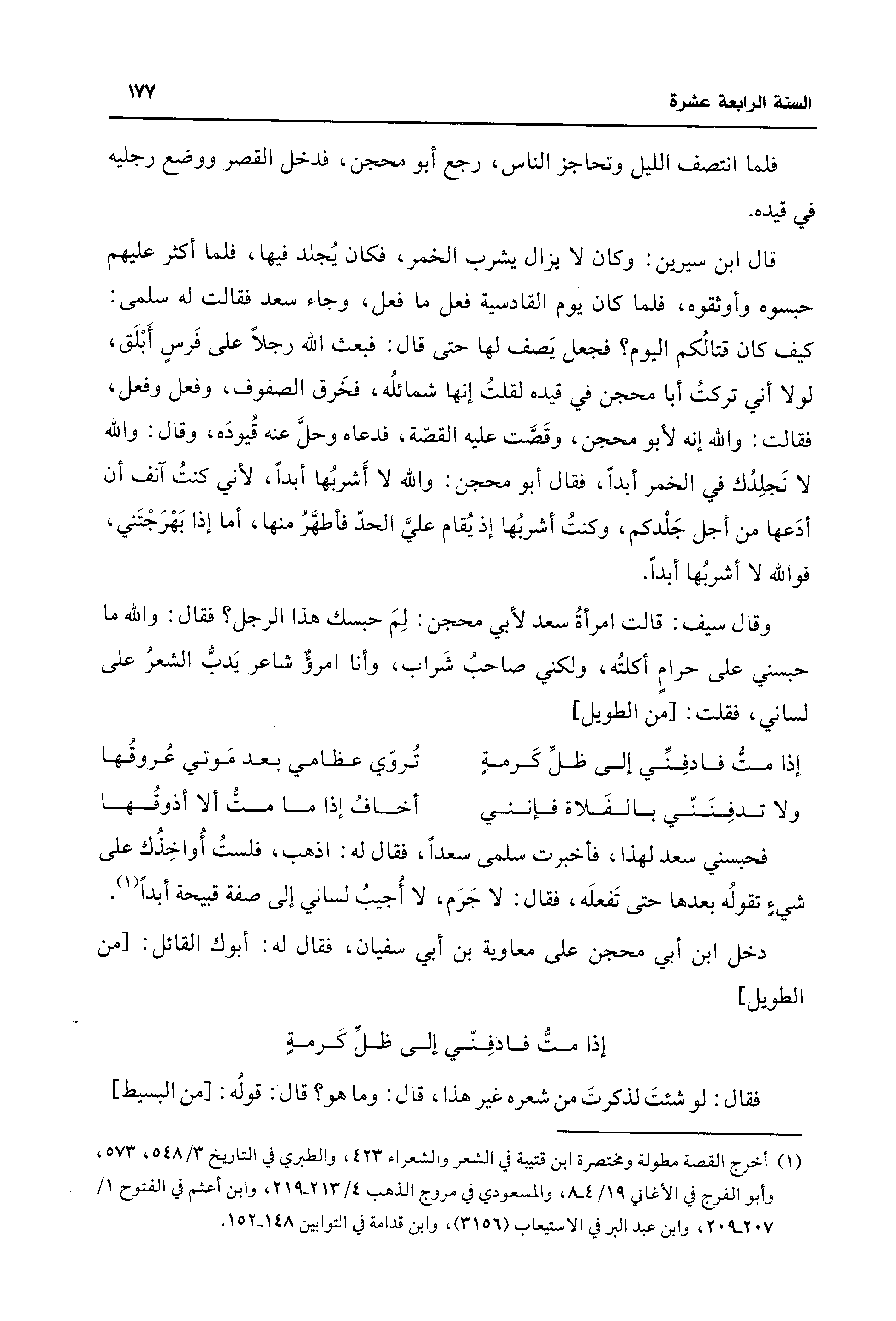 وقال سيف: قالت امرأةُ سعد لأبي محجن: لِمَ حبسك هذا الرجل؟ فقال: واللَّه ما حبسني على حرامٍ أكلتُه، ولكني صاحبُ شَراب، وأنا امرؤٌ شاعر يَدبُّ الشعرُ على لساني، فقلت: [من الطويل]