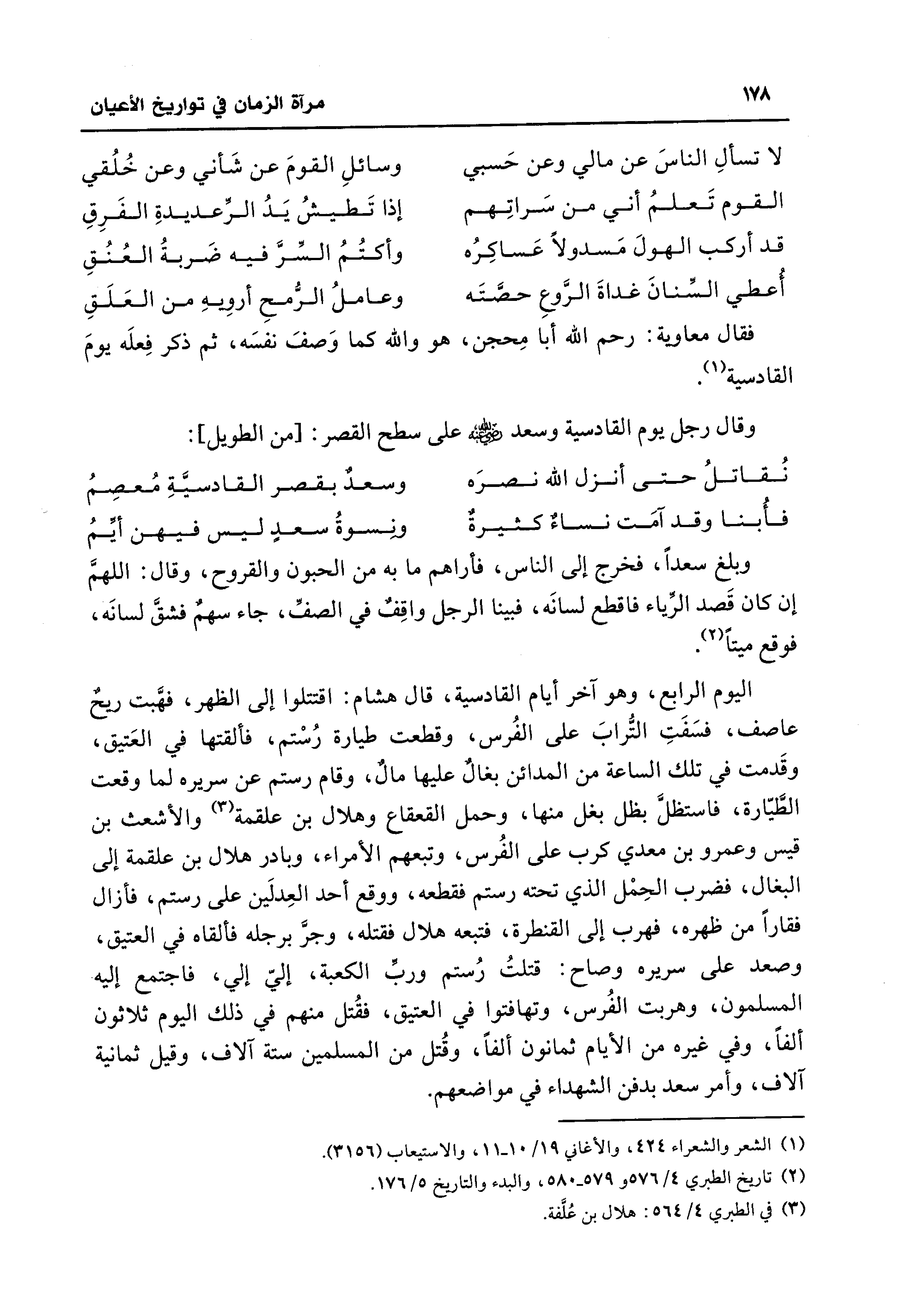 اليوم الرابع، وهو آخر أيام القادسية، قال هشام: اقتتلوا إلى الظهر، فهَّبت ريحٌ عاصف، فسَفَتِ التُّرابَ على الفُرس، وقطعت طيارة رُسْتم، فألقتها في العَتيق، وقَدمت في تلك الساعة من المدائن بغالٌ عليها مالٌ، وقام رستم عن سريره لما وقعت الطَّيّارة، فاستظلَّ بظل بغل منها، وحمل القعقاع وهلال بن علقمة (¬3) والأشعث بن قيس وعمرو بن معدي كرب على الفُرس، وتبعهم الأمراء، وبادر هلال بن علقمة إلى البغال، فضرب الحِمْل الذي تحته رستم فقطعه، ووقع أحد العِدلَين على رستم، فأزال فقارًا من ظهره، فهرب إلى القنطرة، فتبعه هلال فقتله، وجرَّ برجله فألقاه في العتيق، وصعد على سريره وصاح: قتلتُ رُستم وربِّ الكعبة، إليّ إلي، فاجتمع إليه المسلمون، وهربت الفُرس، وتهافتوا في العتيق، فقُتل منهم في ذلك اليوم ثلاثون ألفًا، وفي غيره من الأيام ثمانون ألفًا، وقُتل من المسلمين ستة آلاف، وقيل ثمانية آلاف، وأمر سعد بدفن الشهداء في مواضعهم.