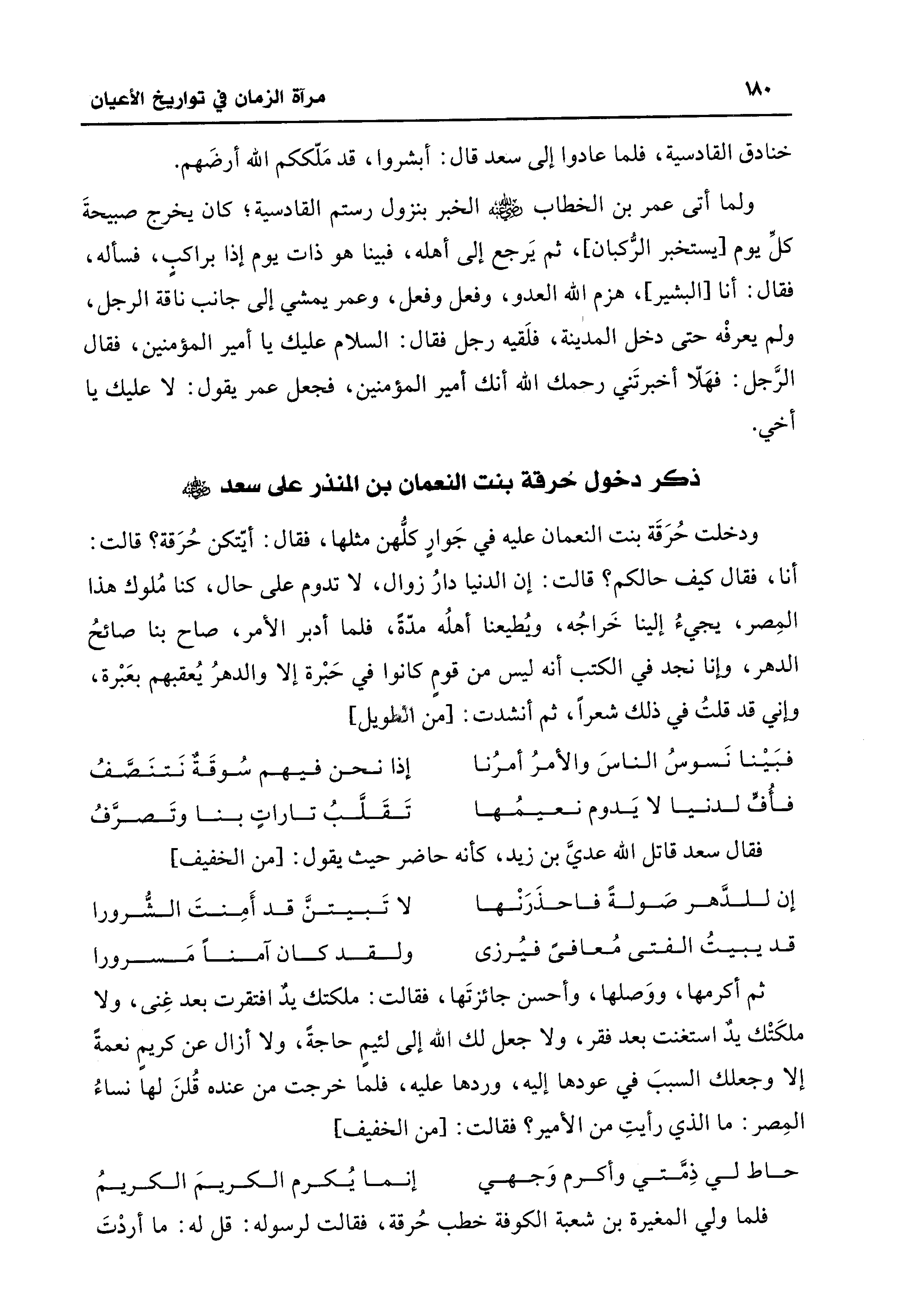 ودخلت حُرَقَة بنت النعمان عليه في جَوارٍ كلُّهن مثلها، فقال: أيّتكن حُرَقة؟ قالت: أنا، فقال كيف حالكم؟ قالت: إن الدنيا دارُ زوال، لا تدوم على حال، كنا مُلوك هذا المِصر، يجيءُ إلينا خَراجُه، ويُطيعنا أهلُه مدّةً، فلما أدبر الأمر، صاح بنا صائحُ الدهر، وإنا نجد في الكتب أنه ليس من قومٍ كانوا في حَبْرة إلا والدهرُ يُعقبهم بعَبْرة، وإني قد قلتُ في ذلك شعرًا، ثم أنشدت: [من الطويل]
