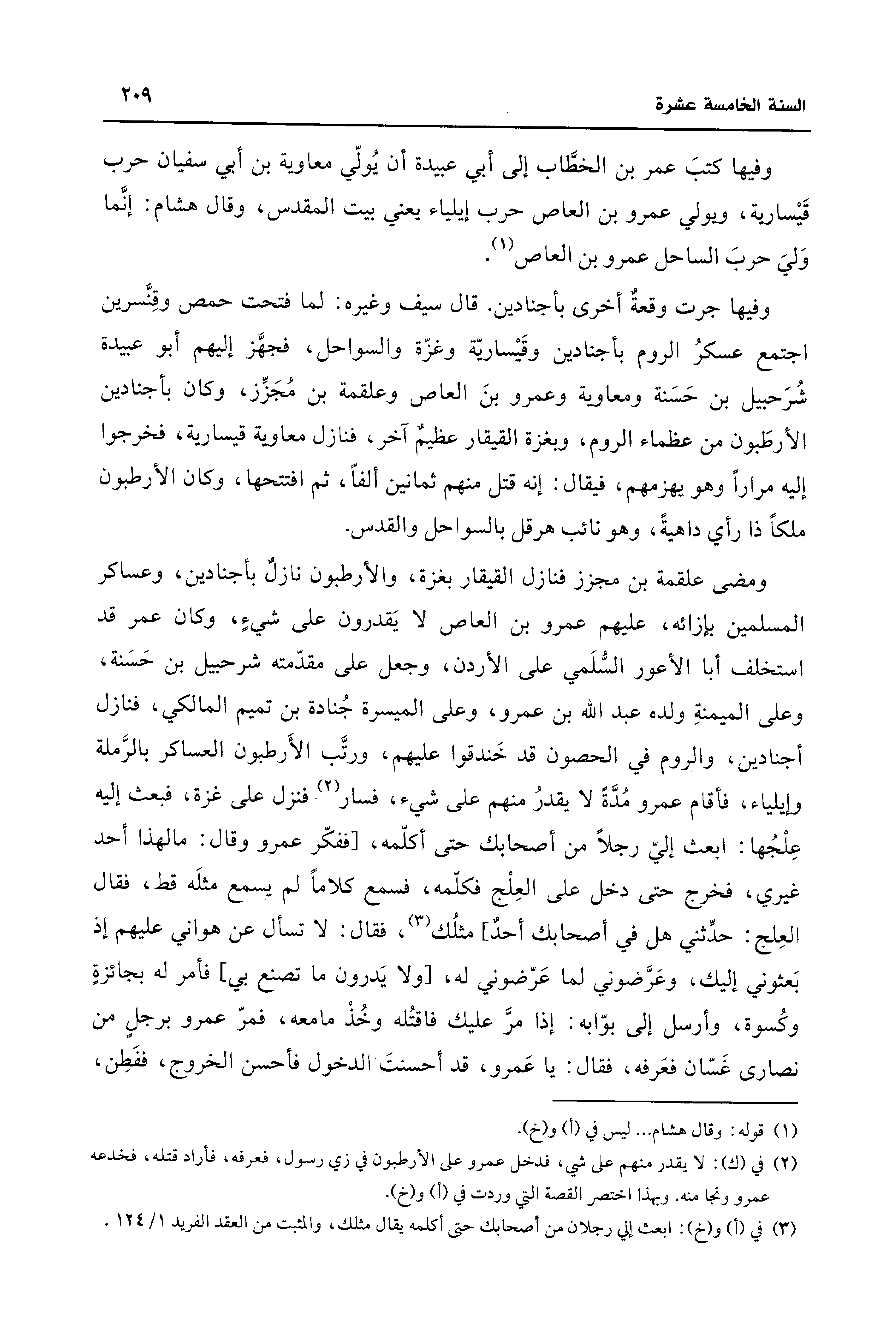 وفيها كتبَ عمر بن الخطَّاب إلى أبي عبيدة أن يُولّي معاوية بن أبي سفيان حرب قَيْسارية، ويولي عمرو بن العاص حرب إيلياء يعني بيت المقدس، وقال هشام: إنَّما وَليَ حربَ الساحل عمرو بن العاص (¬1).