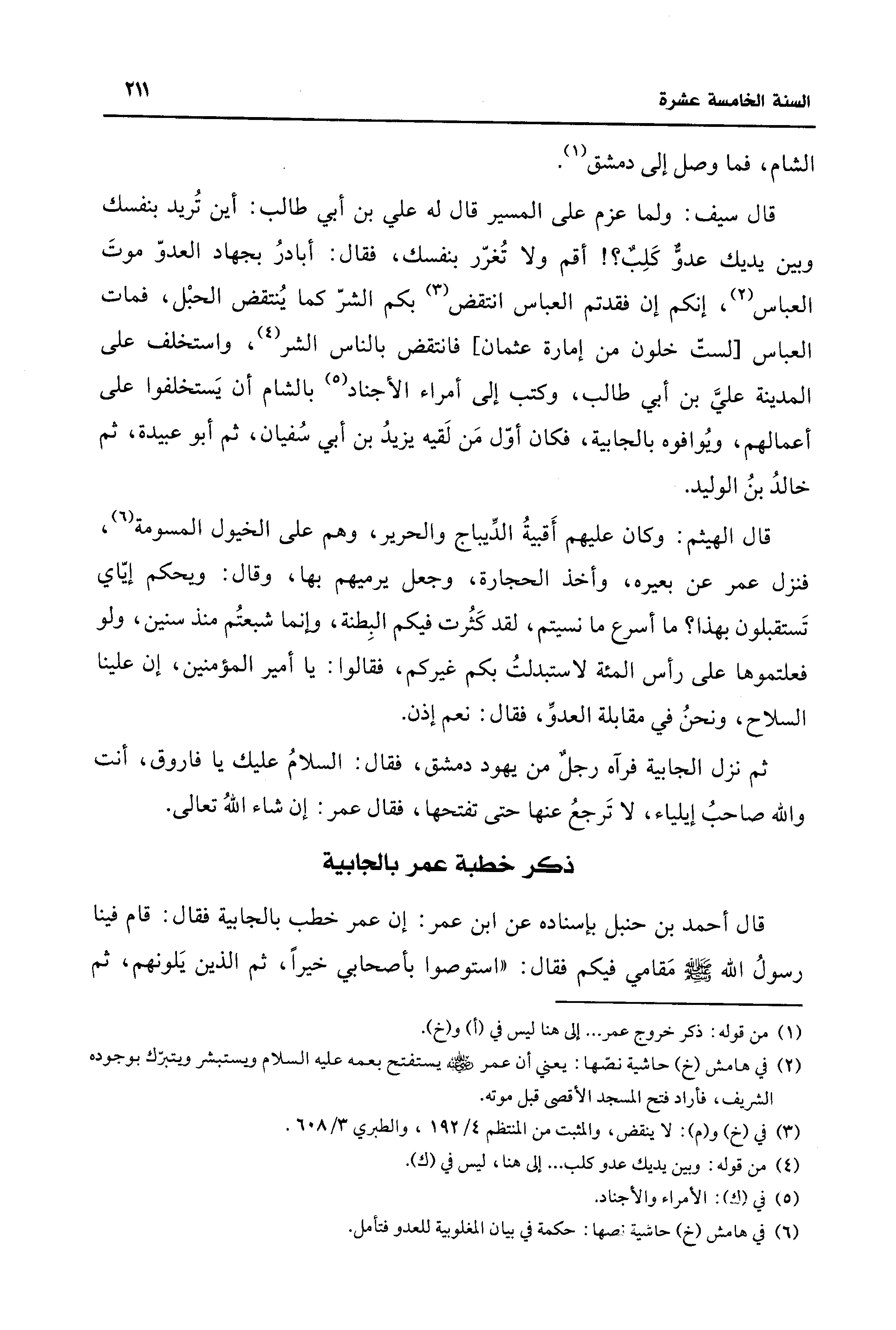قال سيف: ولما عزم على المسير قال له علي بن أبي طالب: أين تُريد بنفسك وبين يديك عدوٌّ كَلِبٌ؟ ! أقم ولا تُغرّر بنفسك، فقال: أبادرُ بجهاد العدوّ موتَ العباس (¬2)، إنكم إن فقدتم العباس انتقض (¬3) بكم الشرّ كما يُنتقض الحبْل، فمات العباس [لستّ خلون من إمارة عثمان] فانتقض بالنَّاس الشر (¬4)، واستخلف على المدينة عليَّ بن أبي طالب، وكتب إلى أمراء الأجناد (¬5) بالشام أن يَستخلفوا على أعمالهم، ويُوافوه بالجابية، فكان أوّل مَن لَقيه يزيدُ بن أبي سُفيان، ثم أبو عبيدة، ثم خالدُ بنُ الوليد.