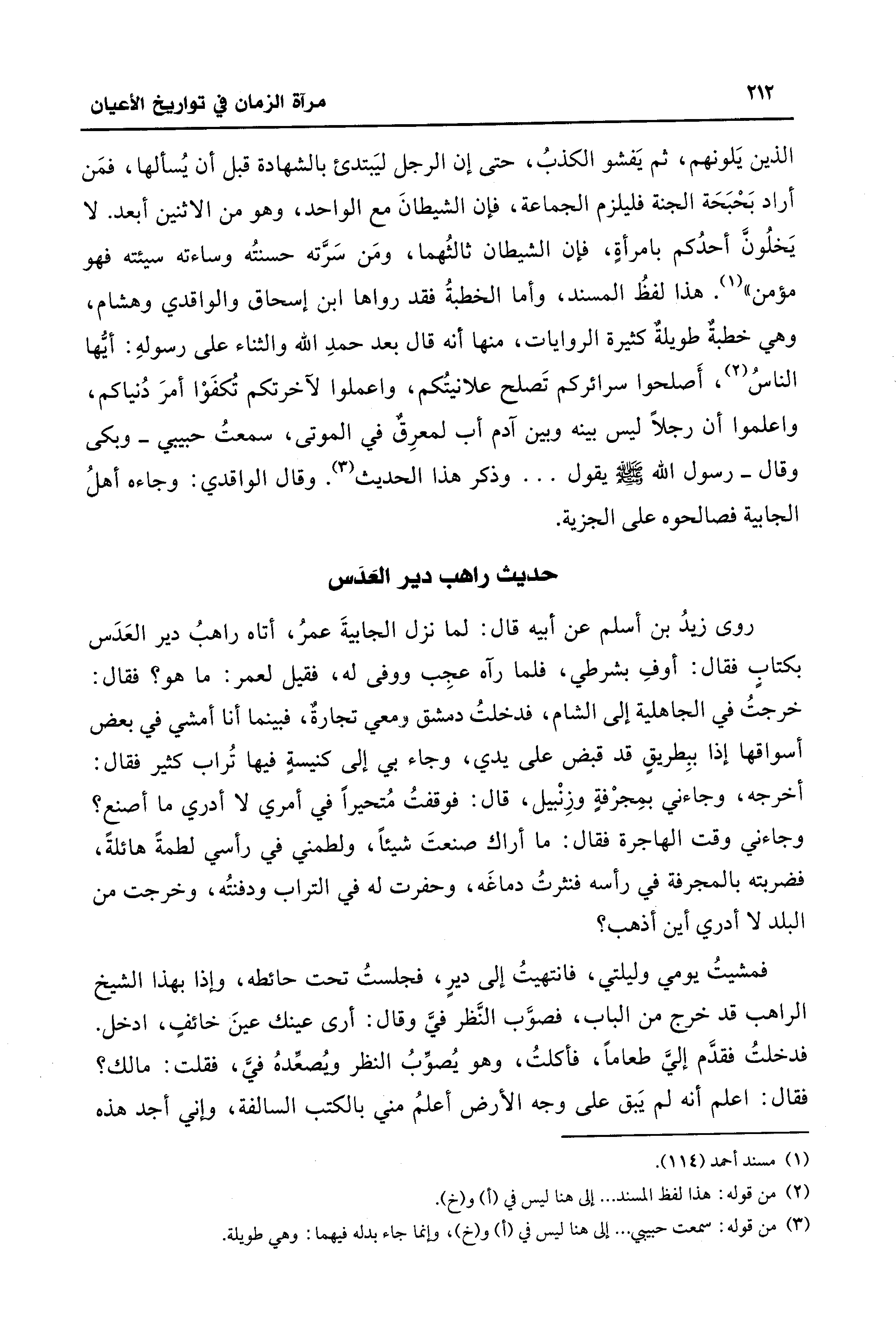 فمشيتُ يومي وليلتي، فانتهيتُ إلى ديرٍ، فجلستُ تحت حائطه، وإذا بهذا الشيخ الراهب قد خرج من الباب، فصوَّب النَّظر فيَّ وقال: أرى عينك عينَ خائفٍ، ادخل. فدخلتُ فقدَّم إليَّ طعامًا، فأكلتُ، وهو يُصوِّبُ النظر ويُصعِّدهُ فيَّ، فقلت: مالك؟ فقال: أعلم أنه لم يَبق على وجه الأرض أعلمُ مني بالكتب السالفة، وإني أجد هذه