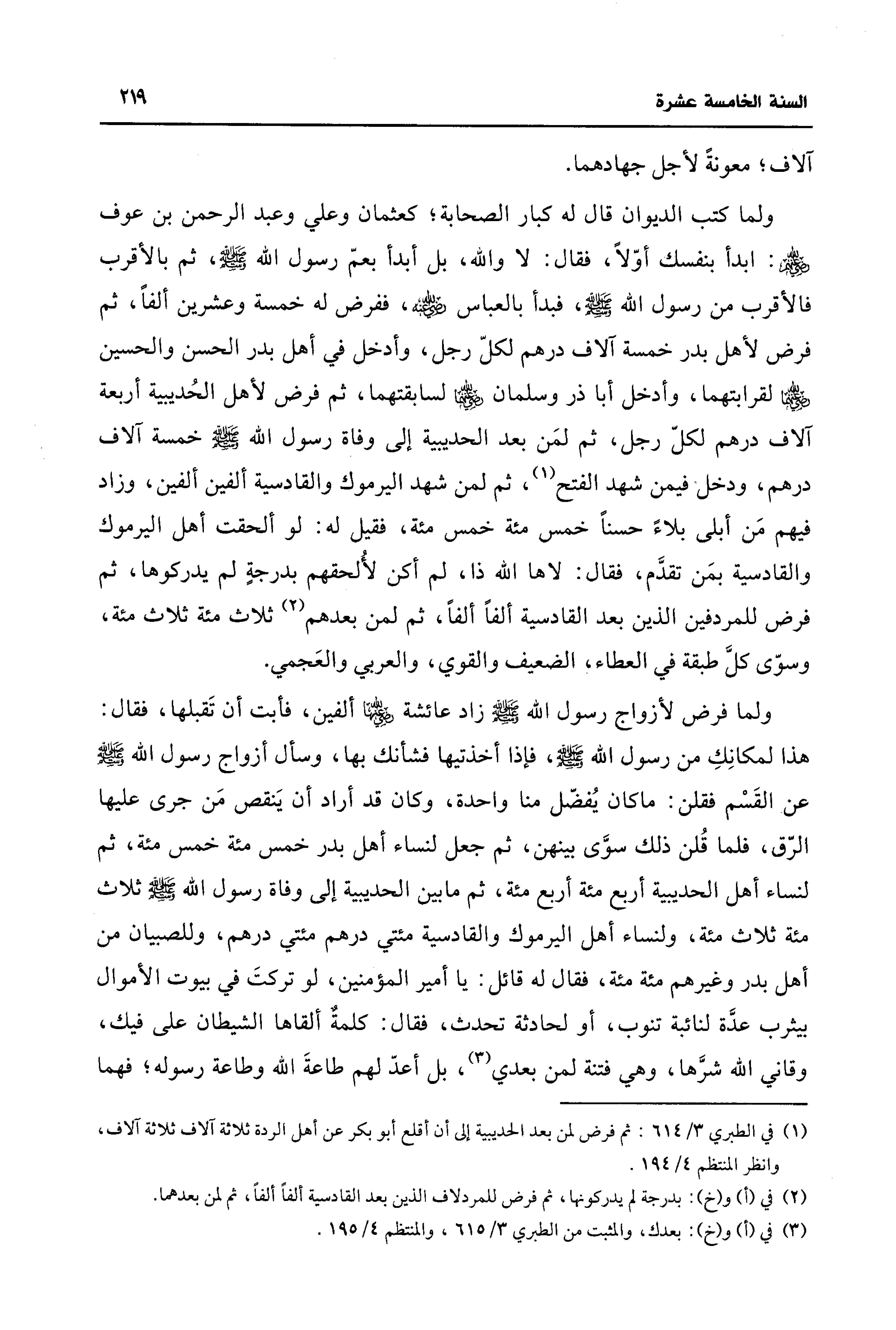 ولما كتب الديوان قال له كبار الصحابة؛ كعثمان وعلي وعبد الرحمن بن عوف -رضي اللَّه عنهم-: ابدأ بنفسك أوّلَا، فقال: لا واللَّه، بل أبدأ بعمّ رسول اللَّه -صلى اللَّه عليه وسلم-، ثم بالأقرب فالأقرب من رسول اللَّه -صلى اللَّه عليه وسلم-، فبدأ بالعباس -رضي اللَّه عنه-، ففرض له خمسة وعشرين ألفًا، ثم فرض لأهل بدر خمسة آلاف درهم لكلّ رجل، وأدخل في أهل بدر الحسن والحسين -رضي اللَّه عنهما- لقرابتهما، وأدخل أَبا ذر وسلمان -رضي اللَّه عنهما- لسابقتهما، ثم فرض لأهل الحُديبية أربعة آلاف درهم لكلّ رجل، ثم لمَن بعد الحديبية إلى وفاة رسول اللَّه -صلى اللَّه عليه وسلم- خمسة آلاف درهم، ودخل فيمن شهد الفتح (¬1)، ثم لمن شهد اليرموك والقادسية ألفين ألفين، وزاد فيهم مَن أبلى بلاءً حسنًا خمس مئة خمس مئة، فقيل له: لو ألحقت أهل اليرموك والقادسية بمَن تقدَّم، فقال: لاها اللَّه ذا، لم أكن لأُلحقهم بدرجةٍ لم يدركوها، ثم فرض للمردفين الذين بعد القادسية ألفًا ألفًا، ثم لمن بعدهم (¬2) ثلاث مئة ثلاث مئة، وسوّى كلَّ طبقة في العطاء, الضعيف والقوي، والعربي والعَجمي.