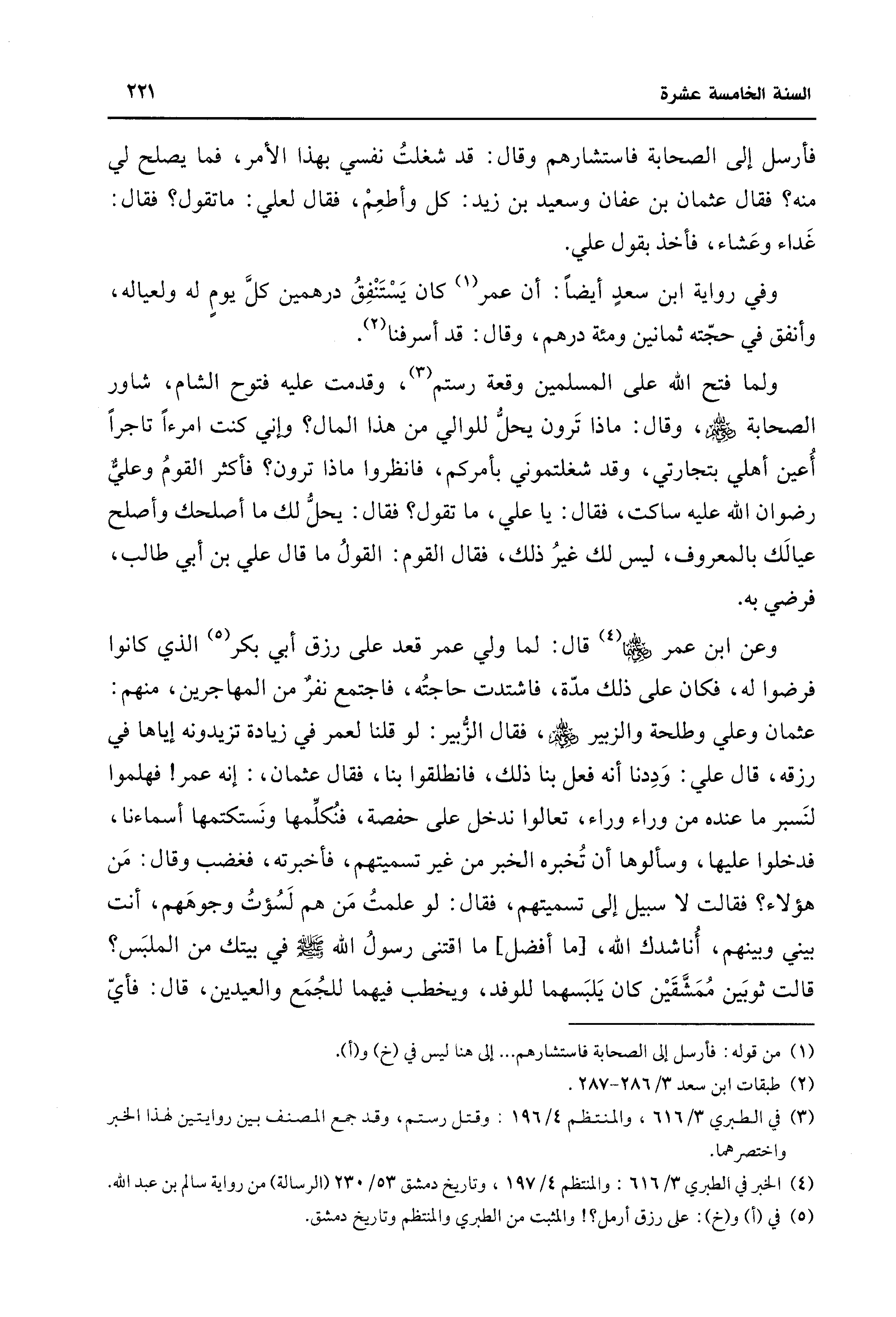 ولما فتح اللَّه على المسلمين وقعة رستم (¬3)، وقدمت عليه فتوح الشام، شاور الصحابة -رضي اللَّه عنهم-، وقال: ماذا تَرون يحلُّ للوالي من هذا المال؟ وإني كنت امرءًا تاجرًا أُعين أهلي بتجارتي، وقد شغلتموني بأمركم، فانظروا ماذا ترون؟ فأكثر القومُ وعليٌّ رضوان اللَّه عليه ساكت، فقال: يا علي، ما تقول؟ فقال: يحلُّ لك ما أصلحك وأصلح عيالَك بالمعروف، ليس لك غيرُ ذلك، فقال القوم: القولُ ما قال علي بن أبي طالب، فرضي به.