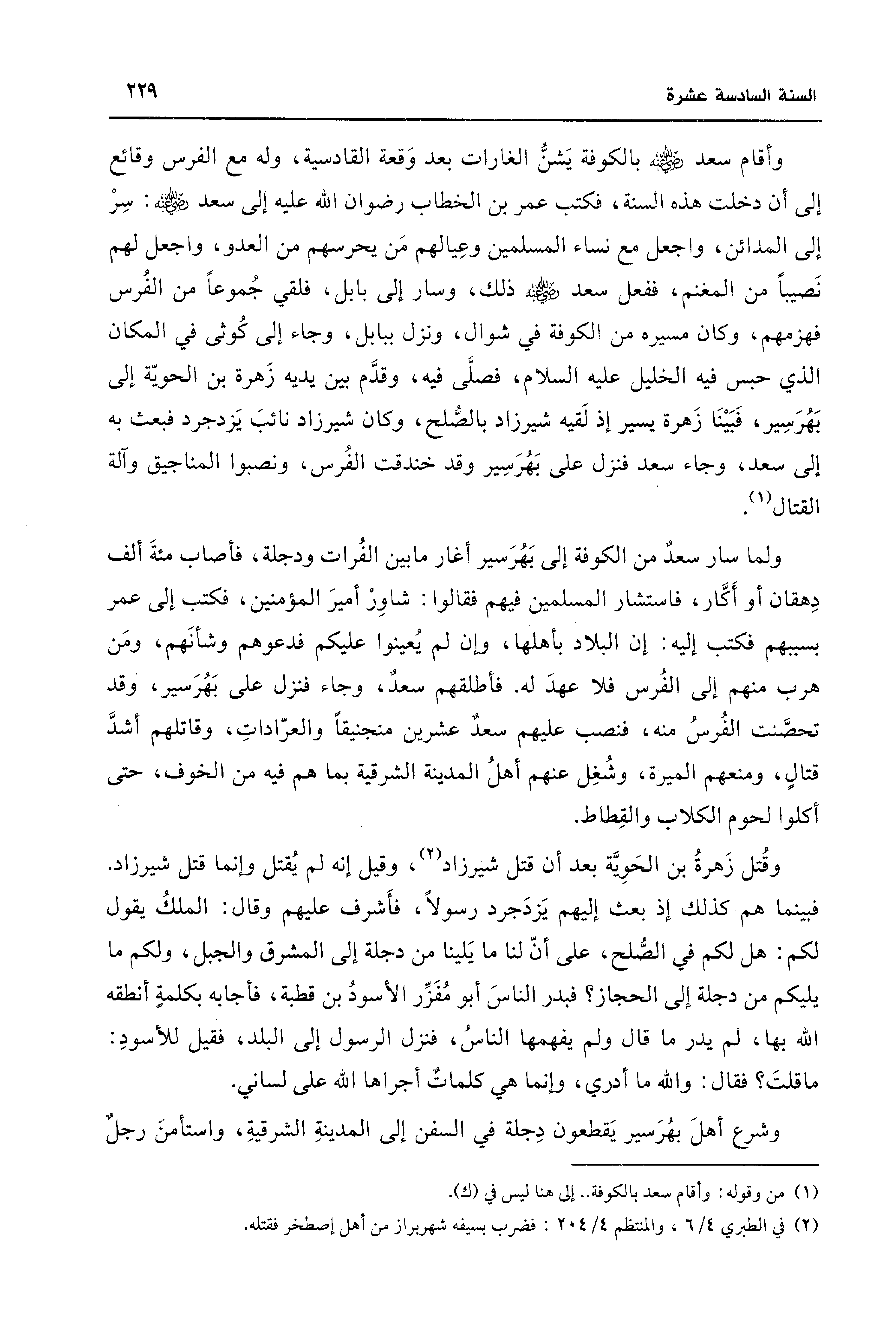 وأقام سعد -رضي اللَّه عنه- بالكوفة يَشنُّ الغارات بعد وَقعة القادسية، وله مع الفرس وقائع إلى أن دخلت هذه السنة، فكتب عمر بن الخطاب رضوان اللَّه عليه إلى سعد -رضي اللَّه عنه-: سِرْ إلى المدائن، واجعل مع نساء المسلمين وعِيالهم مَن يحرسهم من العدو، واجعل لهم نَصيبًا من المغنم، ففعل سعد -رضي اللَّه عنه- ذلك، وسار إلى بابل، فلقي جُموعًا من الفُرس فهزمهم، وكان مسيره من الكوفة في شوال، ونزل ببابل، وجاء إلى كُوثى في المكان الذي حبس فيه الخليل عليه السلام، فصلَّى فيه، وقدَّم بين يديه زَهرة بن الحويّة إلى بَهُرَسِير، فَبَيْنَا زَهرة يسير إذ لَقيه شيرزاد بالصَّلح، وكان شيرزاد نائبَ يَزدجرد فبعث به إلى سعد، وجاء سعد فنزل على بَهُرَسِير وقد خندقت الفُرس، ونصبوا المناجيق وآلة القتال (¬1).