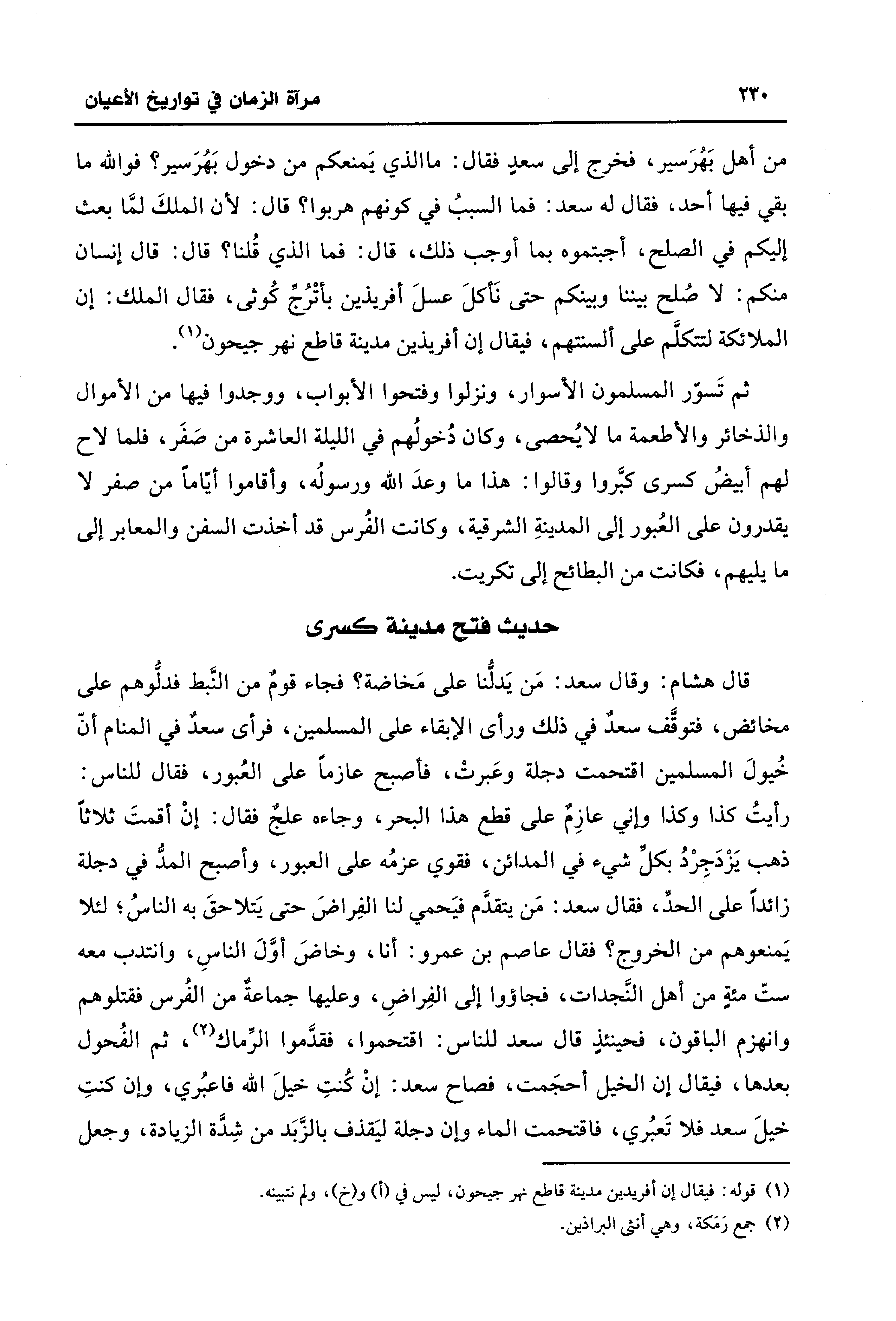 من أهل بَهُرَسير، فخرج إلى سعدٍ فقال: ما الذي يَمنعكم من دخول بَهُرَسير؟ فواللَّه ما بقي فيها أحد، فقال له سعد: فما السببُ في كونهم هربوا؟ قال: لأن الملكَ لمَّا بعث إليكم في الصلح، أجبتموه بما أوجب ذلك، قال: فما الذي قُلنا؟ قال: قال إنسان منكم: لا صُلح بيننا وبينكم حتى نَأكلَ عسلَ أفريذين بأتْرُجِّ كُوثى، فقال الملك: إن الملائكة لتتكلَّم على ألسنتهم، فيقال إن أفريذين مدينة قاطع نهر جيحون (¬1).