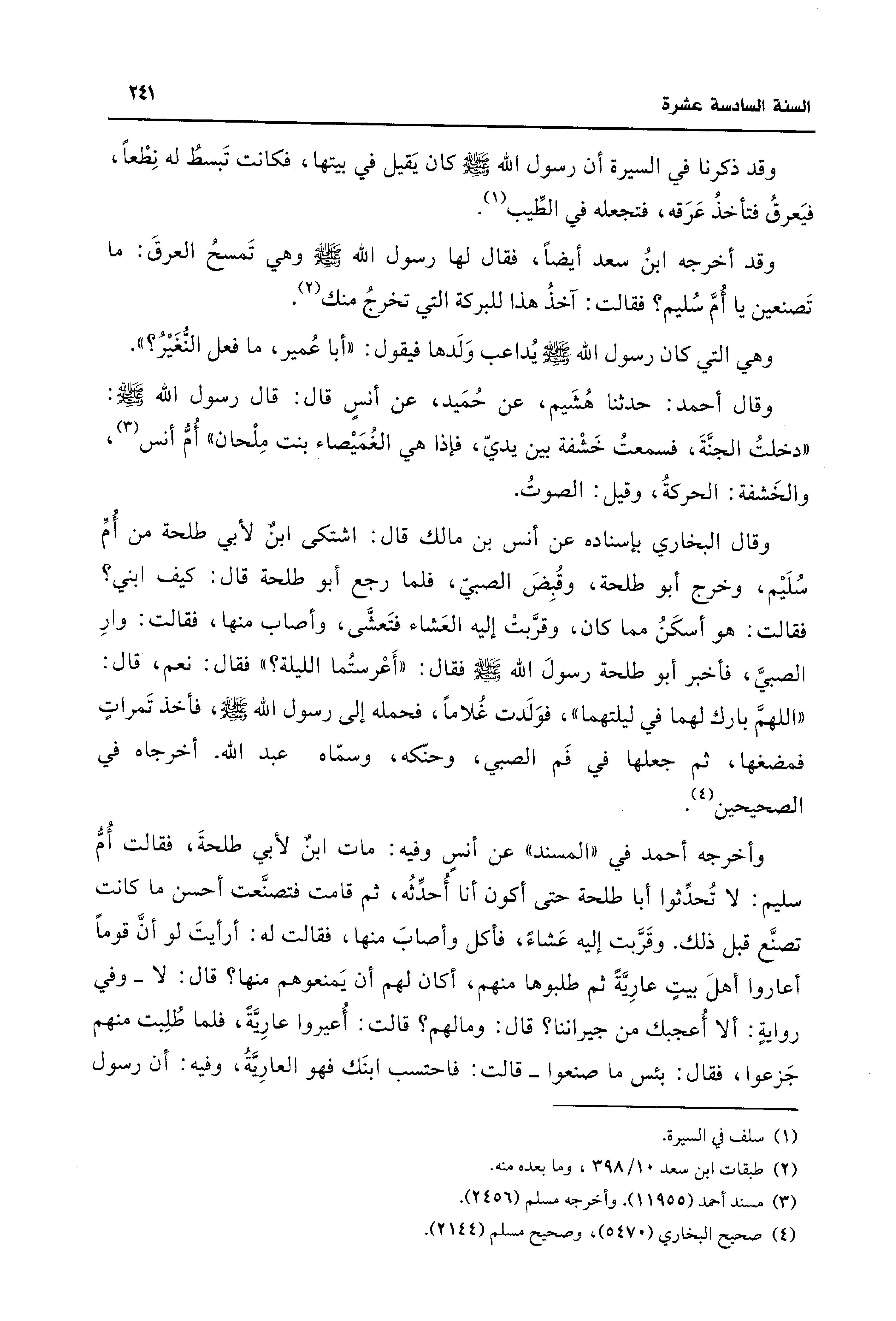 وقد أخرجه ابنُ سعد أيضًا، فقال لها رسول اللَّه -صلى اللَّه عليه وسلم- وهي تَمسحُ العرقَ: ما تَصنعين يَا أُمَّ سُليم؟ فقالت: آخذُ هذا للبركة التي تخرجُ منك (¬2).