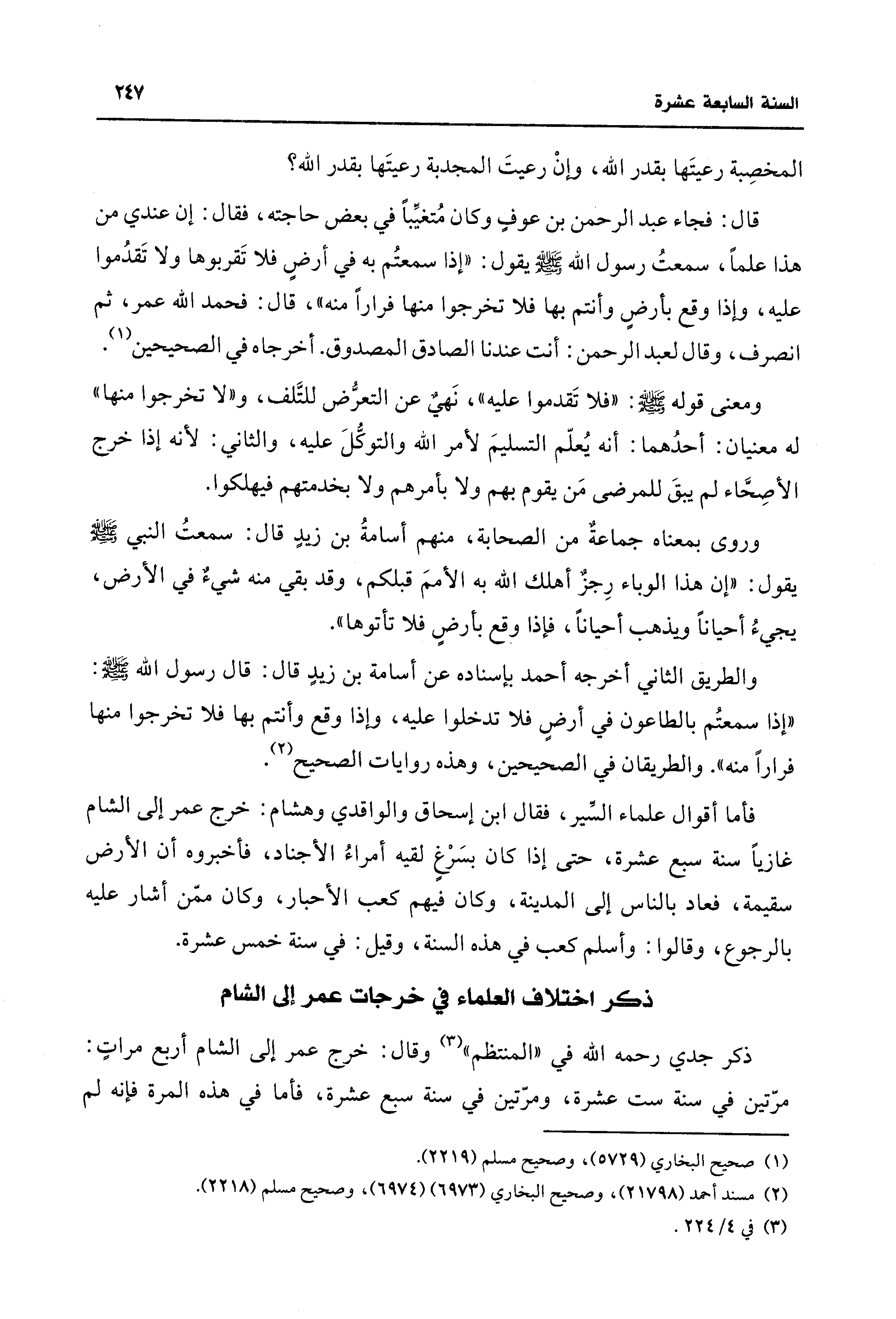 قال: فجاء عبد الرحمن بن عوفٍ وكان مُتغيِّبًا في بعض حاجته، فقال: إن عندي من هذا علمًا، سمعتُ رسول اللَّه -صلى اللَّه عليه وسلم- يقول: "إذا سمعتُم به في أرضٍ فلا تَقربوبها ولا تَقدُموا عليه، وإذا وقع بأرضٍ وأنتم بها فلا تخرجوا منها فرارًا مَنه"، قال: فحمد اللَّه عمر، ثم انصرف، وقال لعبد الرحمن: أنت عندنا الصادق المصدوق، أخرجاه في الصحيحين (¬1).
