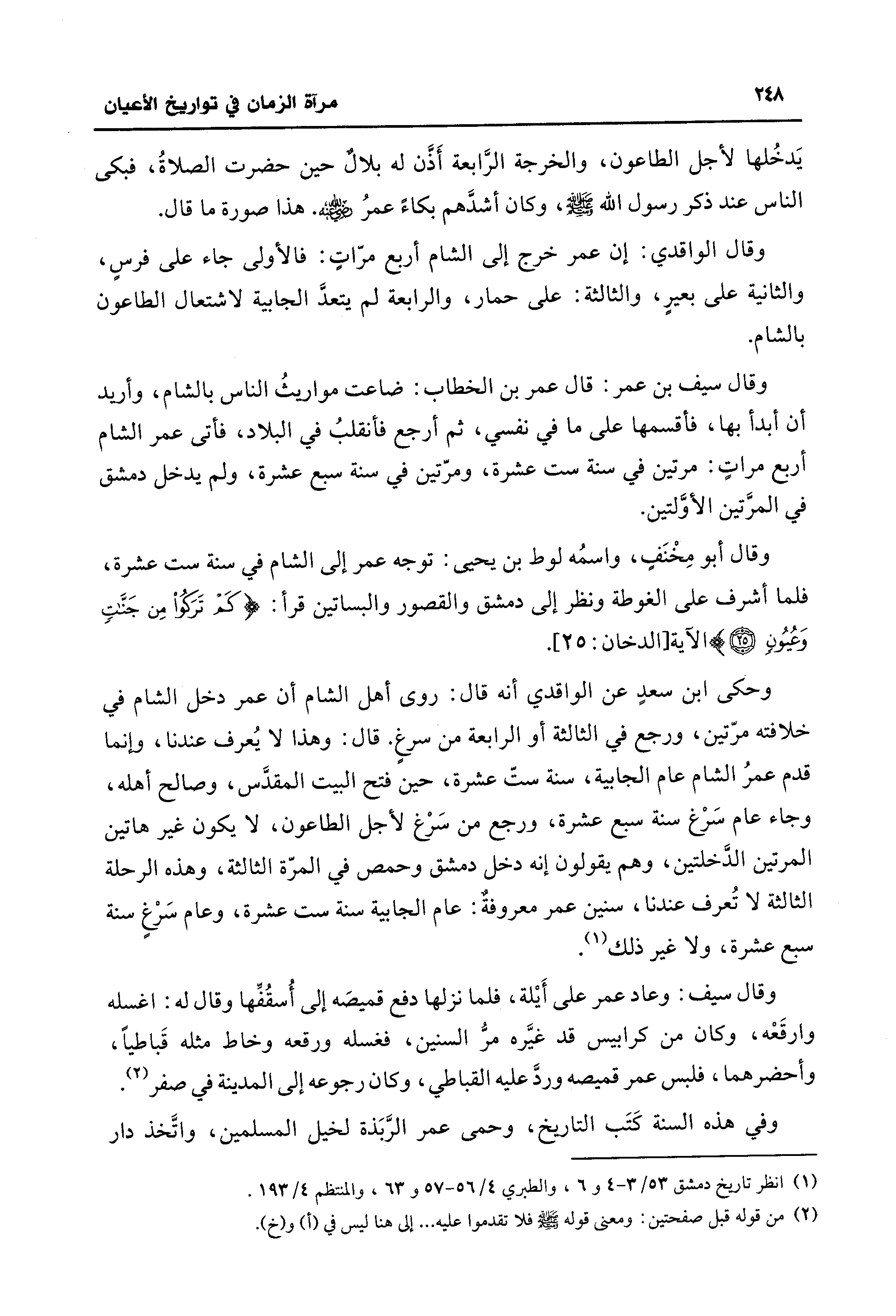 وحكى ابن سعدٍ عن الواقدي أنه قال: روى أهل الشام أن عمر دخل الشام في خلافته مرّتين، ورجع في الثالثة أو الرابعة من سرغٍ. قال: وهذا لا يُعرف عندنا، وإنما قدم عمرُ الشام عام الجابية، سنة ستّ عشرة، حين فتح البيت المقدَّس، وصالح أهله، وجاء عام سَرْغ سنة سبع عشرة، ورجع من سَرْغ لأجل الطاعون، لا يكون غير هاتين المرتين الدَّخلتين، وهم يقولون إنه دخل دمشق وحمص في المرّة الثالثة، وهذه الرحلة الثالثة لا تُعرف عندنا، سنين عمر معروفةٌ: عام الجابية سنة ست عشرة، وعام سَرْغٍ سنة سبع عشرة، ولا غير ذلك (¬1).