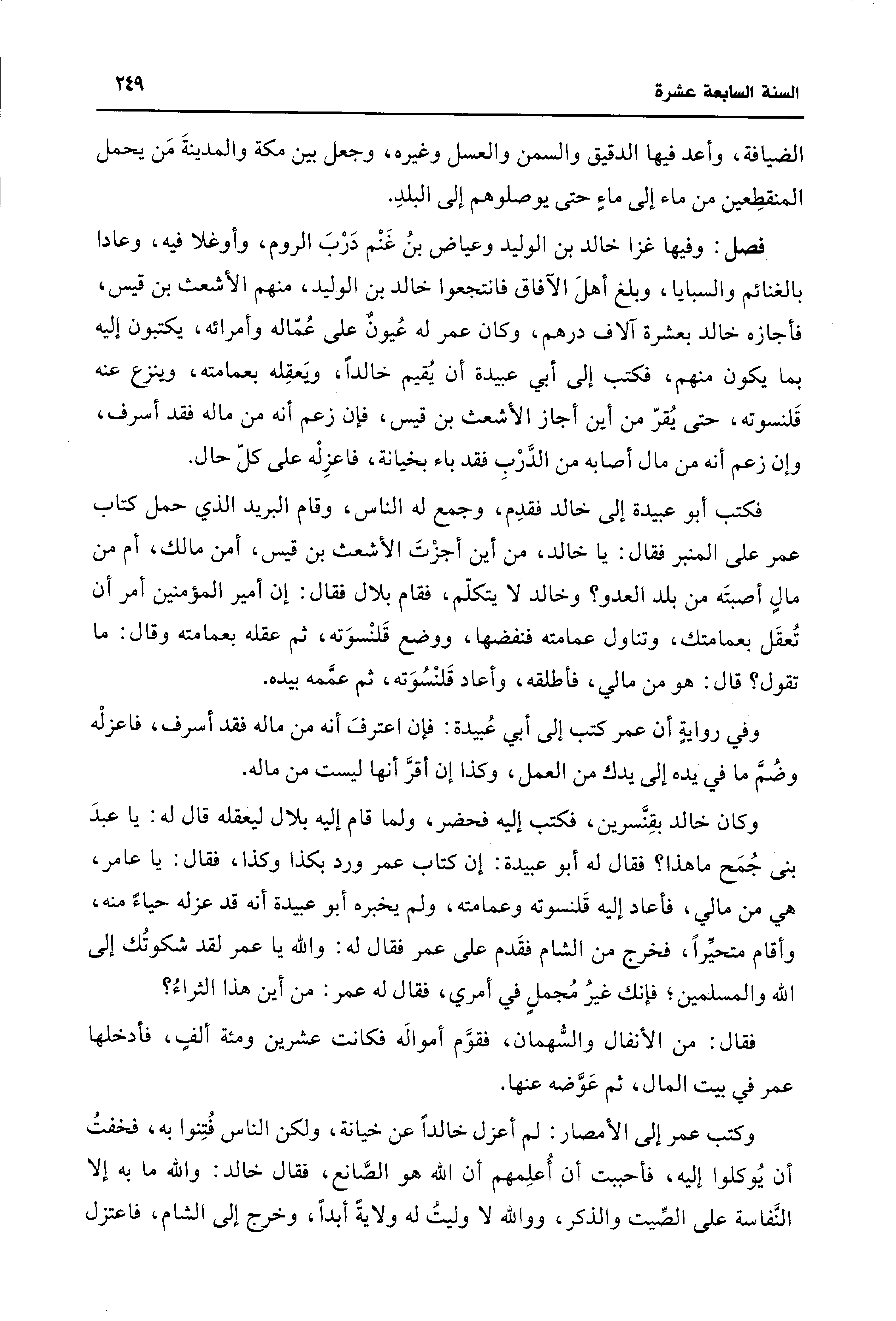 فكتب أبو عبيدة إلى خالد فقدِم، وجمع له الناس، وقام البريد الذي حمل كتاب عمر على المنبر فقال: يا خالد، من أين أجزْتَ الأشعث بن قيس، أمن مالك، أم من مالٍ أصبتَه من بلد العدو؟ وخالد لا يتكلّم، فقام بلال فقال: إن أمير المؤمنين أمر أن تُعقَل بعمامتك، وتناول عمامته فنفضها، ووضع قَلنْسوَته، ثم عقله بعمامته وقال: ما تقول؟ قال: هو من مالي، فأطلقه، وأعاد قَلنْسُوَته، ثم عمَّمه بيده.
