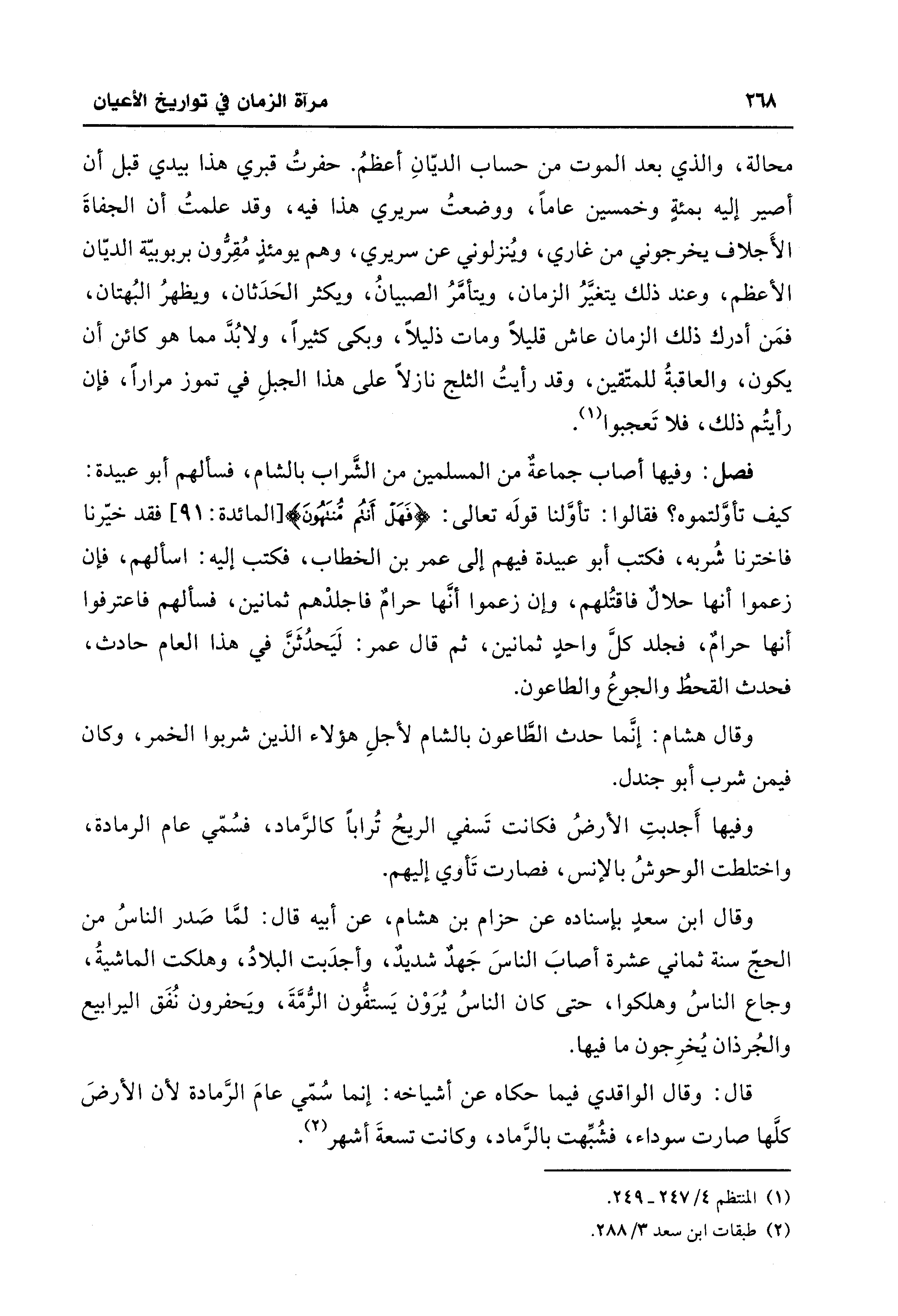 فصل: وفيها أصاب جماعةٌ من المسلمين من الشَّراب بالشام، فسألهم أبو عبيدة: كيف تأوَّلتموه؟ فقالوا: تأوَّلنا قولَه تعالى: {فَهَلْ أَنْتُمْ مُنْتَهُونَ} [المائدة: 91] فقد خيّرنا فاخترنا شُربه، فكتب أبو عبيدة فيهم إلى عمر بن الخطاب، فكتب إليه: اسألهم، فإن زعموا أنها حلالٌ فاقتُلهم، وإن زعموا أنَّها حرامٌ فاجلدْهم ثمانين، فسألهم فاعترفوا أنها حرامٌ، فجلد كلَّ واحد ثمانين، ثم قال عمر: لَيَحدُثَنَّ في هذا العام حادث، فحدث القحطُ والجوعُ والطاعون.