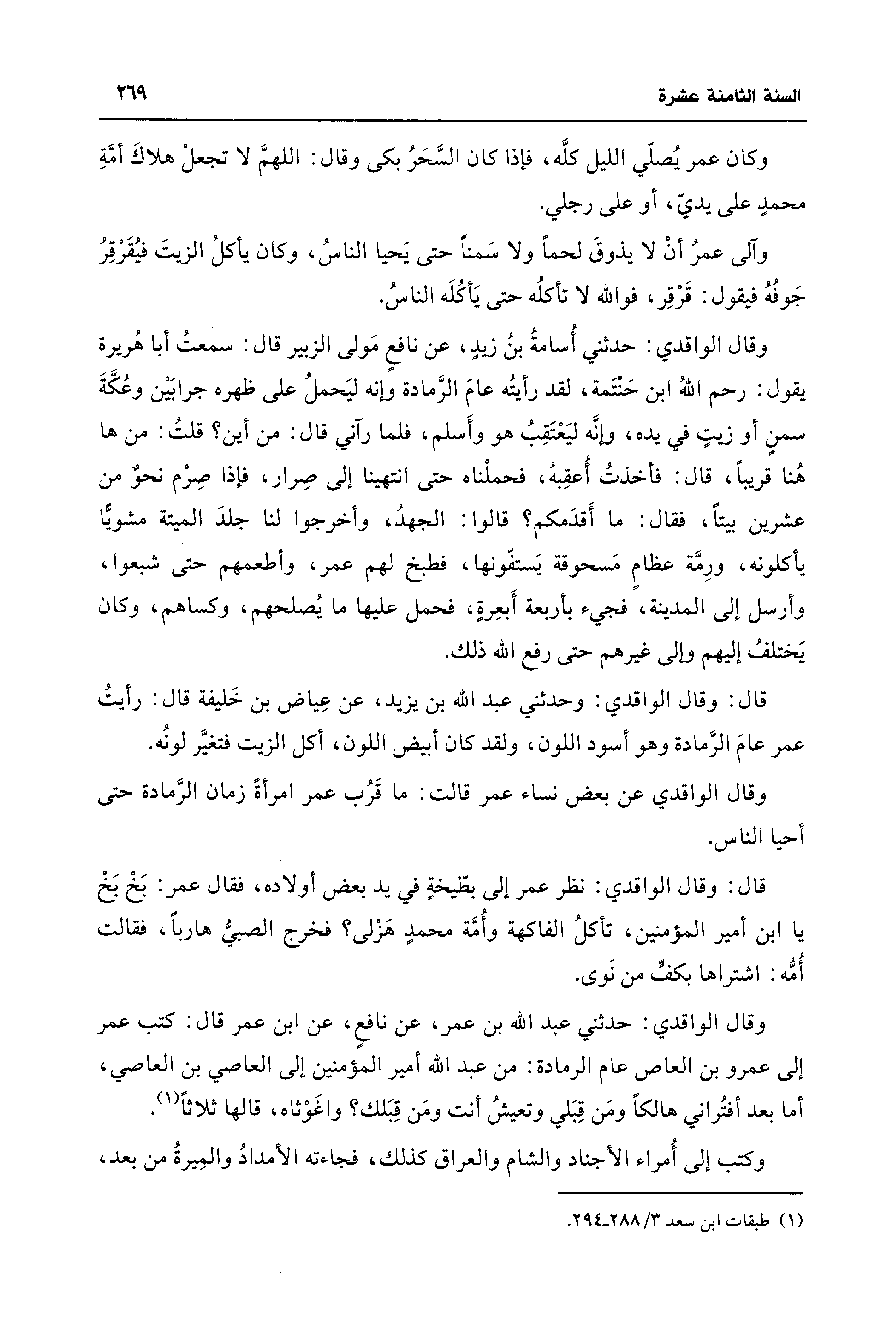 وقال الواقدي: حدثني أُسامةُ بنُ زيدٍ، عن نافعٍ مَولى الزبير قال: سمعتُ أَبا هُريرة يقول: رحم اللَّهُ ابن حَنْتَمة، لقد رأيتُه عامَ الرَّمادة وإنه ليَحملُ على ظهره جرابَيْن وعُكَّةَ سمنٍ أو زيتٍ في يده، وإنَّه ليَعْتَقِبُ هو وأَسلم، فلما رآني قال: من أين؟ قلتُ: من هاهُنا قريبًا، قال: فأخذتُ أُعقِبهُ، فحملْناه حتى انتهينا إلى صِرار، فإذا صِرْم نحوٌ من عشرين بيتًا، فقال: ما أَقدَمكم؟ قالوا: الجهدُ، وأخرجوا لنا جلدَ الميتة مشويًّا يأكلونه، ورِمَّة عظامٍ مَسحوقة يَستفّونها، فطبخ لهم عمر، وأطعمهم حتى شبعوا، وأرسل إلى المدينة، فجيء بأربعة أَبعِرةٍ، فحمل عليها ما يُصلحهم، وكساهم، وكان يَختلفُ إليهم وإلى غيرهم حتى رفع اللَّه ذلك.