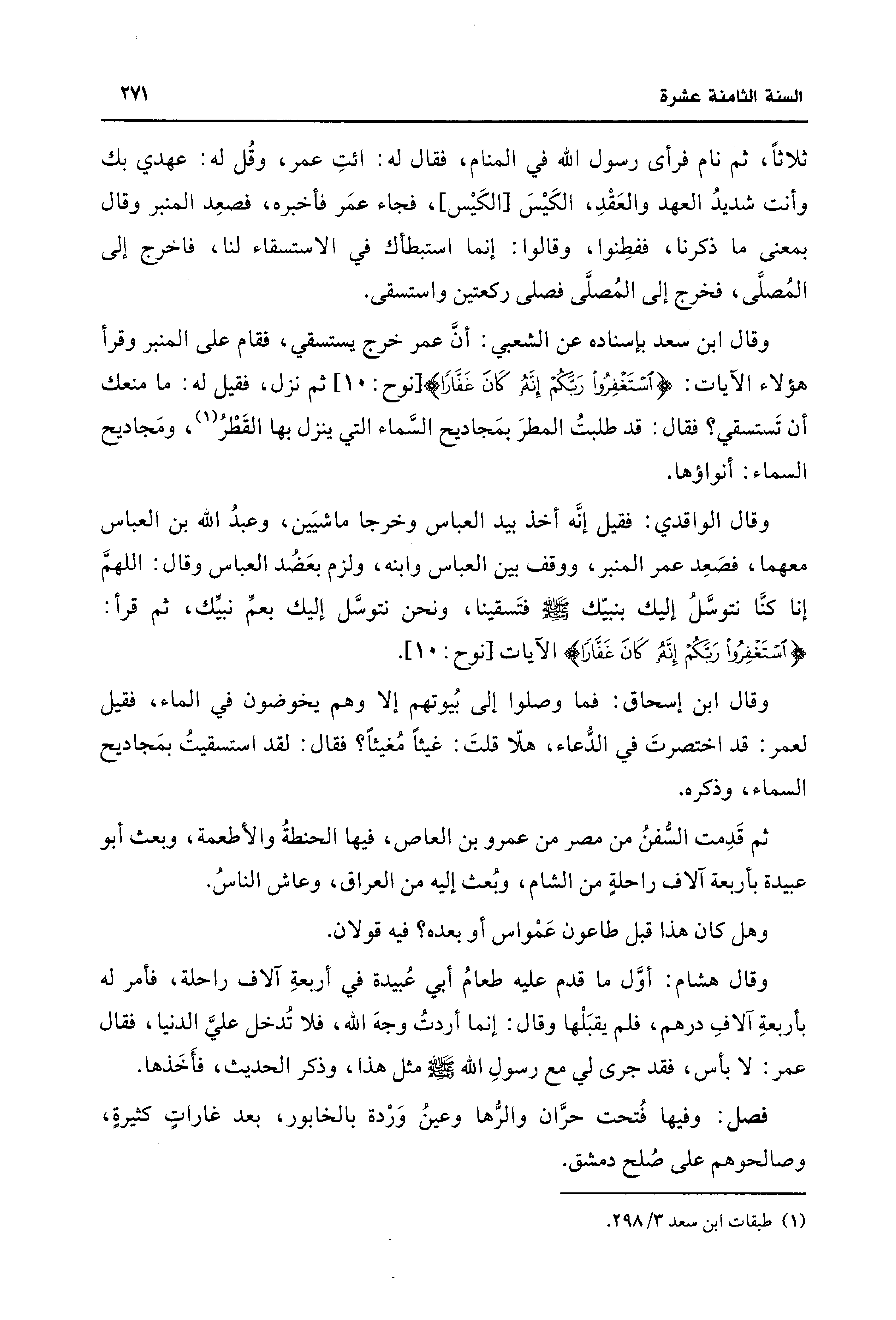وقال الواقدي: فقيل إنَّه أخذ بيد العباس وخرجا ماشيَين، وعبدُ اللَّه بن العباس معهما، فصَعِد عمر المنبر، ووقف بين العباس وابنه، ولزم بعَضُد العباس وقال: اللهمَّ إنَّا كنَّا نتوسَّلُ إليك بنبيّك -صلى اللَّه عليه وسلم- فتَسقينا، ونحن نتوسَّل إليك بعمِّ نبيّك، ثم قرأ: {اسْتَغْفِرُوا رَبَّكُمْ إِنَّهُ كَانَ غَفَّارًا} الآيات [نوح: 10].