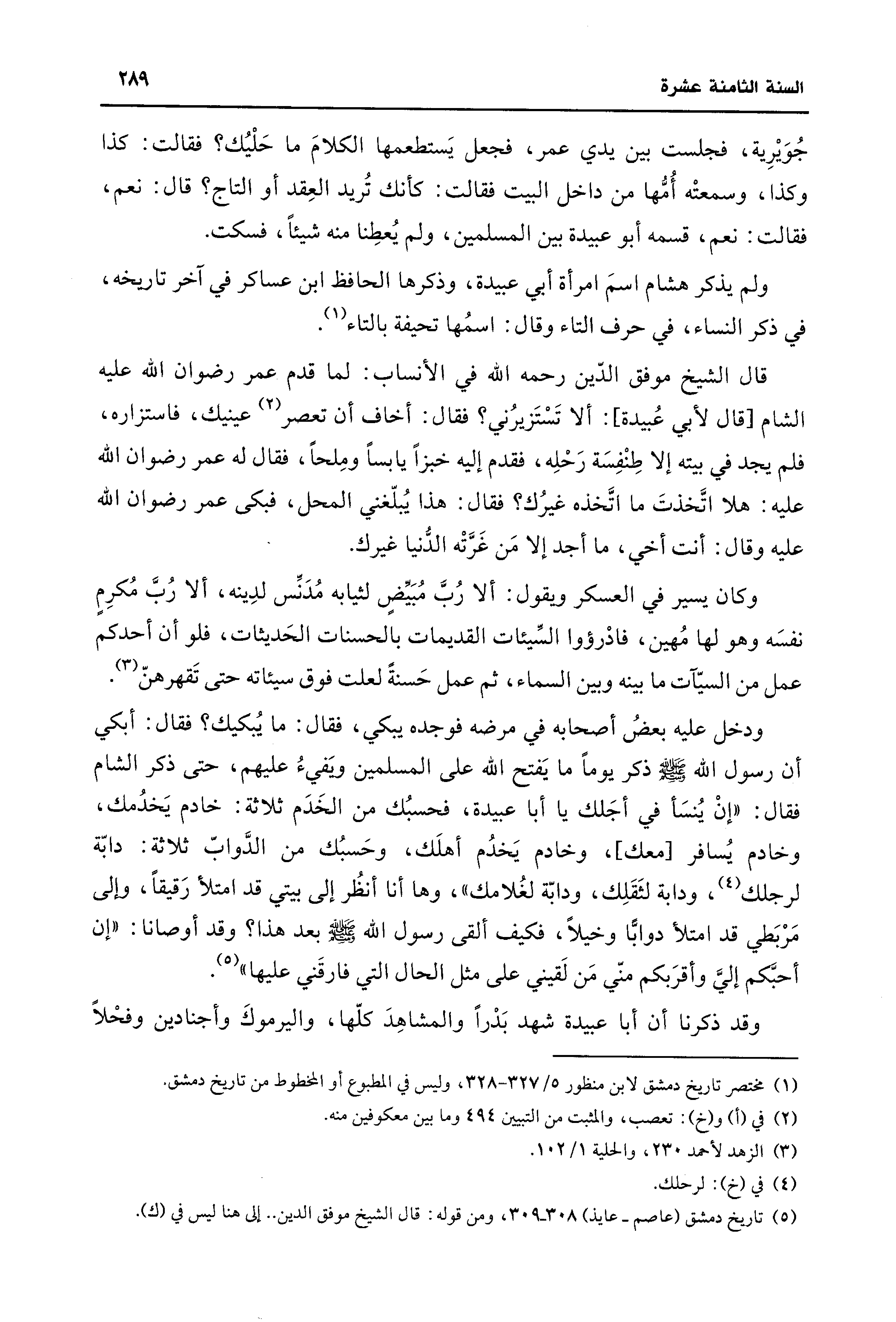 ودخل عليه بعضُ أصحابه في مرضه فوجده يبكي، فقال: ما يُبكيك؟ فقال: أبكي أن رسول اللَّه -صلى اللَّه عليه وسلم- ذكر يومًا ما يَفتح اللَّه على المسلمين ويَفيءُ عليهم، حتى ذكر الشام فقال: "إنْ يُنسَأ في أجَلك يَا أَبا عبيدة، فحسبُك من الخَدَم ثلاثة: خادم يَخدُمك، وخادم يُسافر [معك]، وخادم يَخدُم أهلَك، وحَسبُك من الدَّوابّ ثلاثة: دابّة لرجلك (¬4)، ودابة لثَقَلِك، ودابّة لغُلامك"، وها أنا أنظُر إلى بيتي قد امتلأ رَقيقًا، وإلى مَرْبَطي قد امتلأ دوابًّا وخيلًا، فكيف ألقى رسول اللَّه -صلى اللَّه عليه وسلم- بعد هذا؟ وقد أوصانا: "إن أحبكّم إليَّ وأقرَبكم منّي مَن لَقيني على مثل الحال التي فارقَني عليها" (¬5).