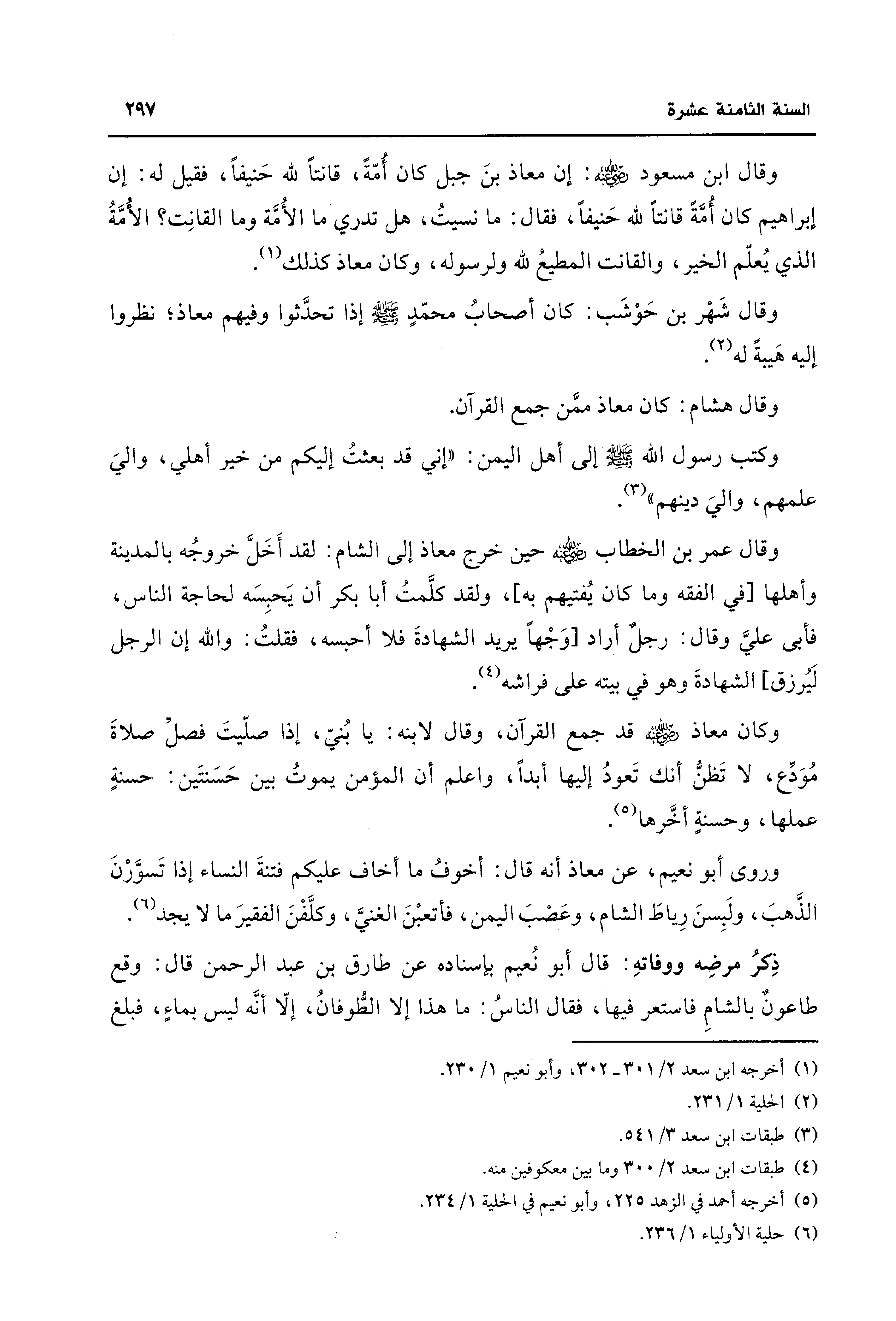 وقال ابن مسعود -رضي اللَّه عنه-: إن معاذ بنَ جبل كان أُمّةً، قانتًا للَّه حَنيفًا، فقيل له: إن إبراهيم كان أُمَّة قانتًا للَّه حَنيفًا، فقال: ما نسيتُ، هل تدري ما الأُمَّة وما القانِت؟ الأُمَّةُ الذي يُعلّم الخير، والقانت المطيعُ للَّه ولرسوله، وكان معاذ كذلك (¬1).
