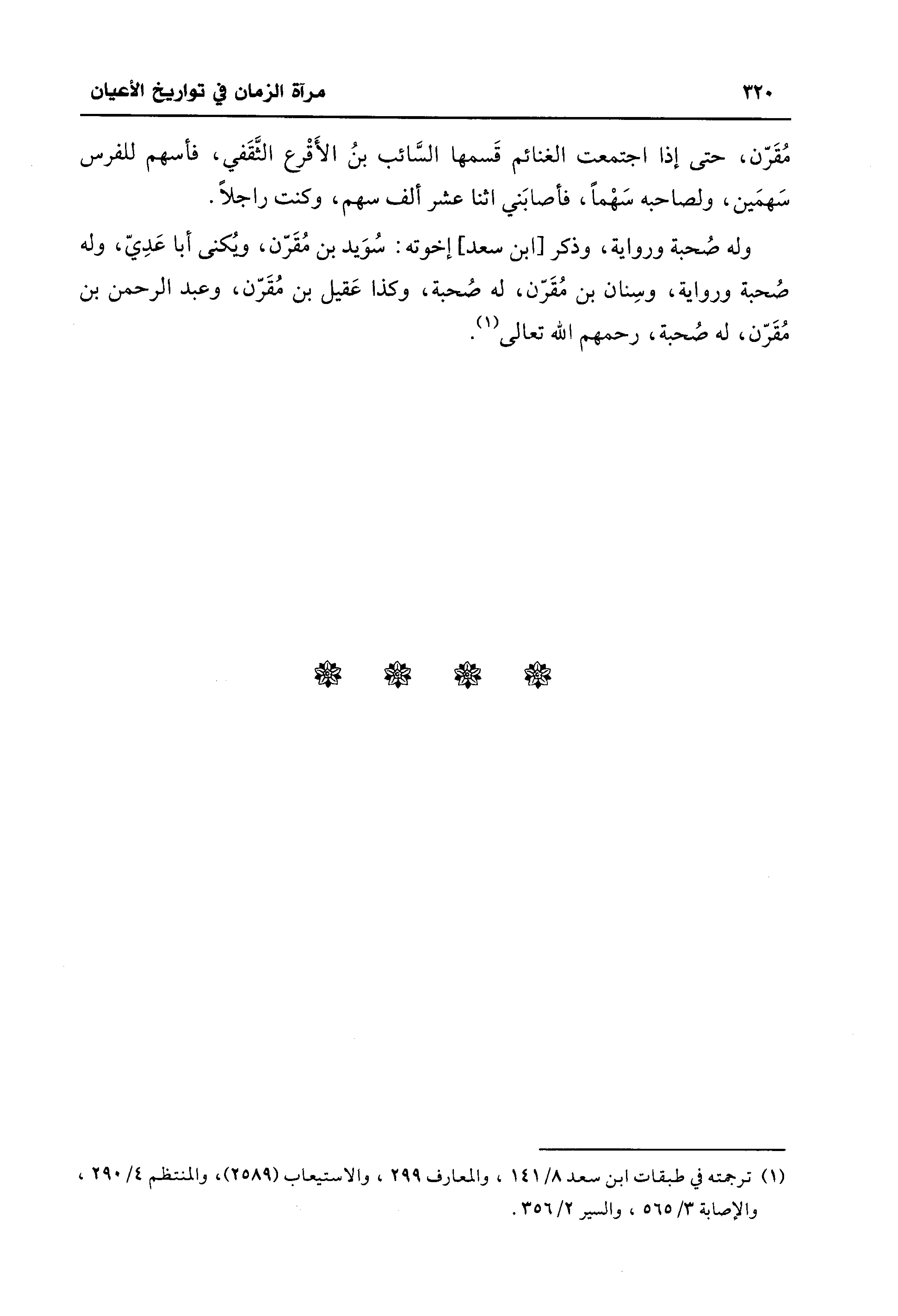 وله صُحبة ورواية, وذكر [ابن سعد] إخوته: سُوَيد بن مُقَرّن، ويُكنى أَبا عَدِيّ، وله صُحبة ورواية, وسِنان بن مُقَرّعا، له صُحبة، وكذا عَقيل بن مُقَرّن، وعبد الرحمن بن مُقَرّن، له صُحبة، رحمهم اللَّه تعالى (¬1).