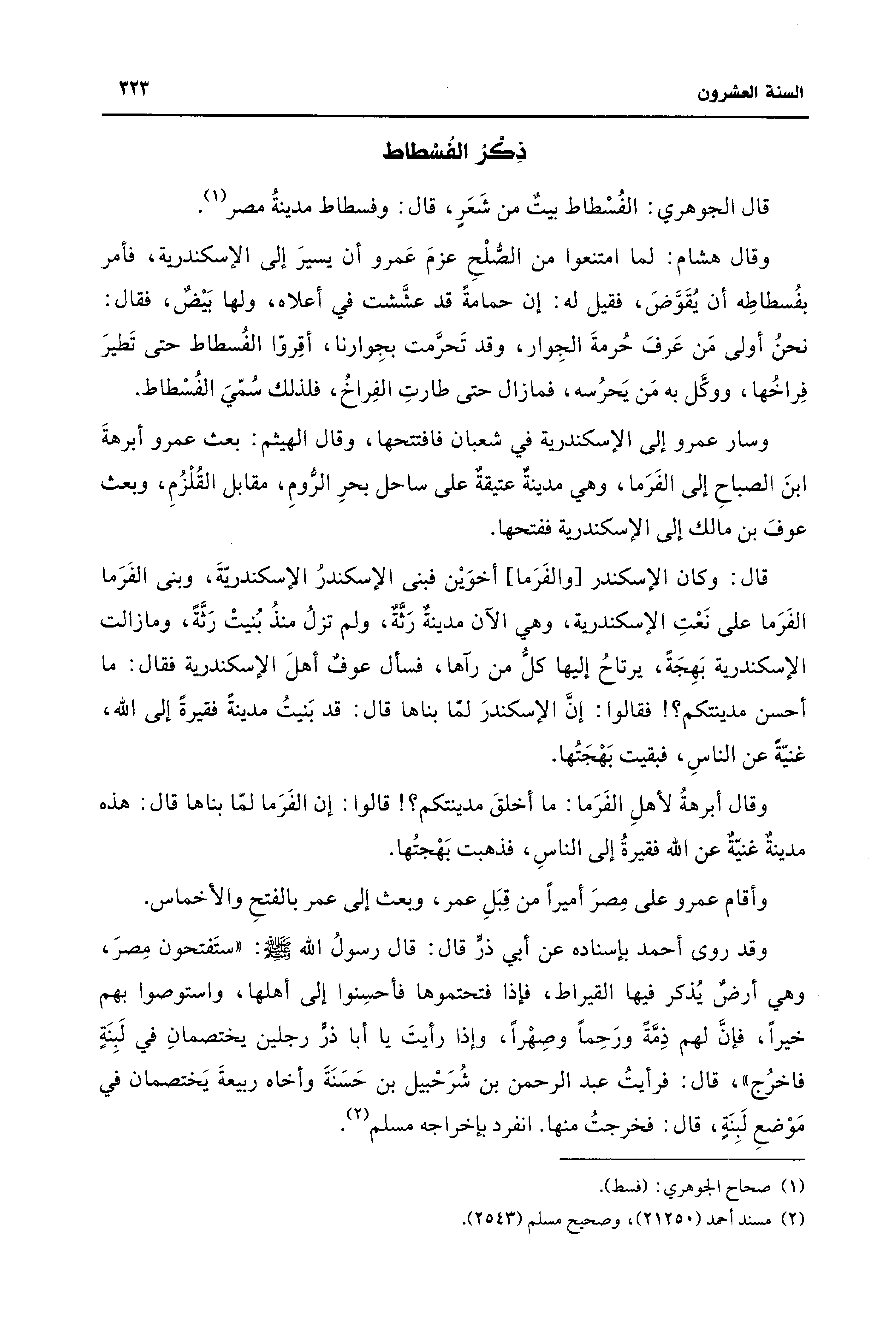 وقد روى أحمد بإسناده عن أبي ذرٍّ قال: قال رسولُ اللَّه -صلى اللَّه عليه وسلم-: "ستَفتحون مِصرَ، وهي أرضٌ يُذكر فيها القيراط، فإذا فتحتموها فأحسِنوا إلى أهلها، واستوصوا بهم خيرًا، فإنَّ لهم ذِمَّةً ورَحِمًا وصِهْرًا، وإذا رأيتَ يَا أَبا ذرٍّ رجلين يختصمانِ في لَبِنَةٍ فاخرُج"، قال: فرأيتُ عبد الرحمن بن شُرَحْبيل بن حَسَنَةَ وأخاه ربيعةَ يَختصمان في مَوْضعِ لَبِنَةٍ، قال: فخرجتُ منها. انفرد بإخراجه مسلم (¬2).