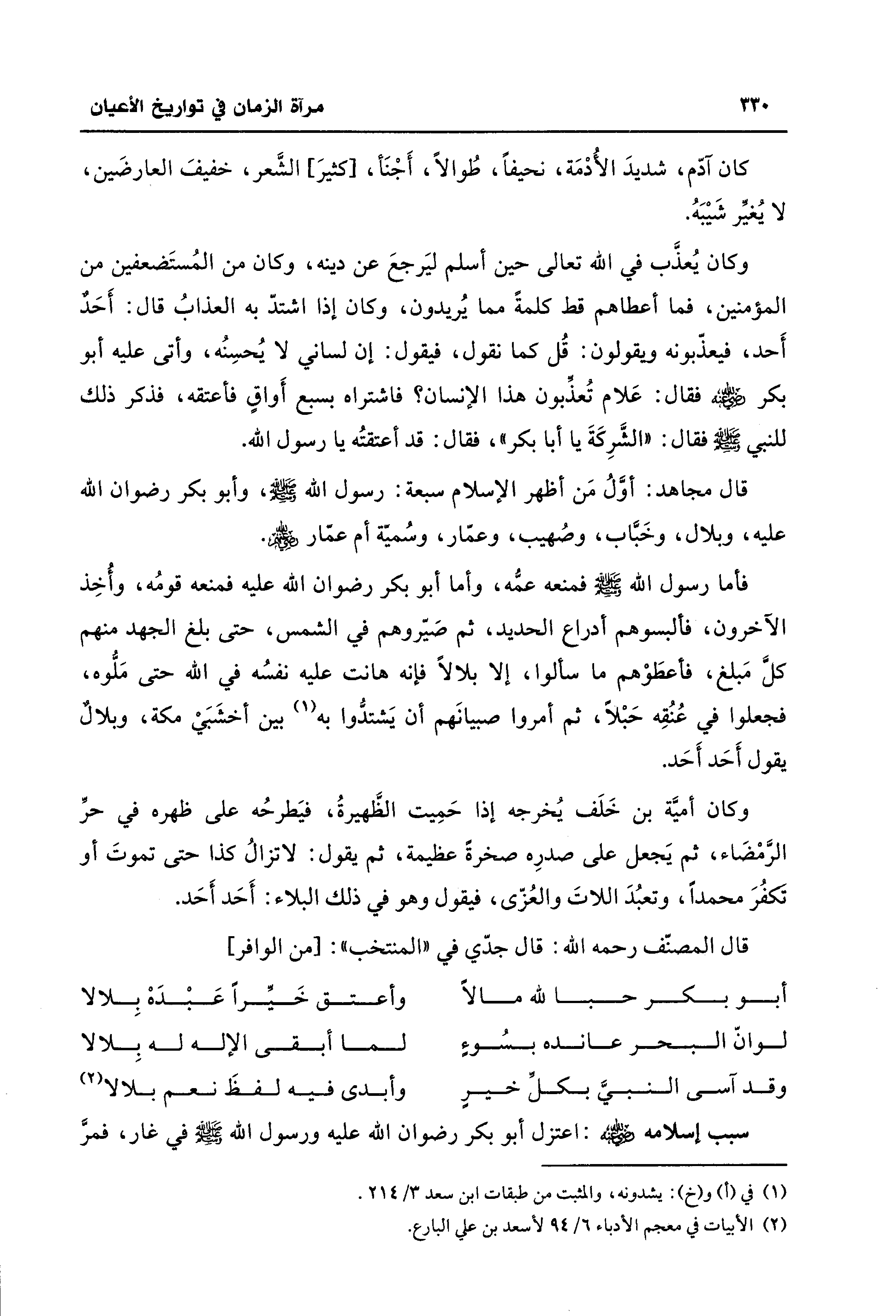 وكان أميَّة بن خَلَف يُخرجه إذا حَمِيت الظَّهيرةُ، فيَطرحُه على ظهره في حرِّ الرَّمْضَاء، ثم يَجعل على صدرِه صخرة عظيمة، ثم يقول: لا تزالُ كذا حتى تموتَ أو تكفُرَ محمدًا، وتعبُدَ اللاتَ والعُزّى، فيقول وهو في ذلك البلاء: أَحَد أَحَد.