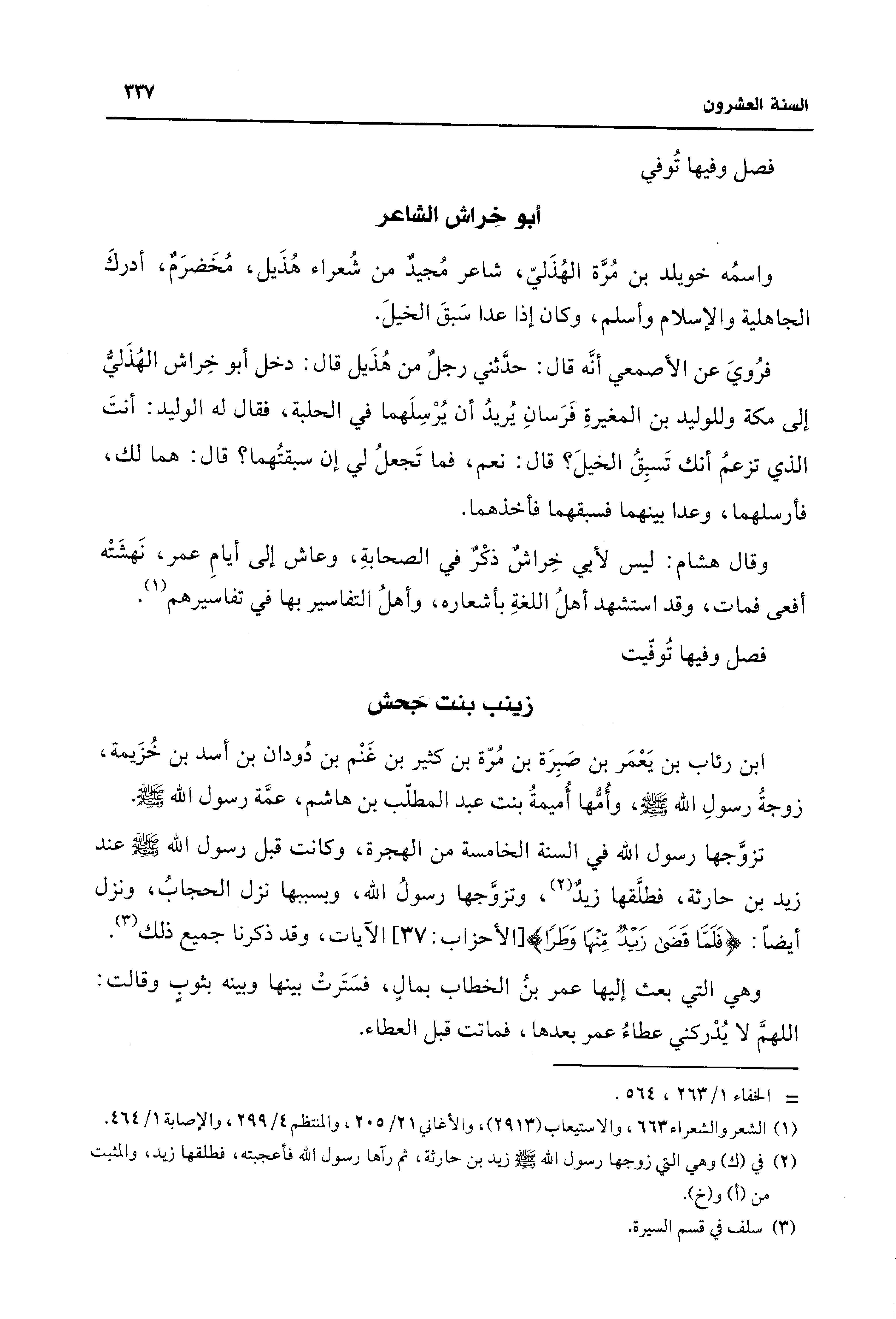 وقال هشام: ليس لأبي خِراشٌ ذكْرٌ في الصحابةِ، وعاش إلى أيامِ عمر، نَهشَتْه أفعى فمات، وقد استشهد أهلُ اللغةِ بأشعاره، وأهلُ التفاسير بها في تفاسيرهم (¬1).