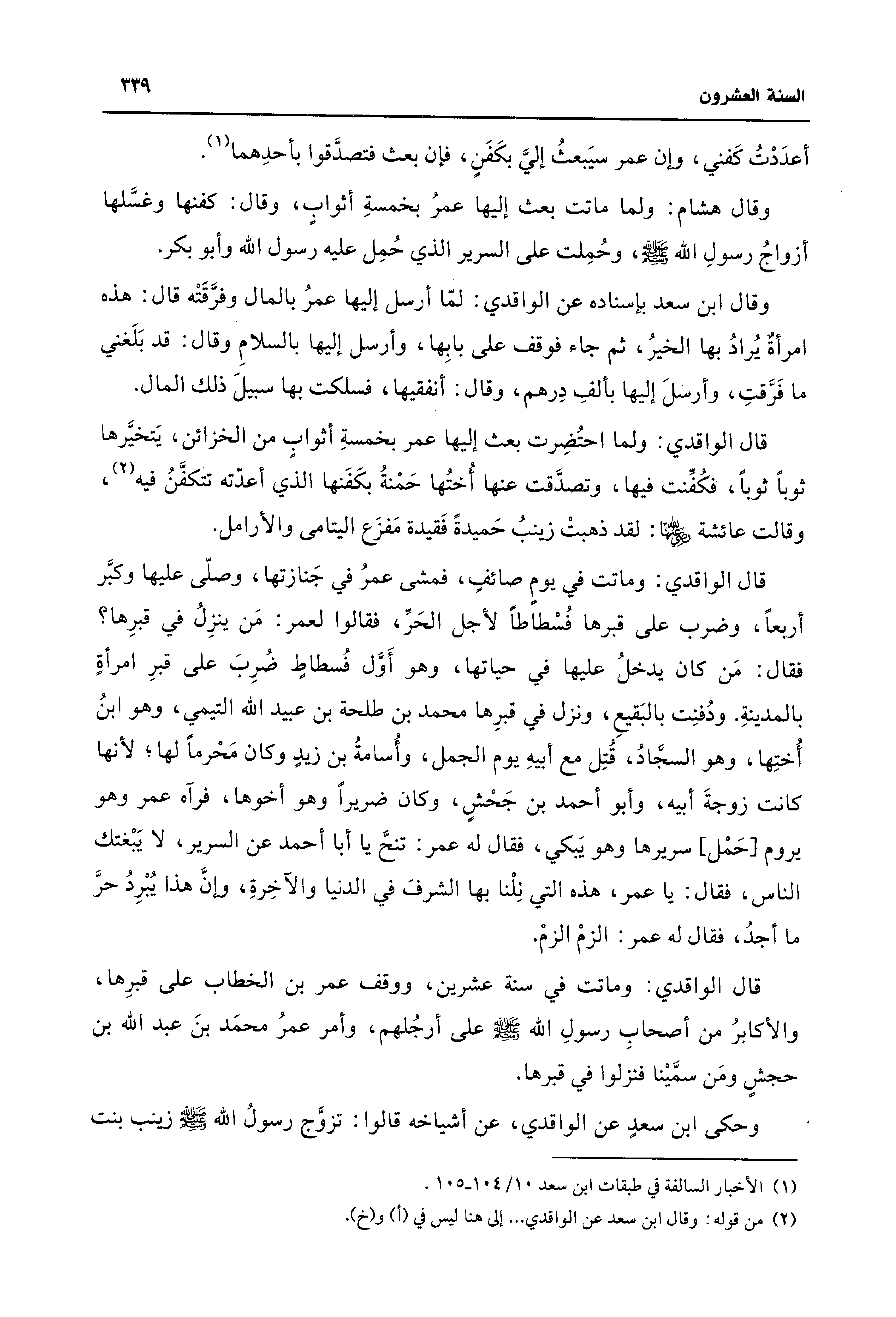 وقال هشام: ولما ماتت بعث إليها عمرُ بخمسةِ أثوابٍ، وقال: كفنها وغسَّلها أزواجُ رسولِ اللَّه -صلى اللَّه عليه وسلم-، وحُمِلت على السرير الذي حُمِل عليه رسول اللَّه وأبو بكر.