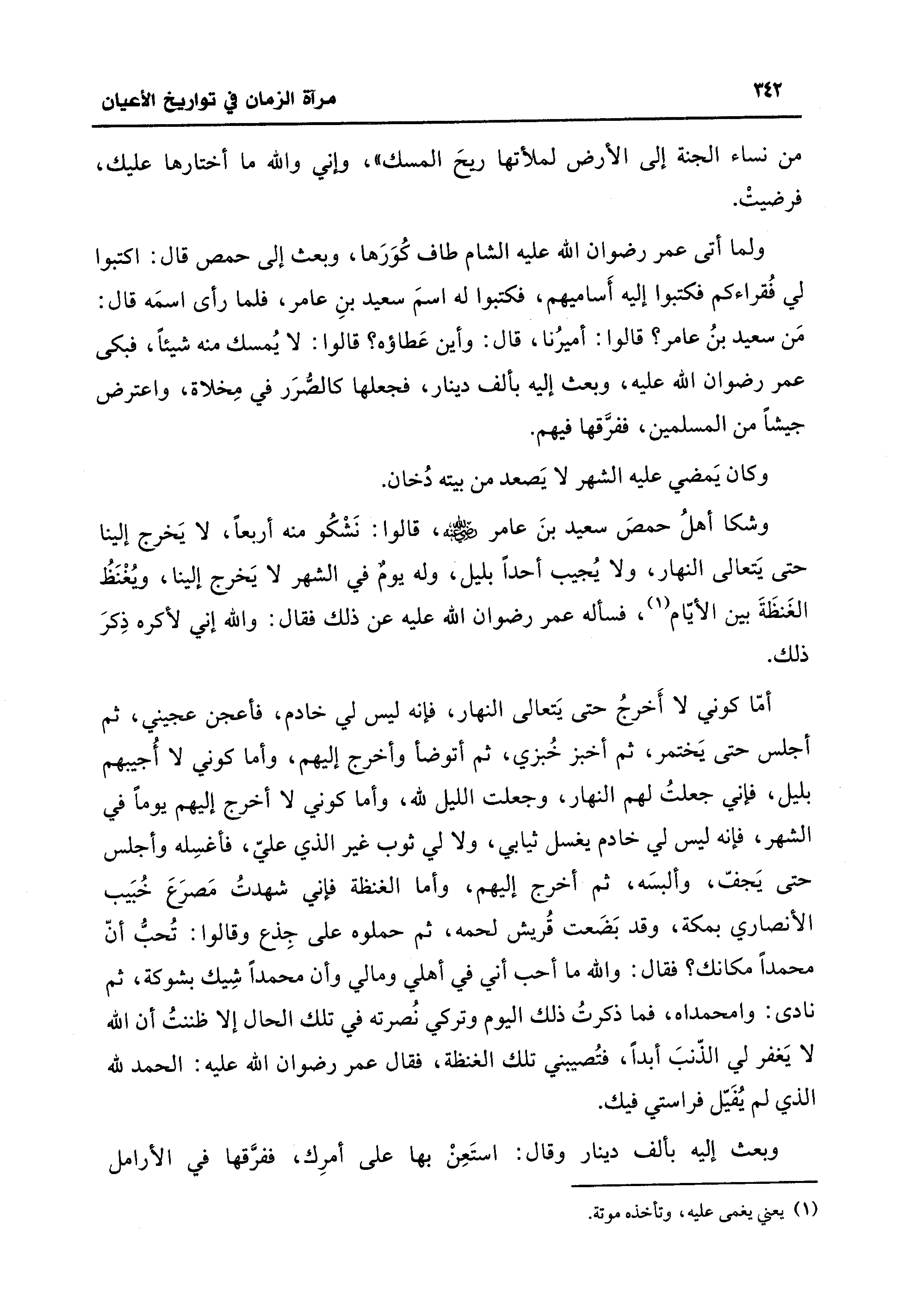 ولما أتى عمر رضوان اللَّه عليه الشام طاف كُوَرَها، وبعث إلى حمص قال: اكتبوا لي فُقراءكم فكتبوا إليه أَساميهم، فكتبوا له اسمَ سعيد بنِ عامر، فلما رأى اسمَه قال: مَن سعيد بنُ عامر؟ قالوا: أميرُنا، قال: وأين عَطاؤه؟ قالوا: لا يُمسك منه شيئًا، فبكى عمر رضوان اللَّه عليه، وبعث إليه بألف دينار، فجعلها كالصُّرَر في مِخلاة، واعترض جيشًا من المسلمين، ففرَّقها فيهم.