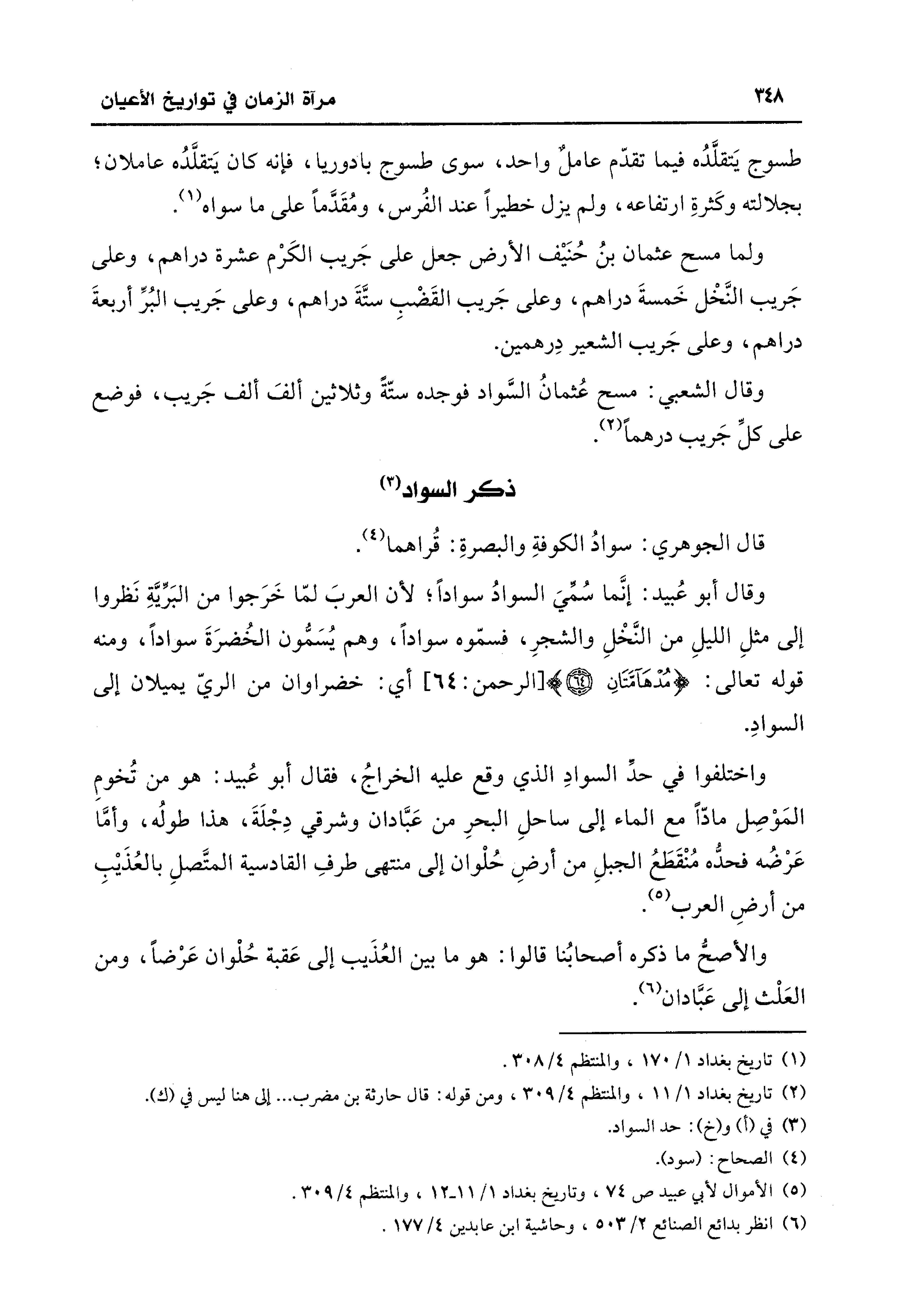 واختلفوا في حدِّ السوادِ الذي وقع عليه الخراجُ، فقال أبو عُبيد: هو من تُخومِ المَوْصِل مادًّا مع الماء إلى ساحلِ البحرِ من عَبَّادان وشرقي دِجْلَةَ، هذا طولُه، وأمَّا عَرْضُه فحدُّه مُنْقَطَعُ الجبلِ من أرضِ حُلْوان إلى منتهى طرفِ القادسية المتَّصلِ بالعُذَيْبِ من أرضِ العرب (¬5).